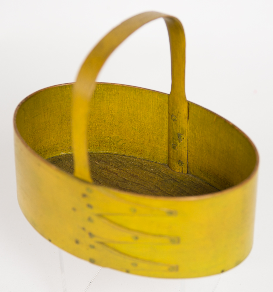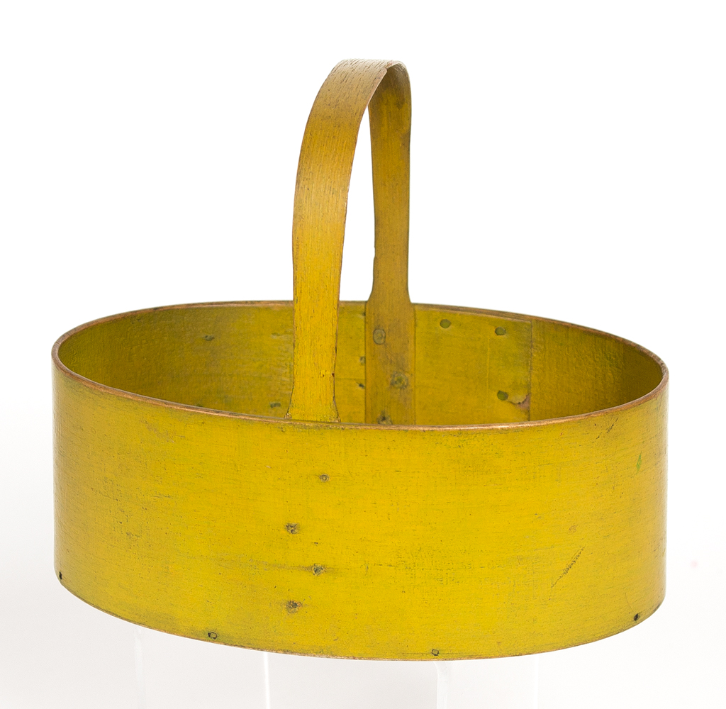 Maple and pine, old chrome over original yellow painted finish, hickory fixed handle, attached on inside with small copper tacks, three long elegant fingers with small copper tacks, very good condition, c. 1840, 2 3/8″ h (to rim), 5″ h (to top of handle), 6 3/8″ l.