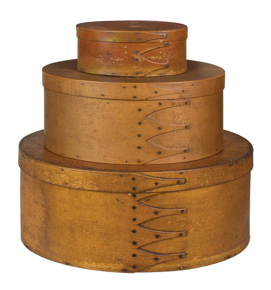 Maple and pine, original ochre stained finish with varnish, some wear to finish, three fingers, small copper tacks, 2 1/4″ h, 6″ l; Maple and pine, original light ochre stained finish, four fingers, small copper tacks, overall good condition with minor wear, 4 1/4″ h, 10″ l; Maple and pine, original ochre finish with varnish, some wear to finish, five fingers, copper tacks, overall good condition, 5 1/4″ h, 13″ l.