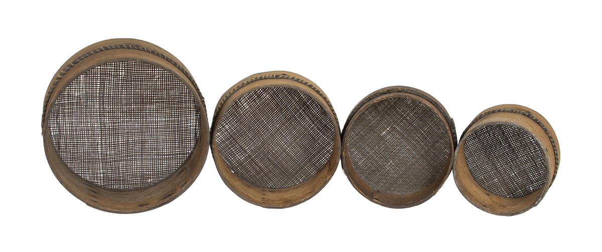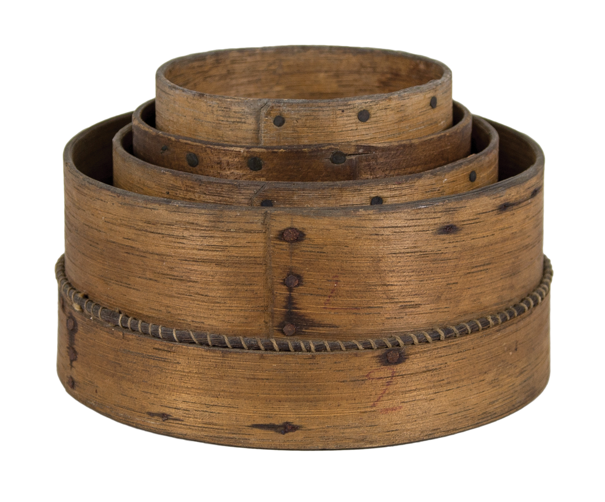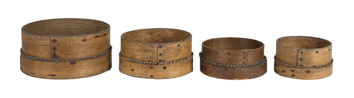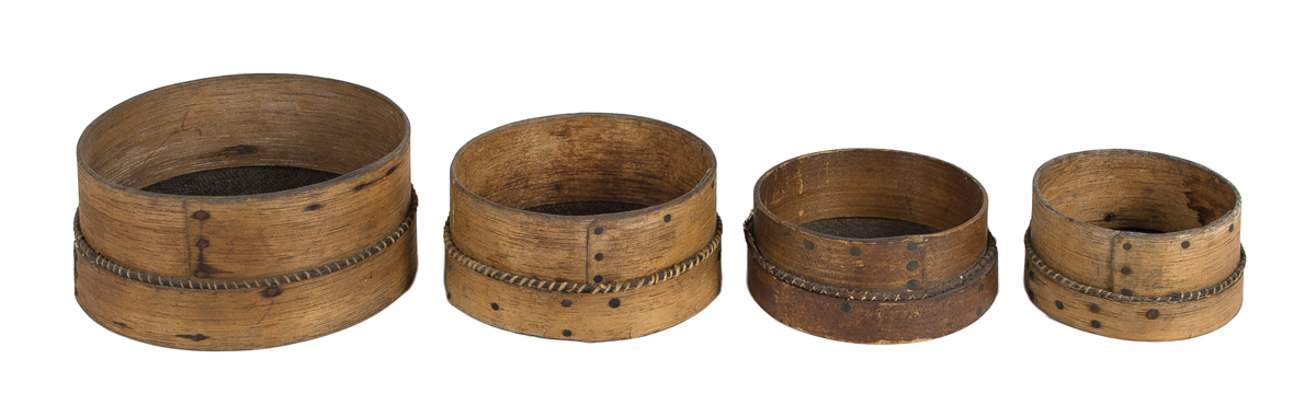 Black ash, copper and steel tacks, woven horsehair, original natural finish, graduated sizes 5″, 4″, 3 1/2″ and 3″ dia, found in Connecticut, (note: rare to find a graduated set of sieves used in the herb and seed industries), c. 1850-1860, possibly used at Enfield, CT, good overall condition.