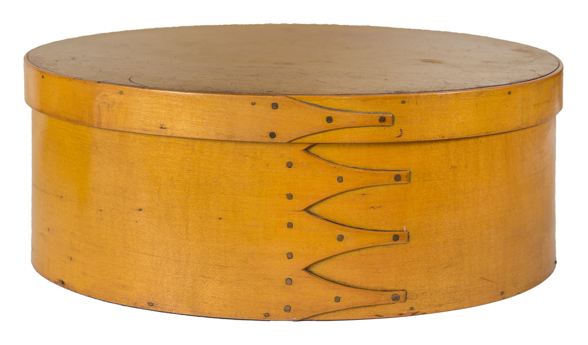 Maple and pine, original chrome yellow varnished wash/stain, four fingers finely formed, copper tacks and points, overall excellent condition, 5 1/2″ h, 14 3/4″ l, 10 3/4″ d, (ex. Flo and Howard Fertig collection).