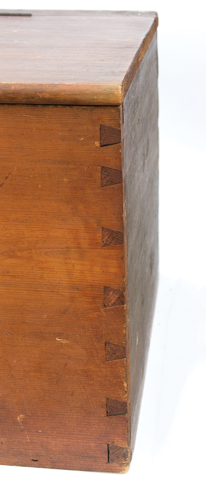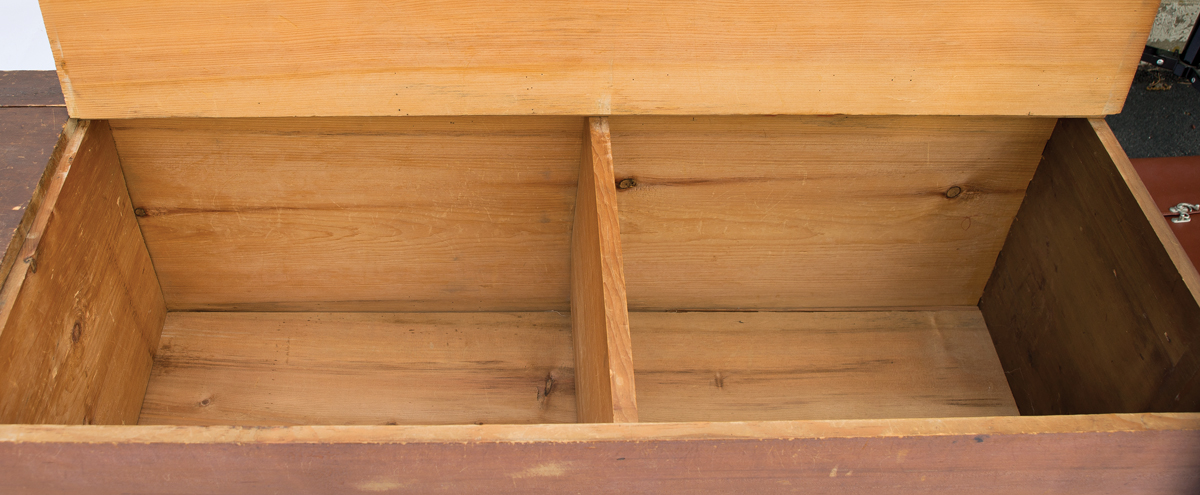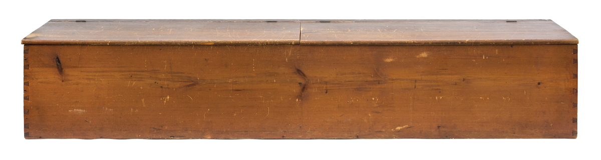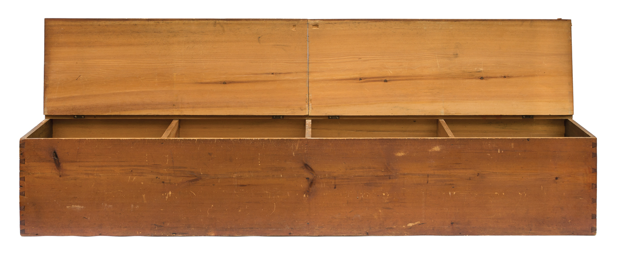 Pine, original dark stained finish with patina, hinged double lift lid, four sectioned interior, dovetailed case, 16 1/2″ h, 88″ l, 19″ d, (ex. John Roberts collection, Shaker Farm, Canaan, NY, sold WHA 8/5/90, lot 162; ex. Kippy Stroud collection).