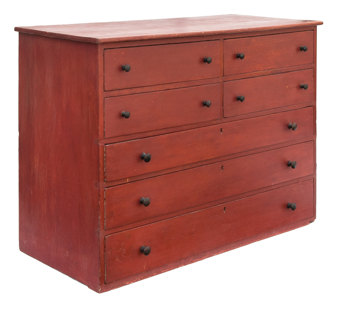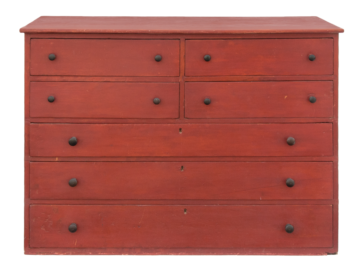 Pine, traces of original red with an overpainted red finish, single board top with rounded front edge, two flanking dovetailed drawers, over two similar drawers, over three graduated drawers, turned hardwood pulls, three board horizontal back, symmetrically nailed, c. 1840, 34″ h, 47 1/4″ w, 20 1/2″ d.