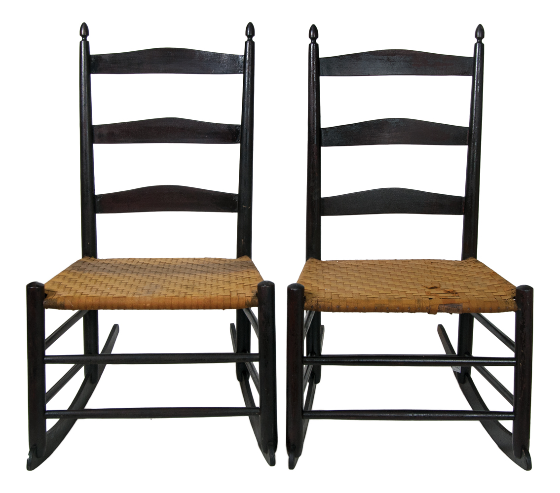 Maple, original ebony stained finish, acorn finials, three finely shaped slats, original rare Shaker golden yellow linen/wool taped seats, both with original Mt. Lebanon decals inside the right rockers, “3” stamped on back of top slat, c. 1880-1890, 15″ seat h, 34″ overall h.