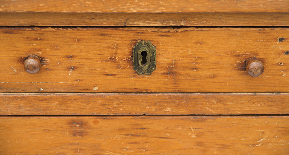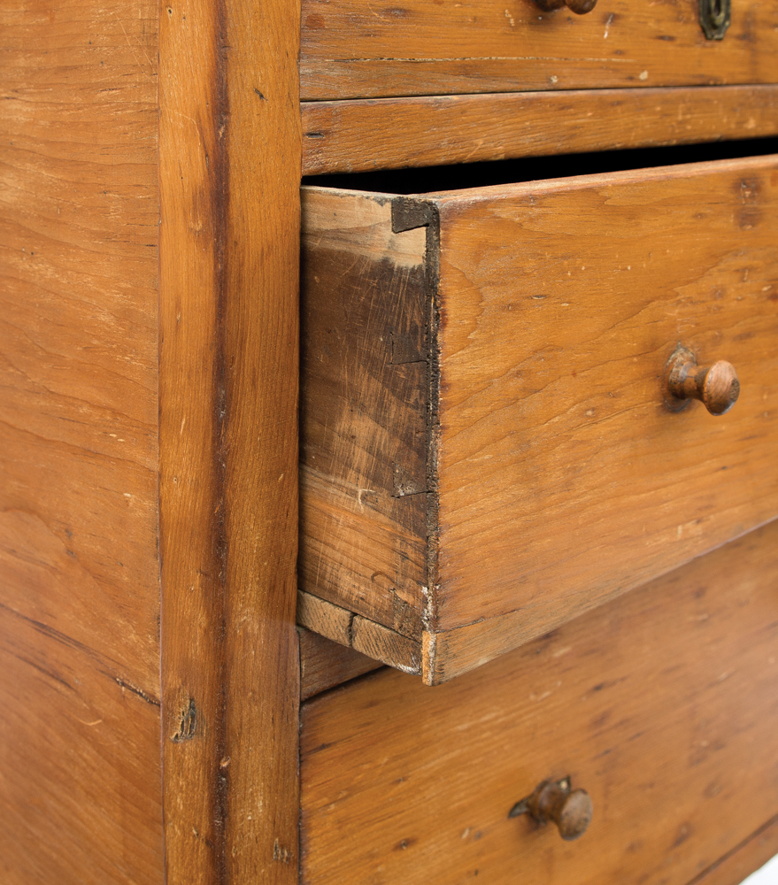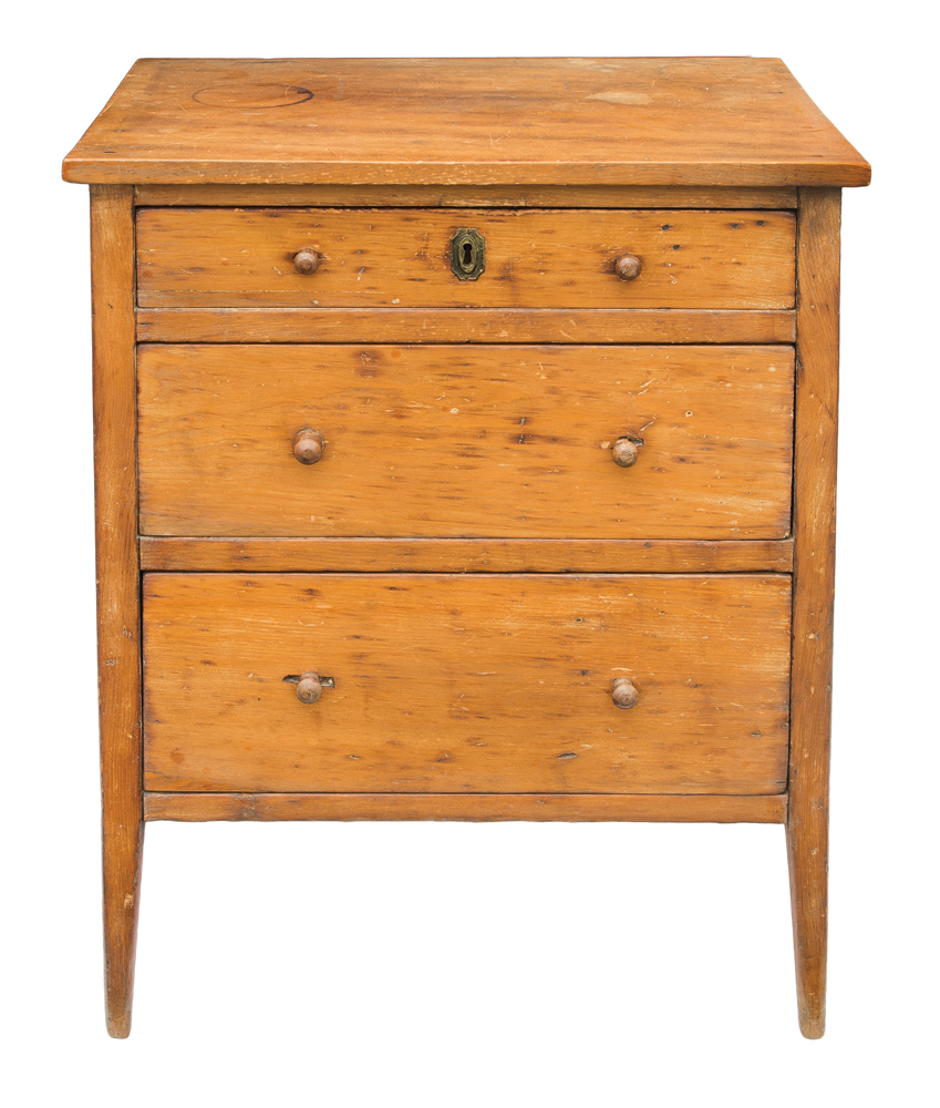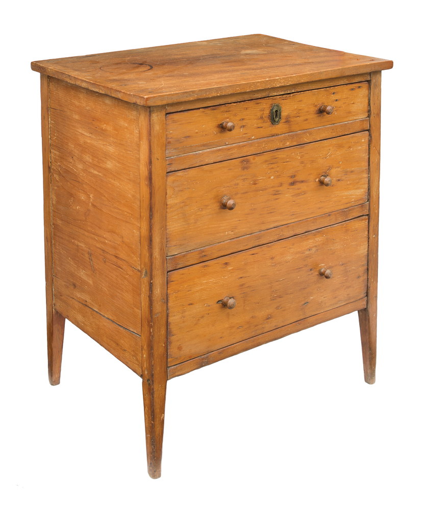 Pine, old refinish, slight traces of original red, simple single board top over three dovetailed and graduated drawers, turned wood pulls, brass escutcheon plate, squared and tapered legs, c. 1850, 27 3/4″ h, 23 1/4″ w, 17″ d.