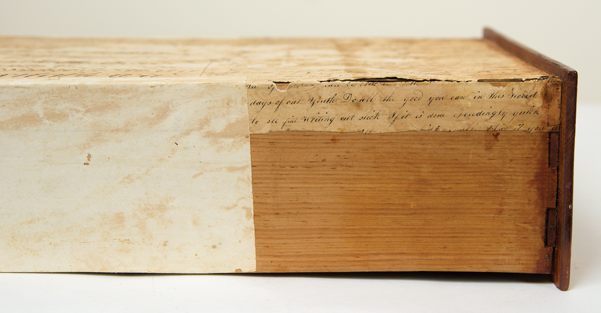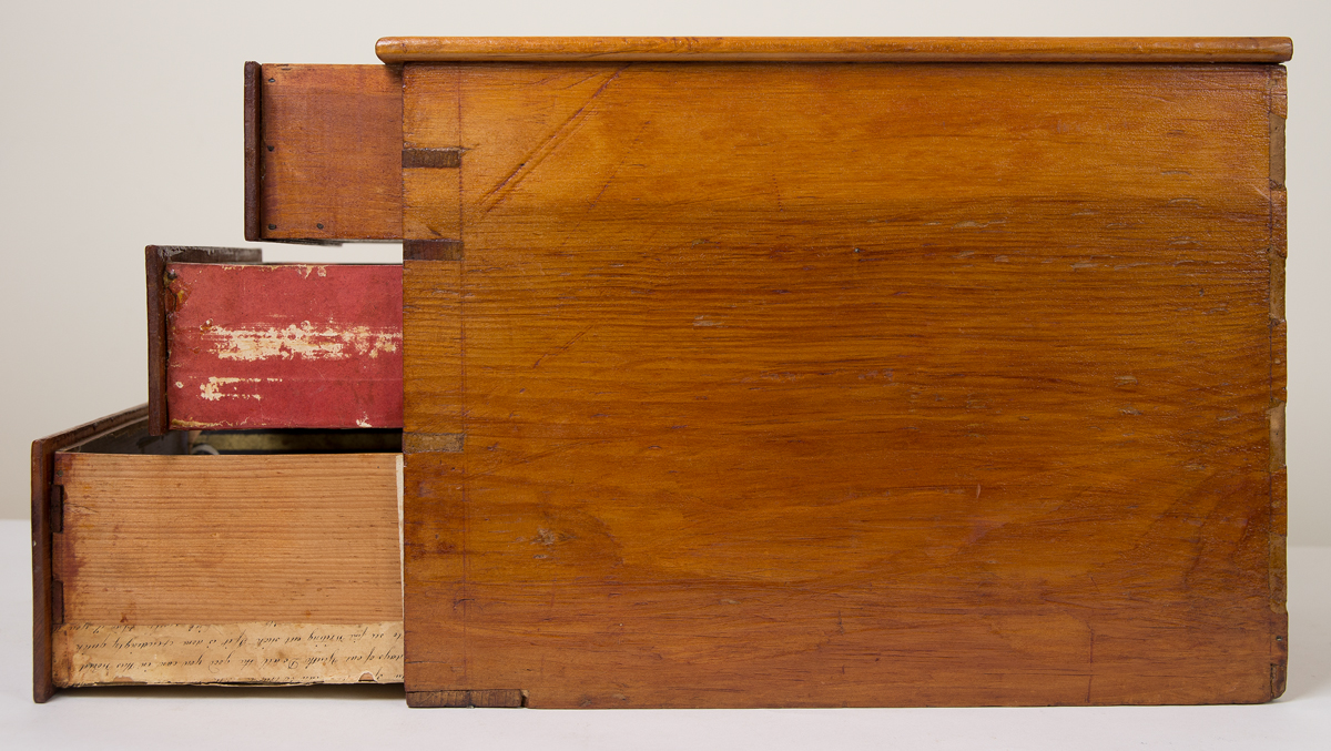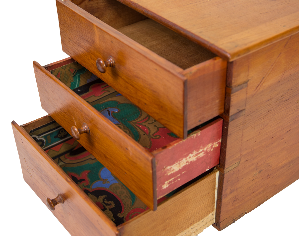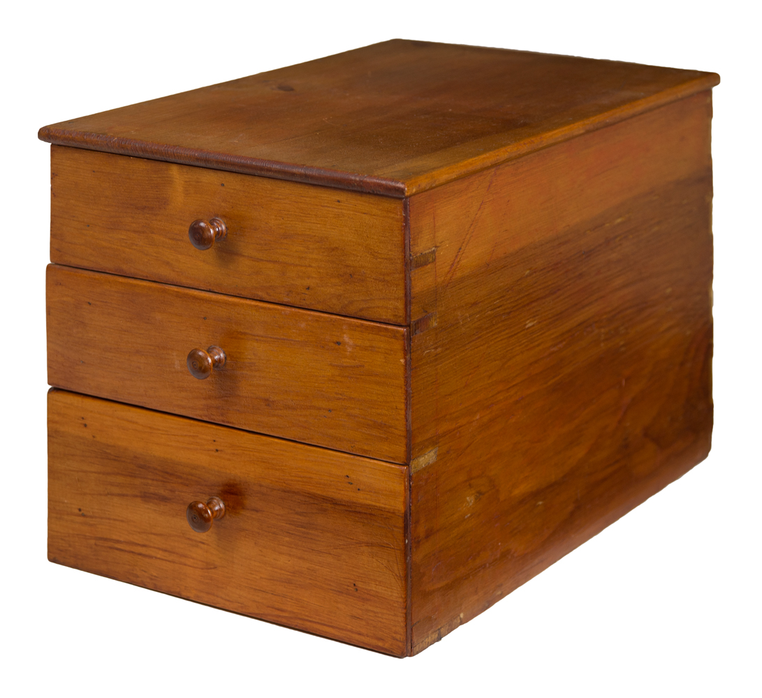 Pine, traces of original red stained varnish finish, three graduated and lipped drawers, original cherry pulls with tiny circle indent in center of each (Canterbury, NH), wallpaper covered interior on bottom two drawers, and a manuscript calligraphy workbook and notes from Canterbury, “Do All the Good you Can in this World…”, dovetailed case, (note: top drawer appears to be originally conceived for two top drawers, but quickly changed over to a single drawer, other two drawers are dovetailed), inside top drawer is stamped in the back “G.A.M.” (the stamp for Dr. George A. Marks whose Shaker collection WHA sold in the 1980’s), 10″ h, 9 3/4″ w, 14 1/8″ d.