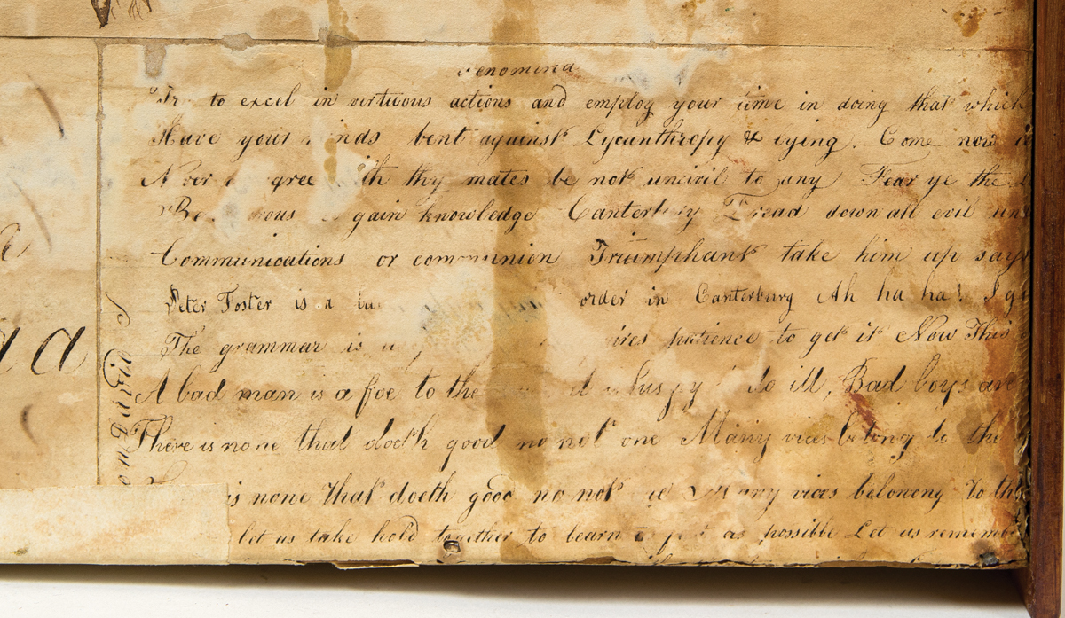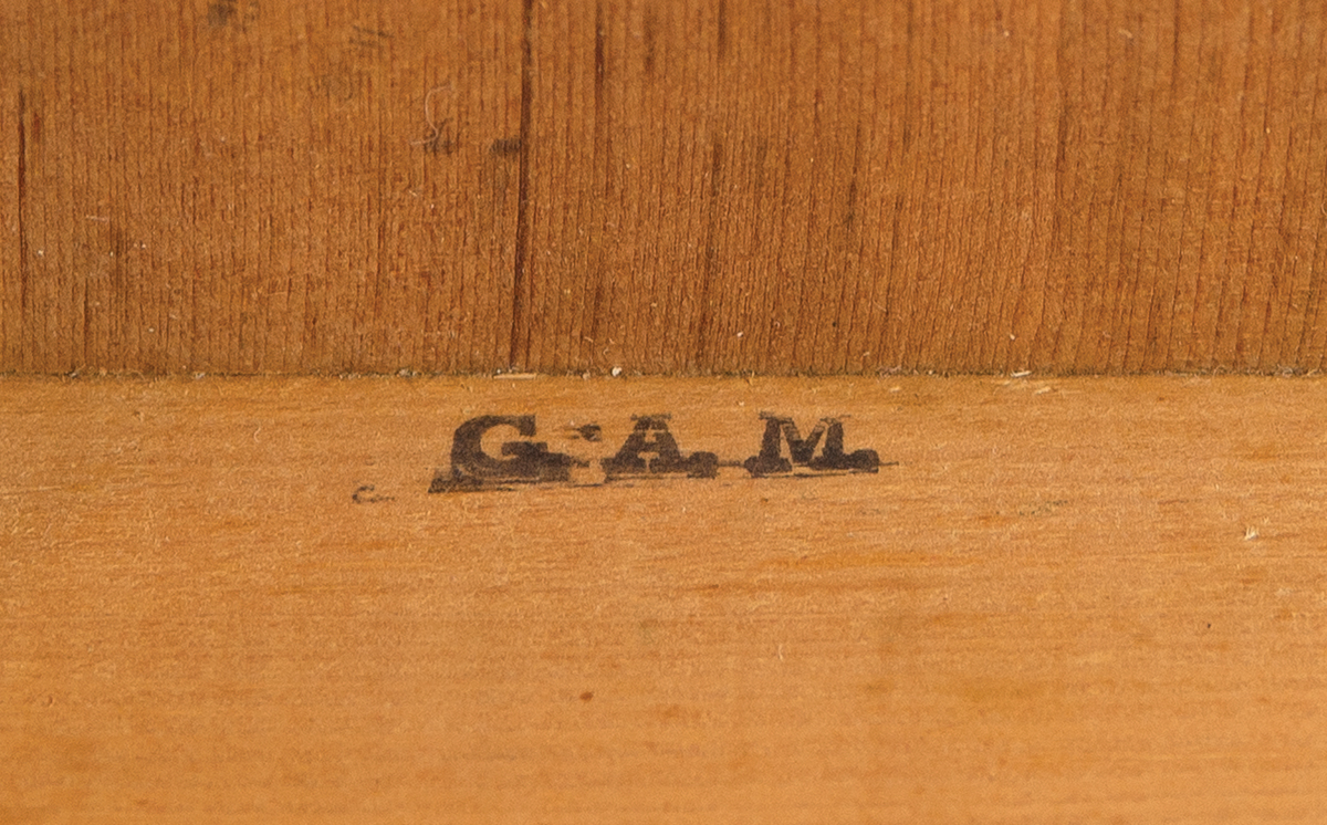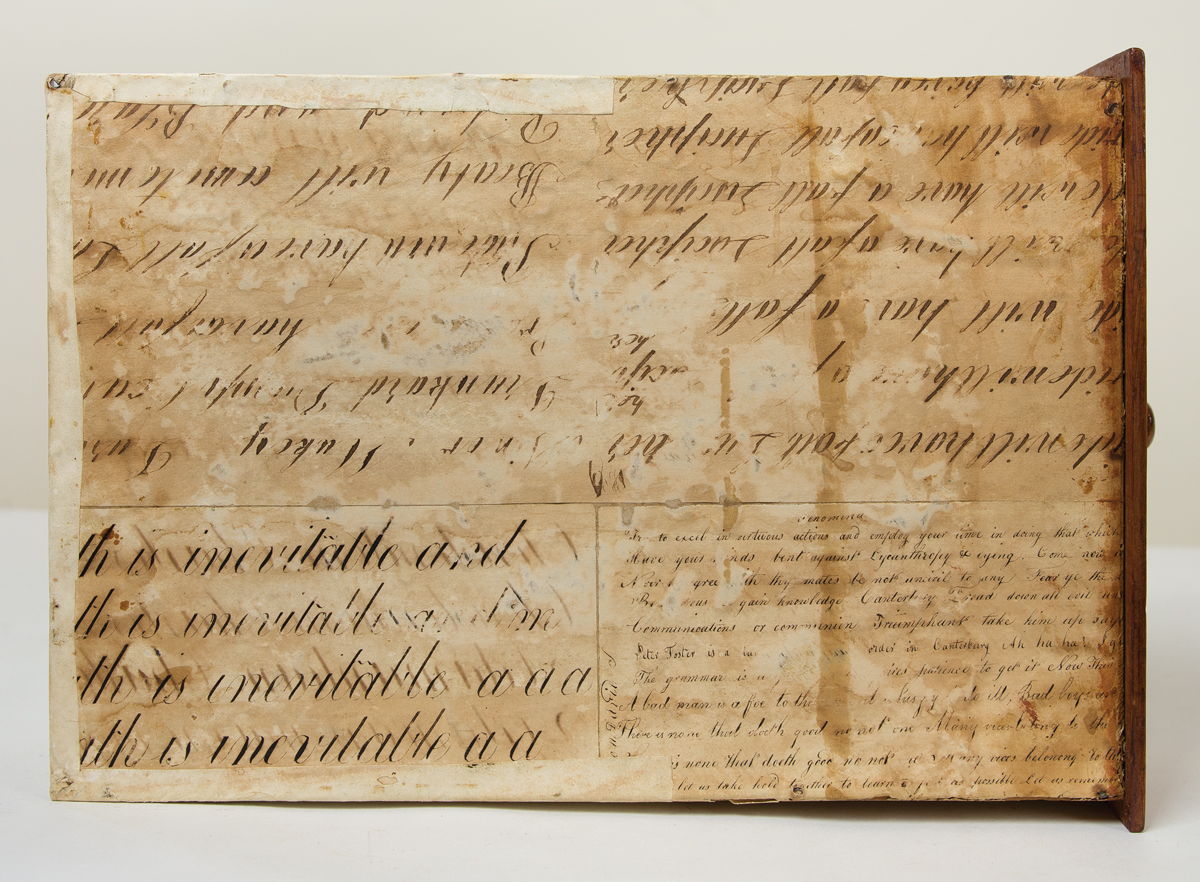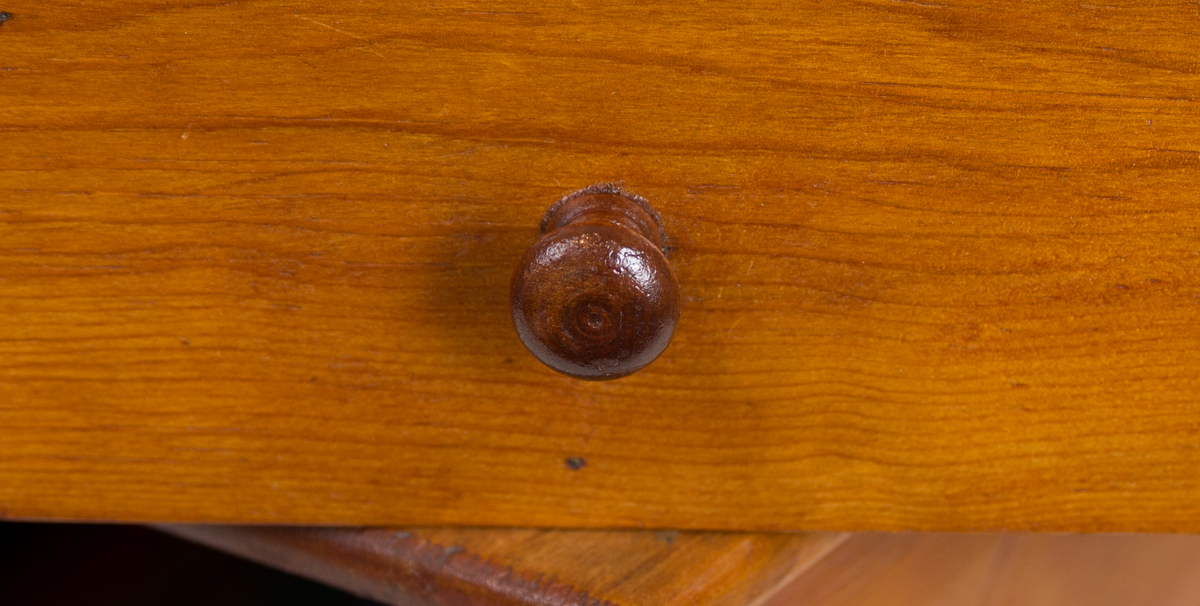 Pine, traces of original red stained varnish finish, three graduated and lipped drawers, original cherry pulls with tiny circle indent in center of each (Canterbury, NH), wallpaper covered interior on bottom two drawers, and a manuscript calligraphy workbook and notes from Canterbury, “Do All the Good you Can in this World…”, dovetailed case, (note: top drawer appears to be originally conceived for two top drawers, but quickly changed over to a single drawer, other two drawers are dovetailed), inside top drawer is stamped in the back “G.A.M.” (the stamp for Dr. George A. Marks whose Shaker collection WHA sold in the 1980’s), 10″ h, 9 3/4″ w, 14 1/8″ d.