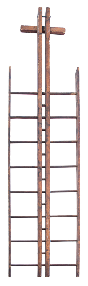 Pine, original natural finish with patina, rectangular rails with eight turned rungs high, seven wood dowels supporting center rails, extended cross bar with beveled edges at top, found near New Lebanon, NY, c. 1890, 11′ h, 30″ w.