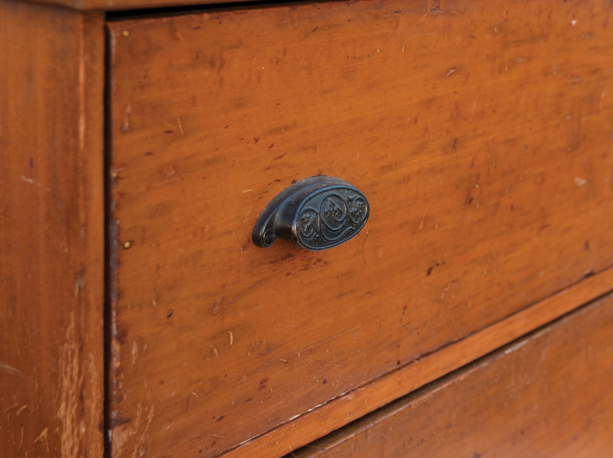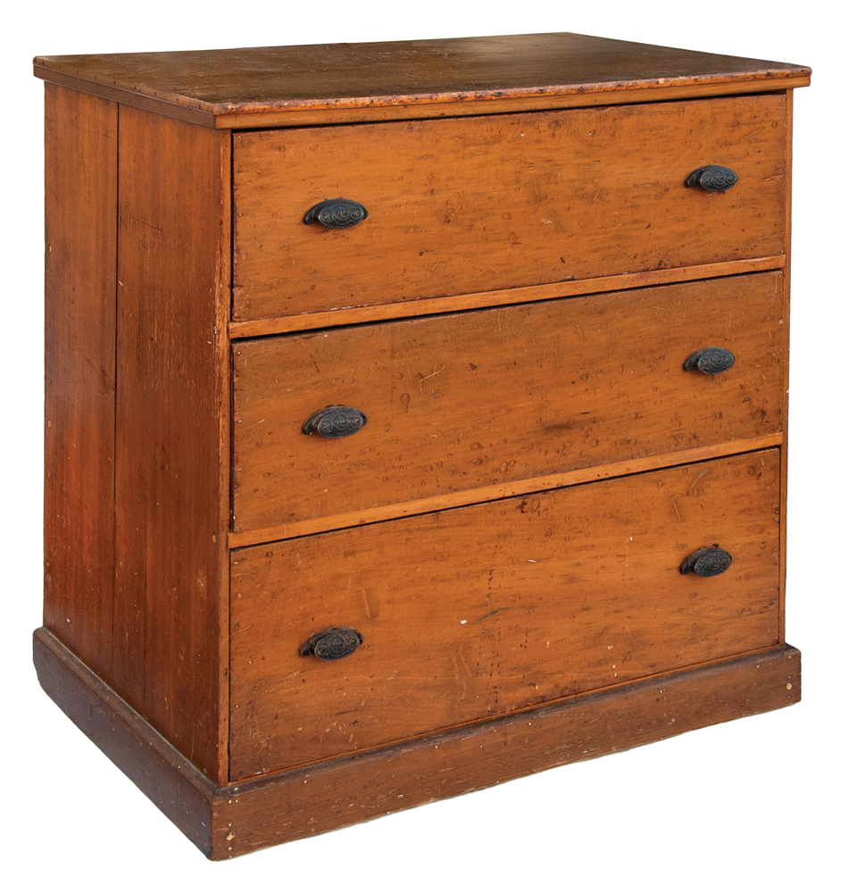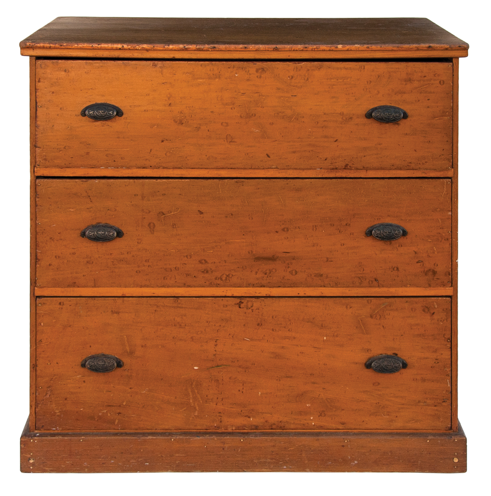 Poplar, original yellow/ochre wash, three graduated drawers, simple molded top board, symmetrically nailed construction, applied simple molded baseboard, original cast iron pulls, c. 1860, 35 1/4″ h, 35 1/4″ w, 22 1/2″ d.