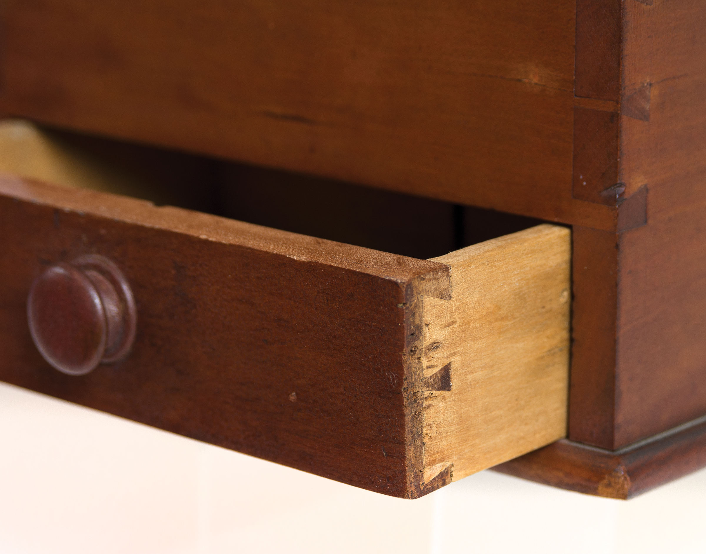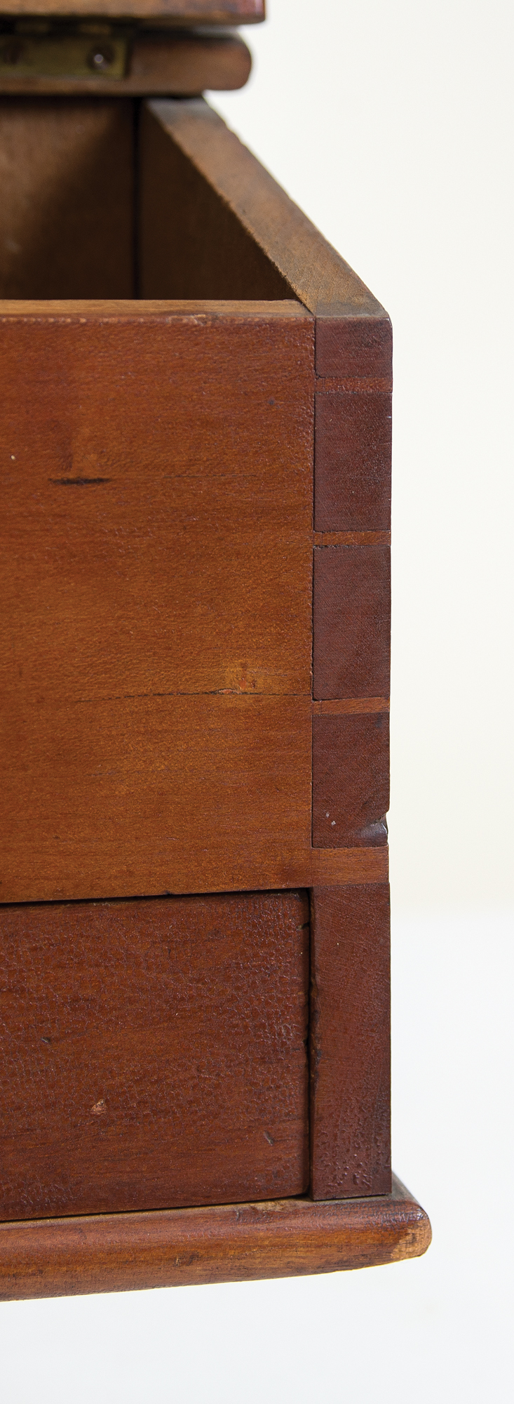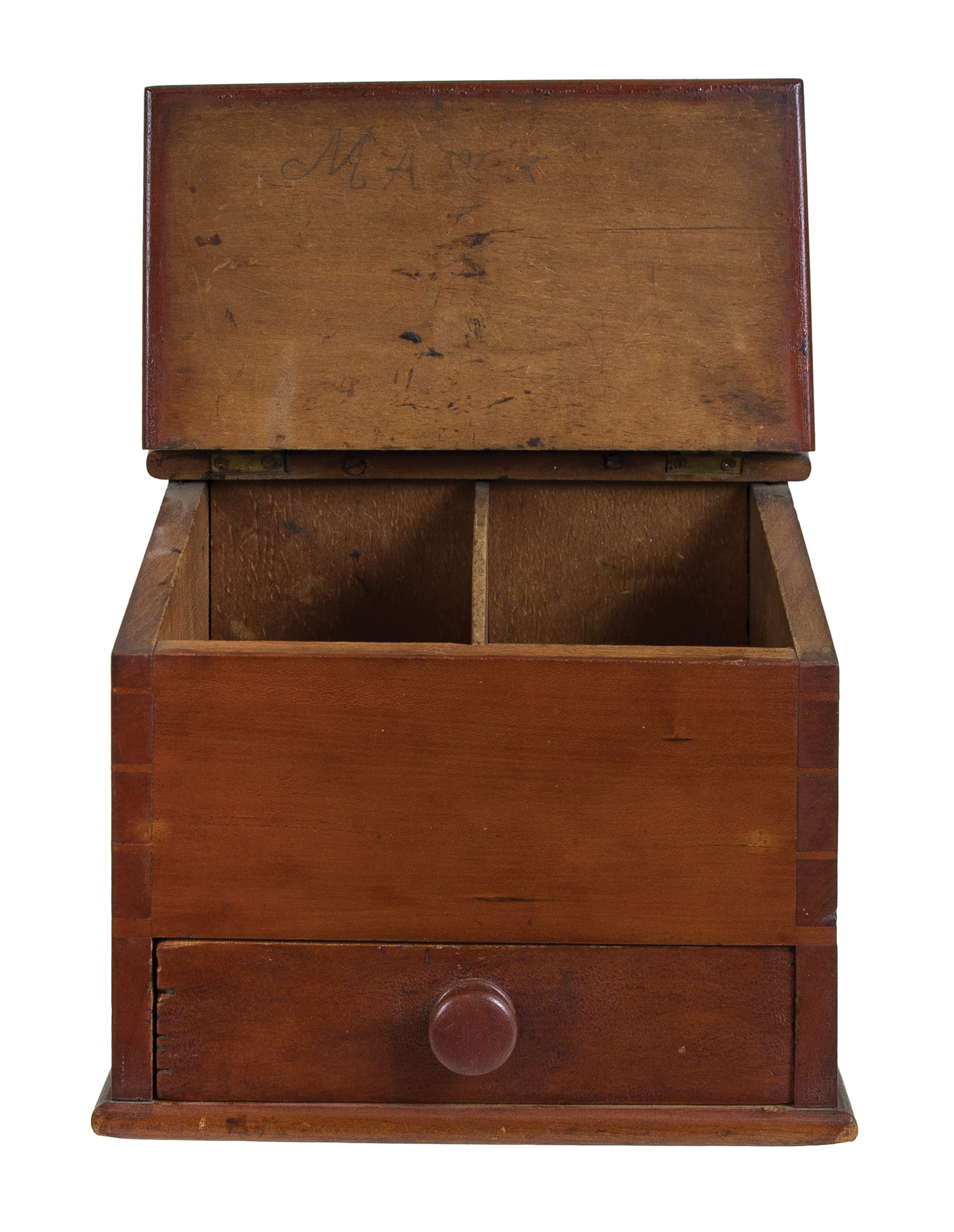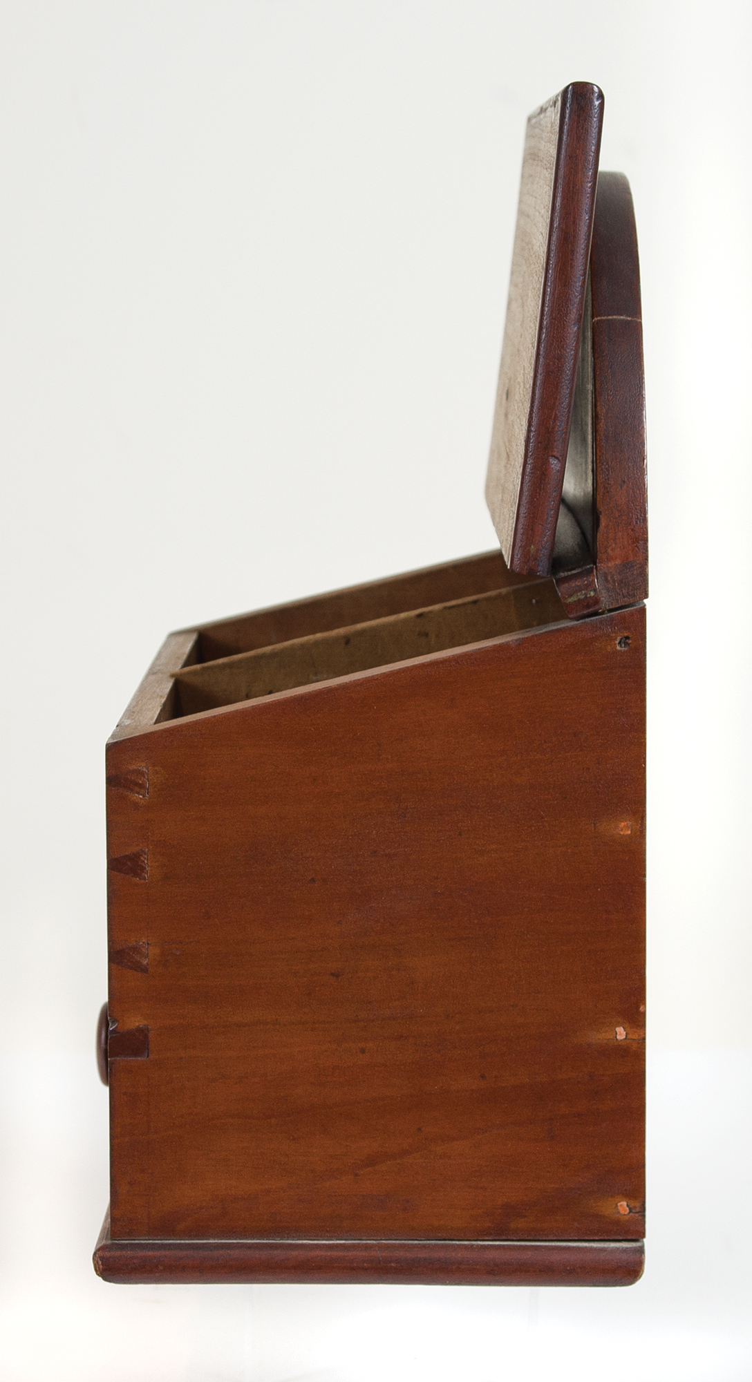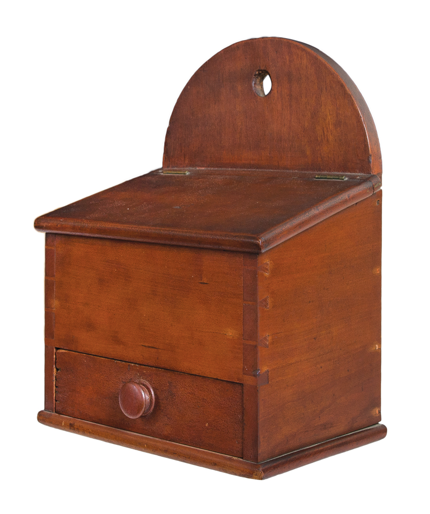 Cherry and pine, original stained varnish finish, tall raised arched backboard with cut out hole for peg, slanted brass hinged lid with finely beveled edges, opening to a two-section interior, dovetailed case, over a dovetailed drawer with walnut pull, beveled baseboard, (note: very fine mid-century Shaker craftsmanship), small repaired split in upper right of backboard, Harvard, MA, c. 1840-1850, 12″ h, 9″ w, 6″ d.