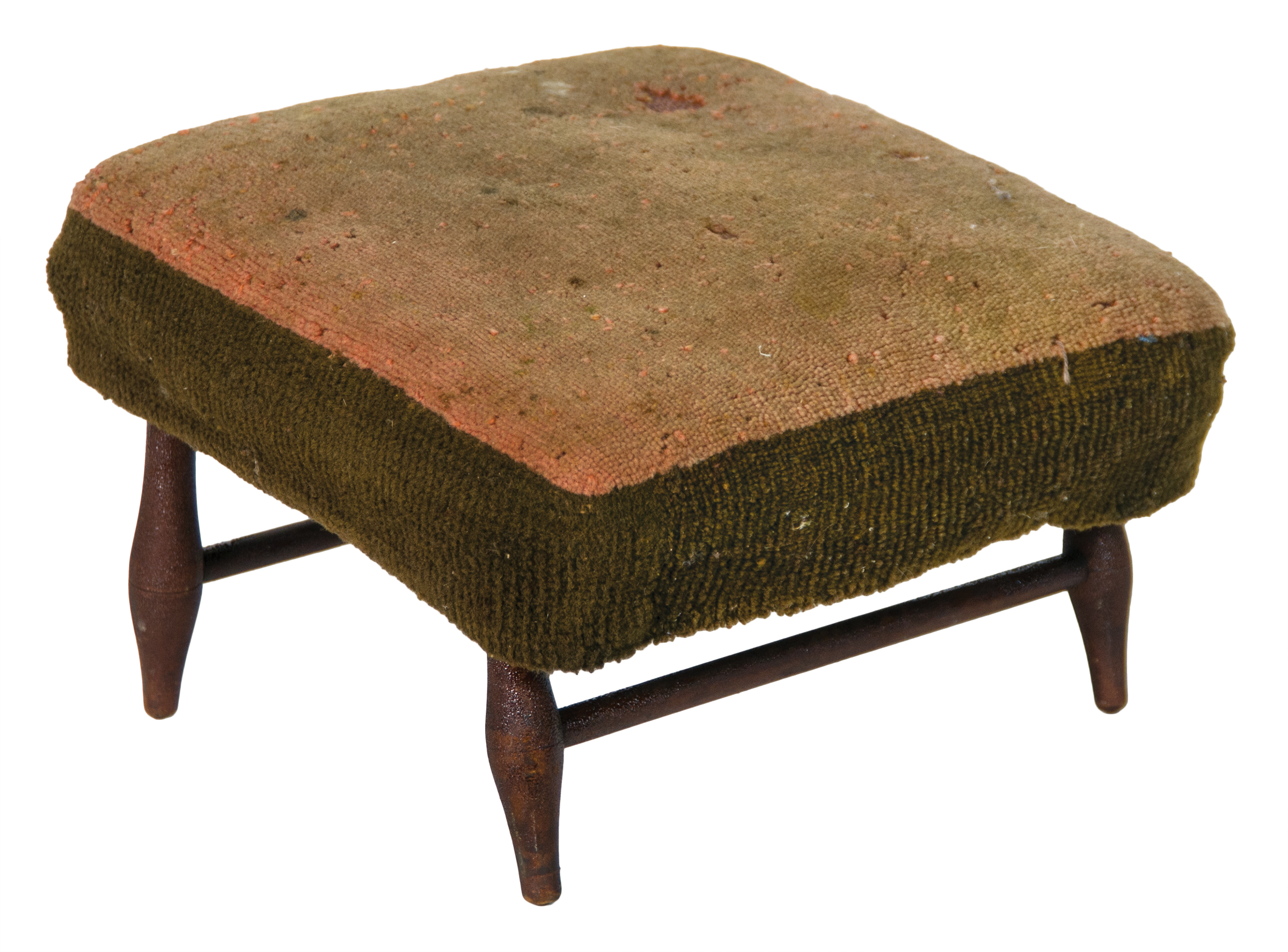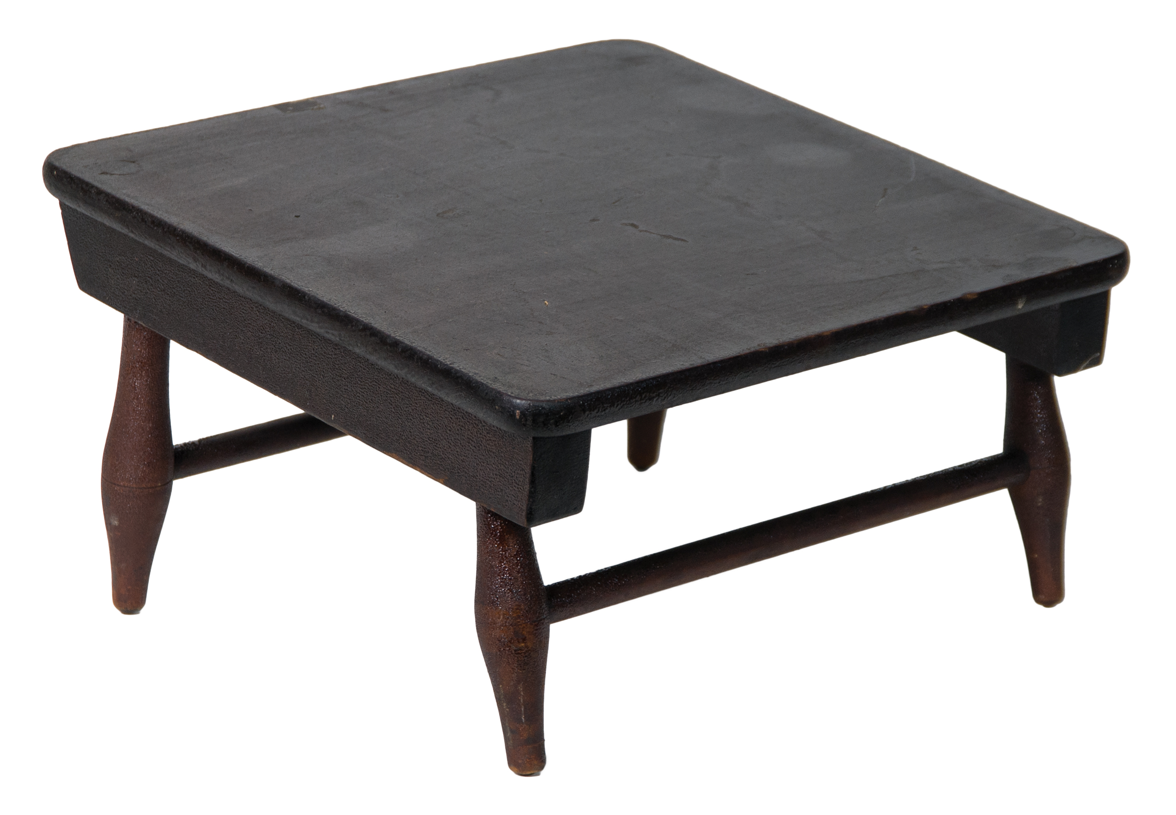 Maple, original ebony painted finish, original Mt. Lebanon decal under top, fitted with wool plush cover in pink/red and green, shows moth holes, four turned legs with medial swell and two side stretchers, 7″ h, 11 1/2″ sq, (ex. Brecht family collection).