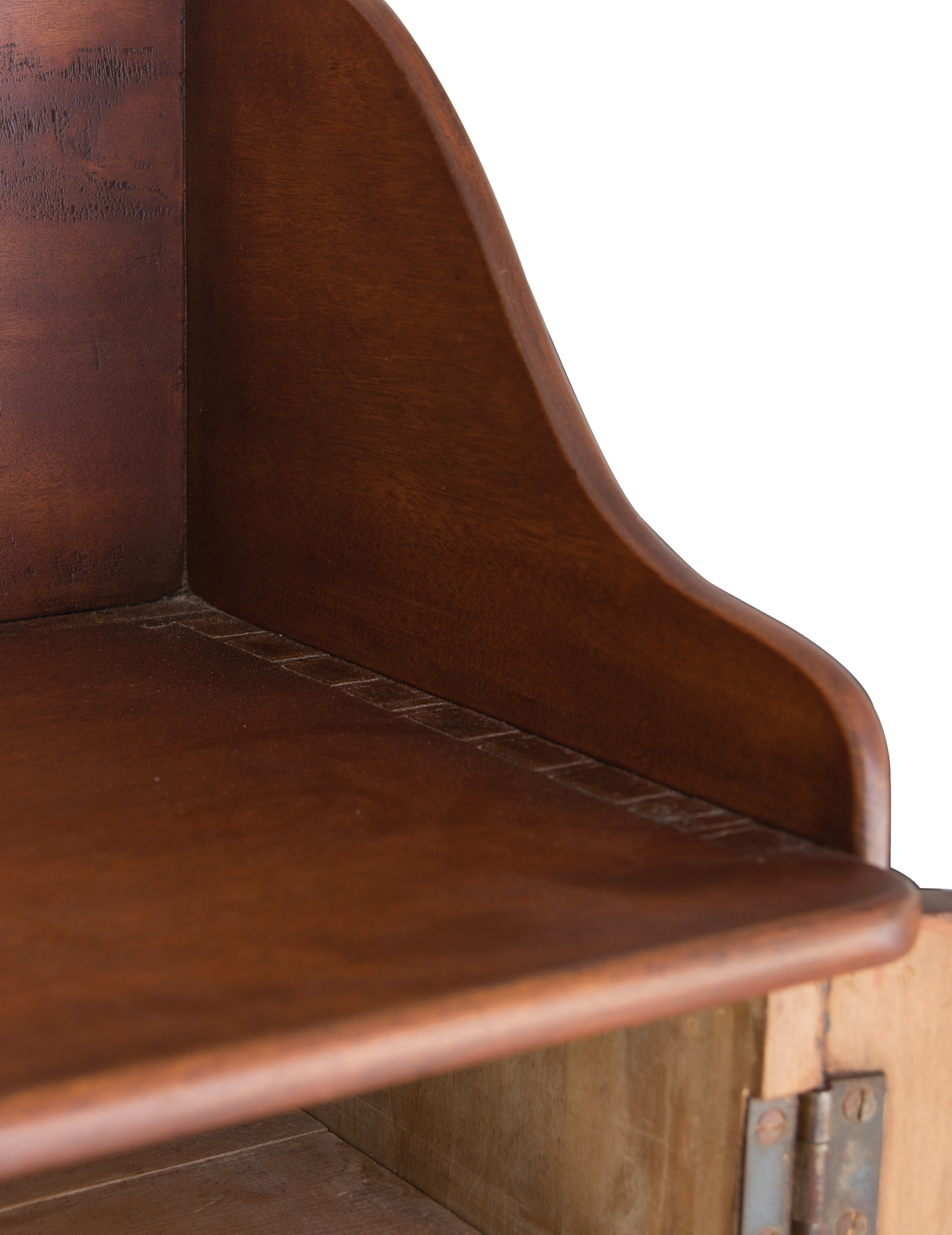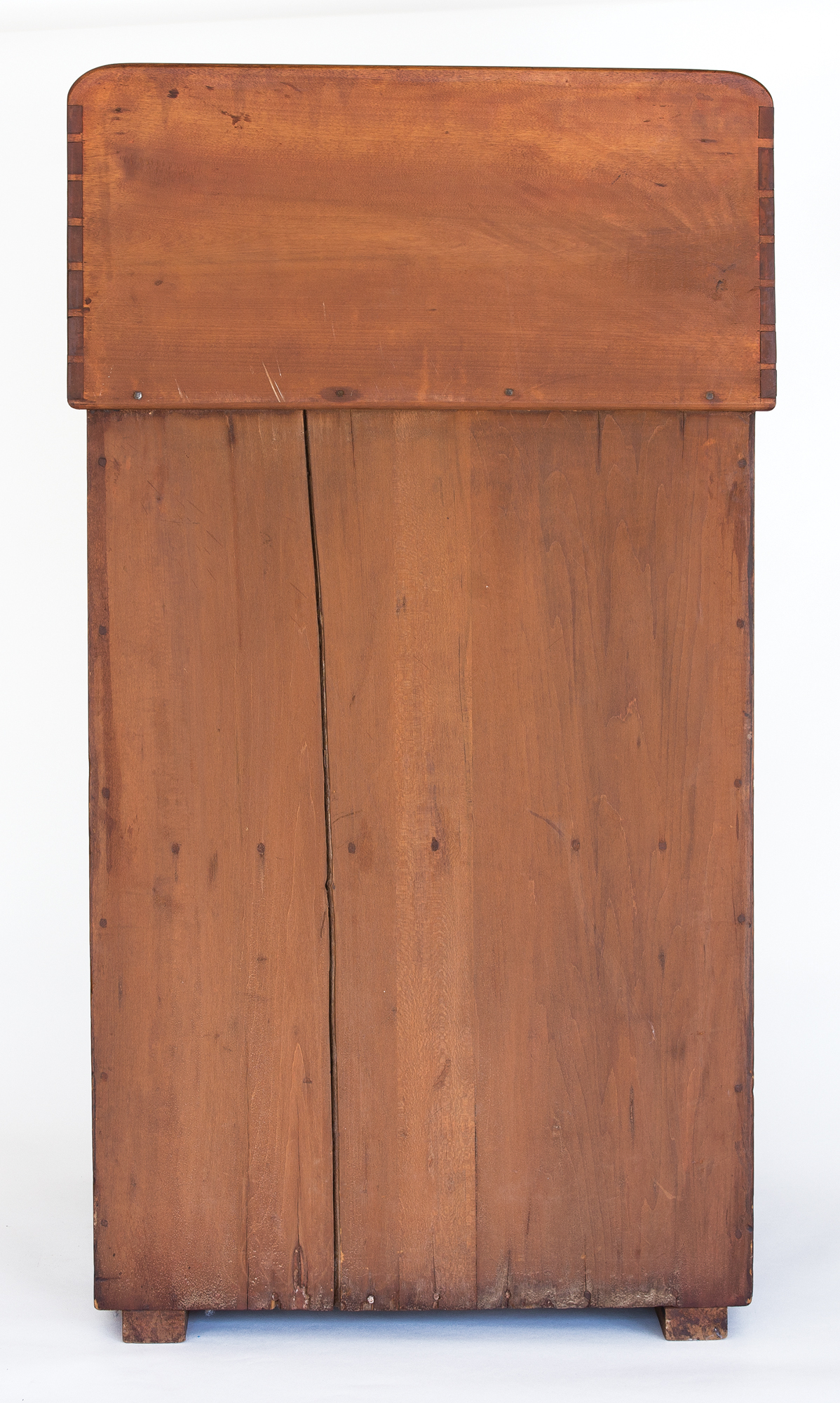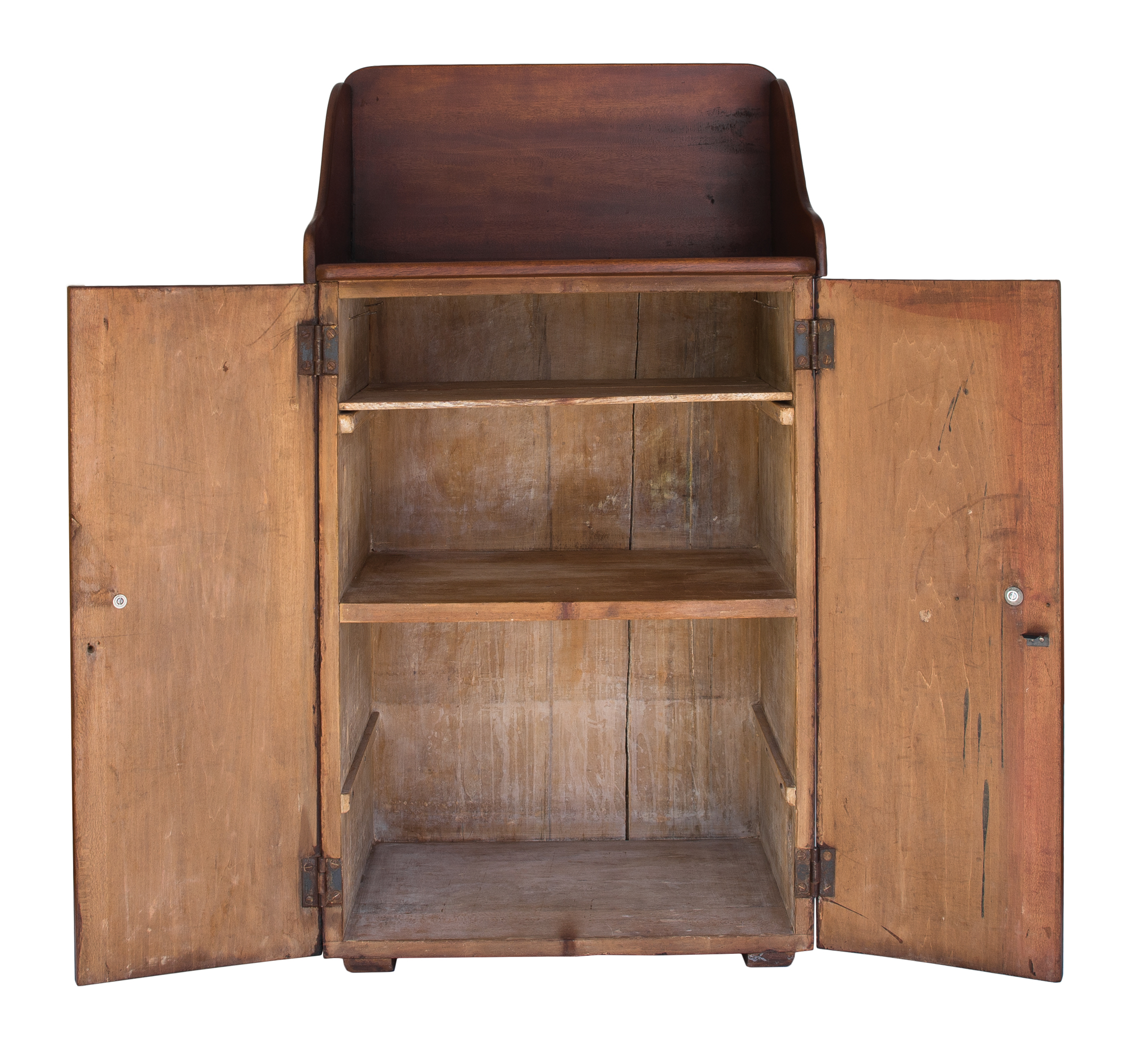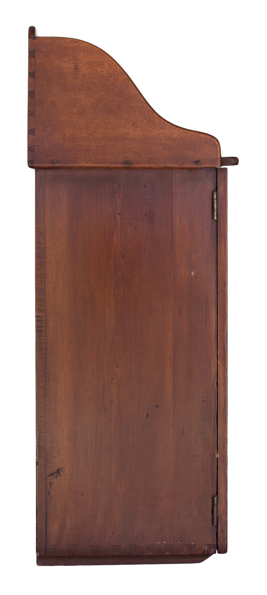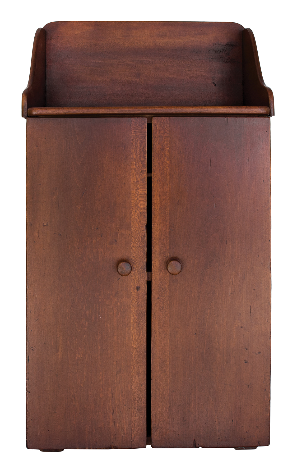 Cherry and birch, natural varnish finish, tall dovetailed backsplash, with curved sides, dovetailed case with two hinged plank doors, wood pulls, two vertical board back, baseboard lifted on shaped and beveled risers, c. 1850, 39 1/4″ h, 21 1/4″ w, 15 1/4″ d.