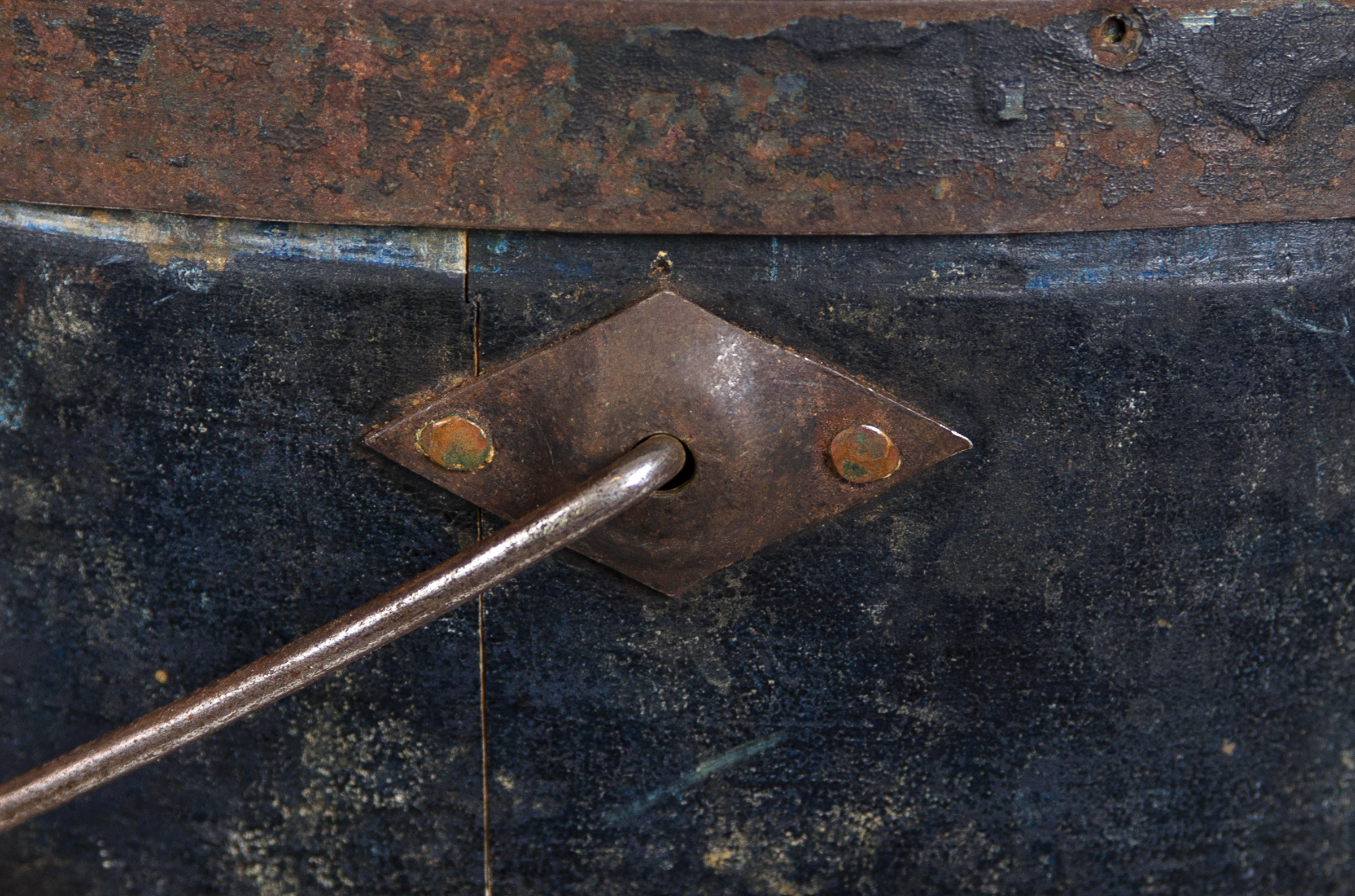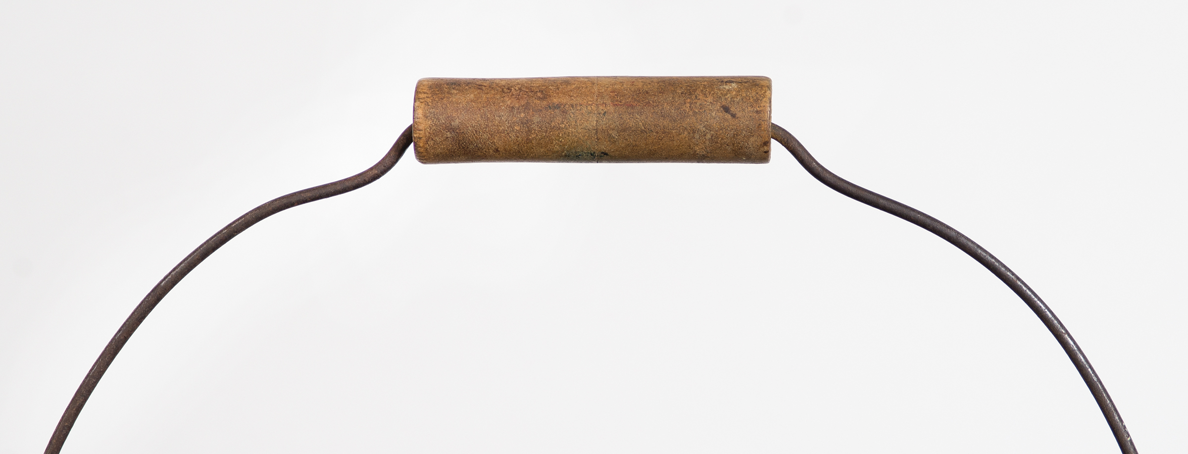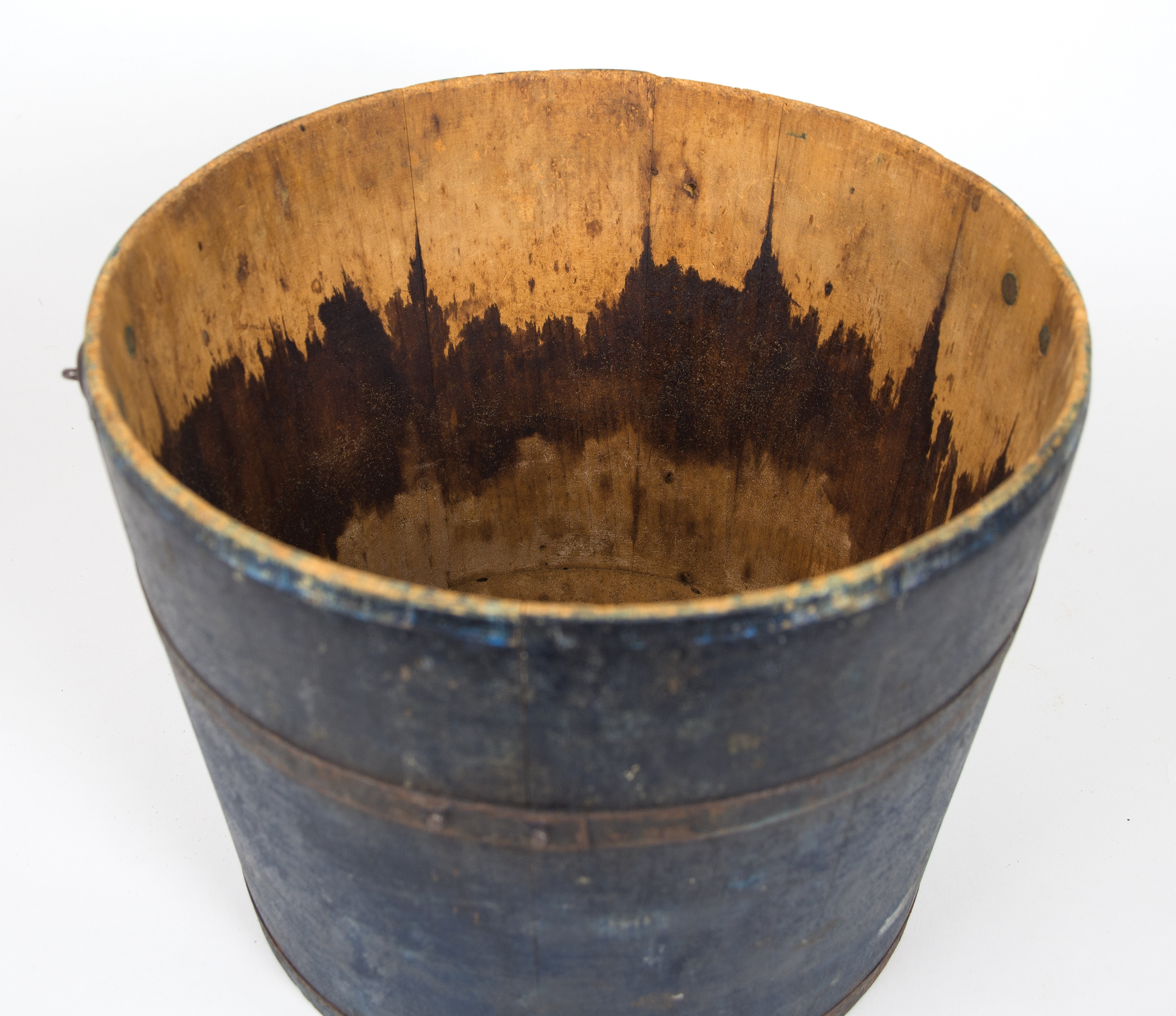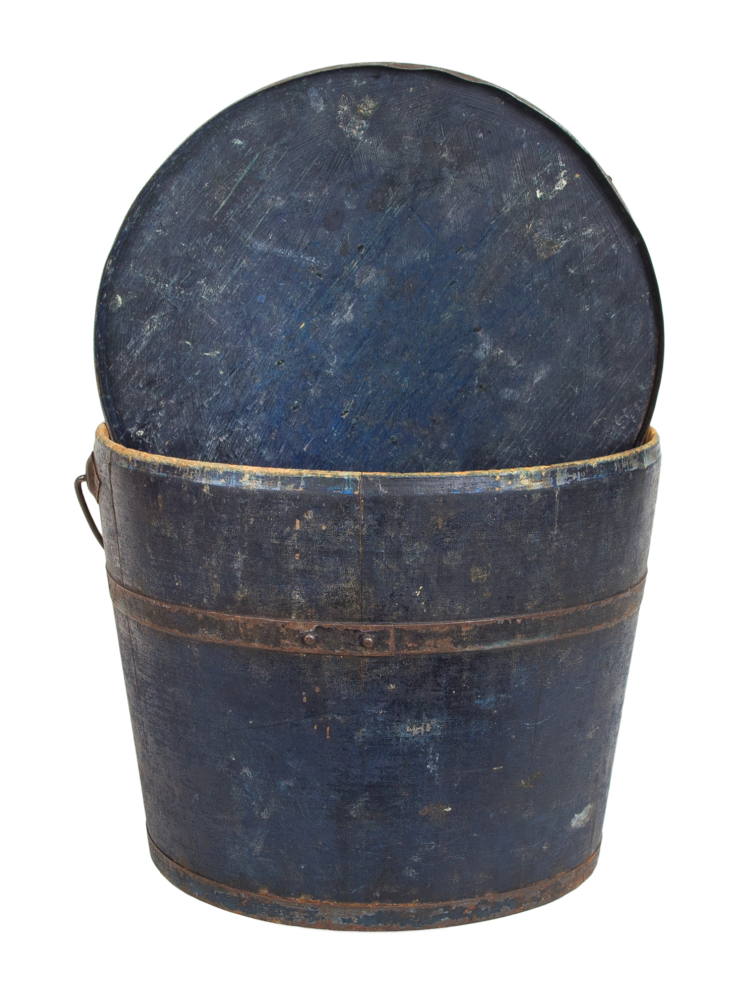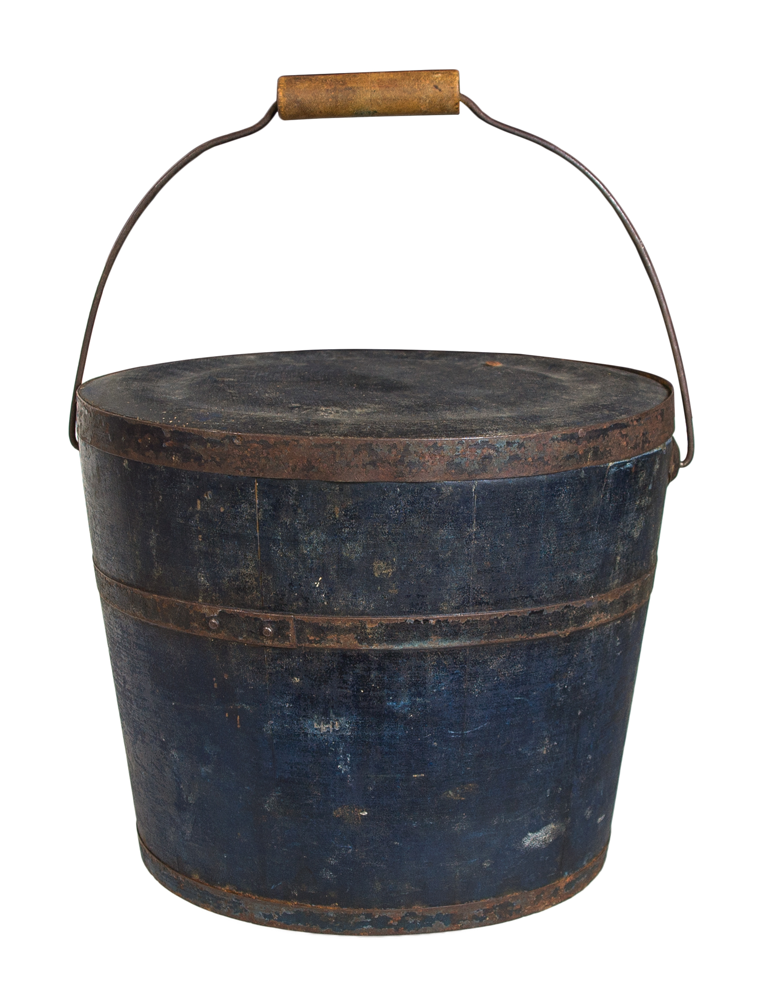 Pine, original blue painted finish, wire bail swing handle with turned birch handle, raised diamond bail plates, turned lid with slightly raised center, c. 1850-1860, 9 3/4″ h, 12″ dia.