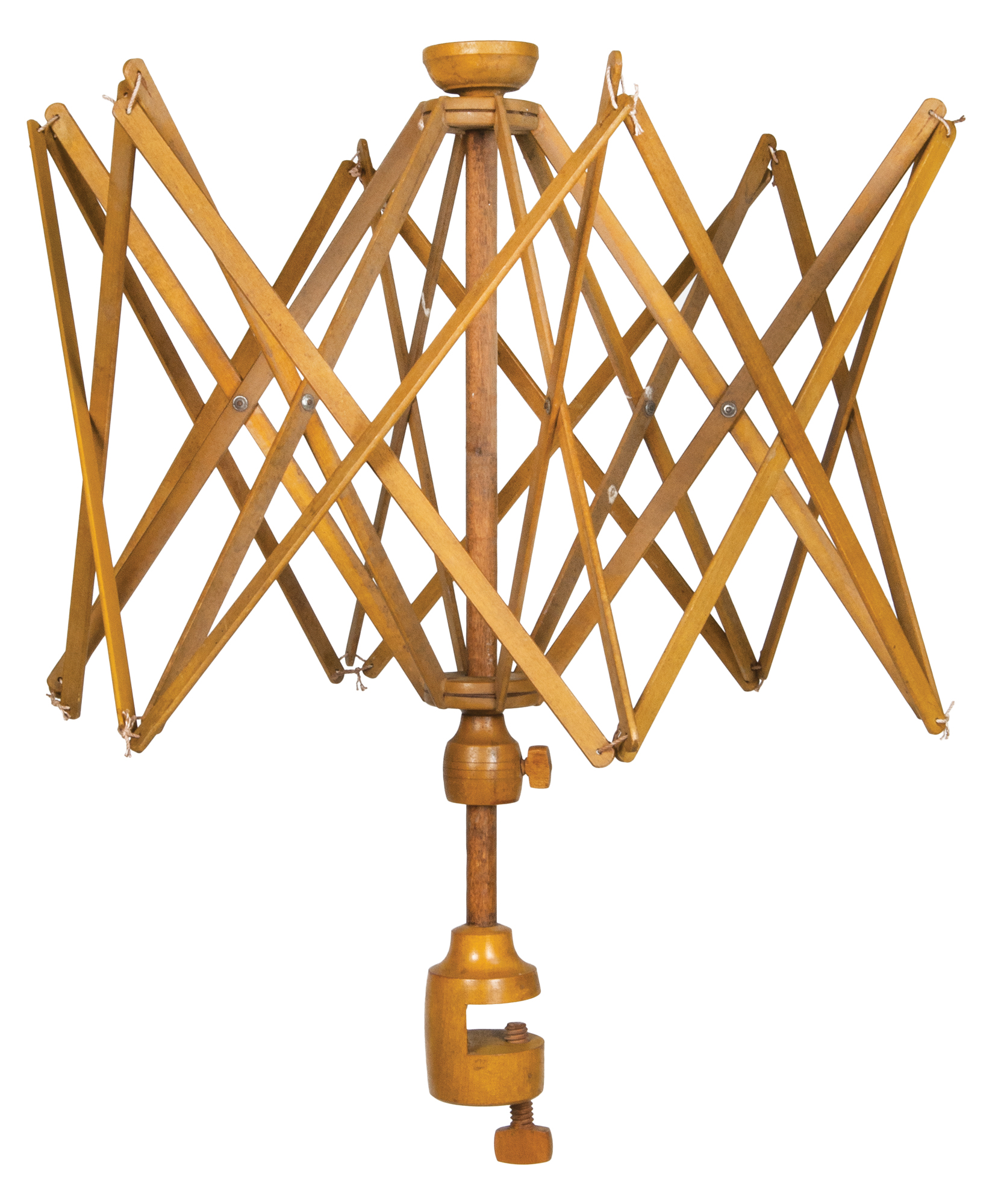 Maple and pine, original yellow stained finish, cup at top, expanding slats string tied, very fine construction and condition, made by Elder Thomas Damon, Hancock, MA, c. 1870, (note: these swifts were sold at the Shaker Store for 50 cents, Elder Damon at one time filled an order for 20,000 swifts), 25″ l.