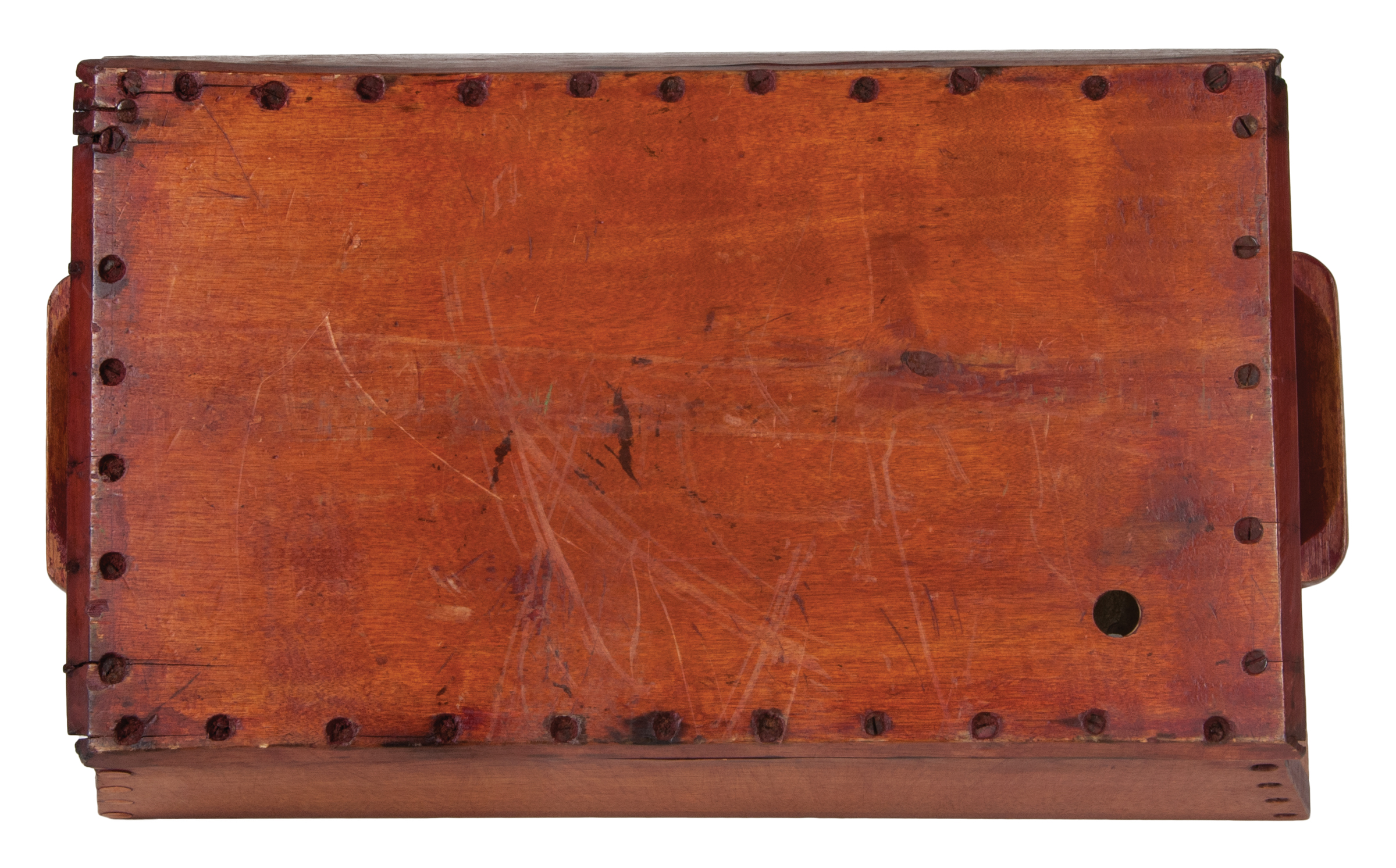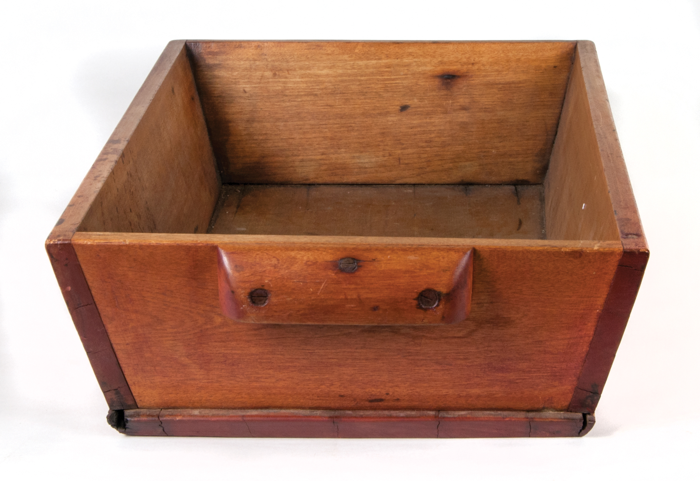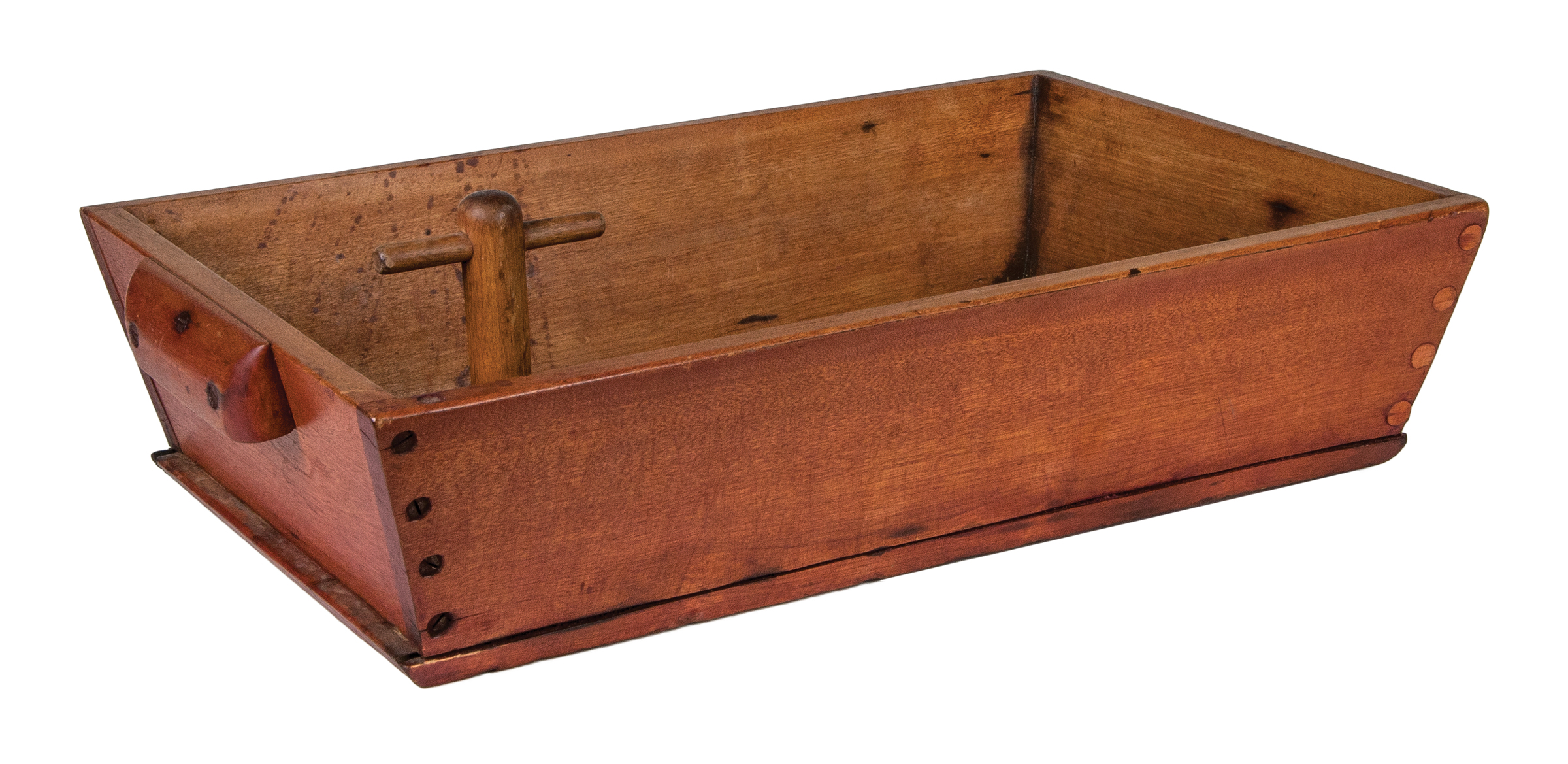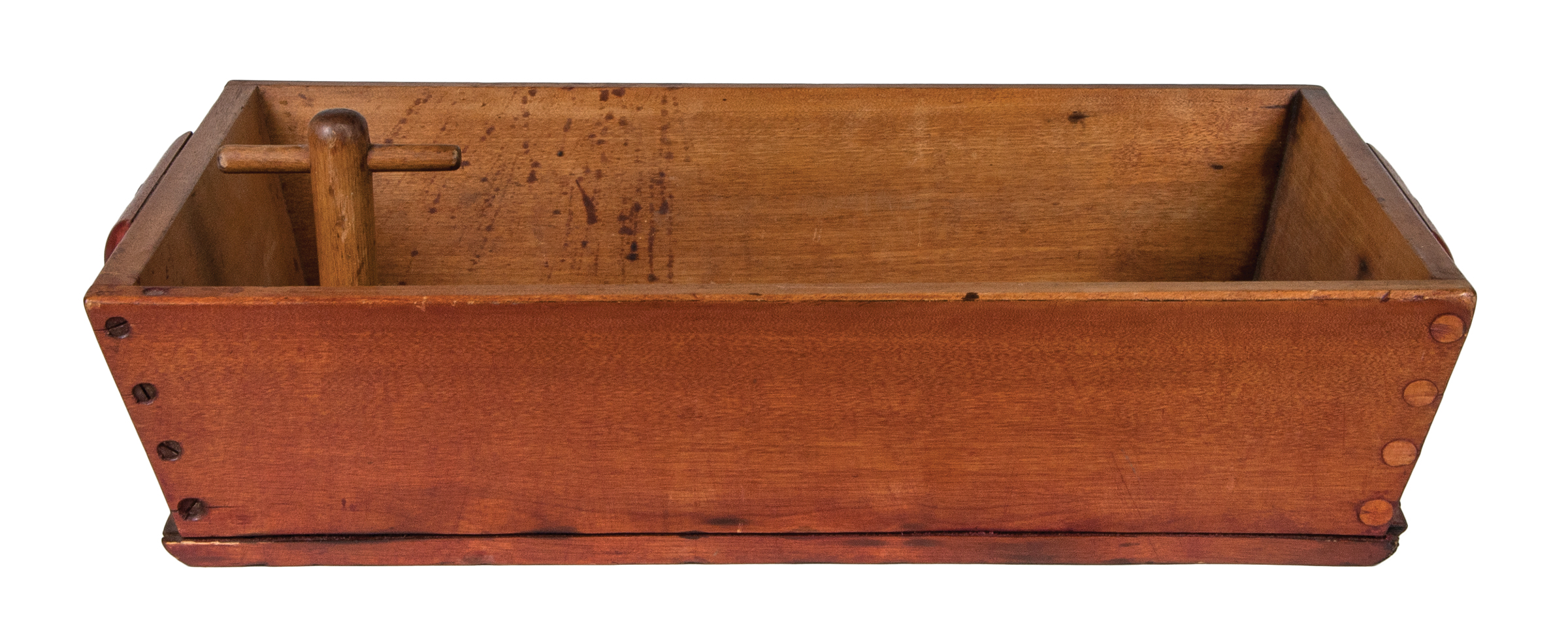 Birch, original red stained finish, canted sides secured with four screws per side, one board base secured with 35 countersunk screws, carved birch side handles each secured with three screws, original turned birch plug with turned birch handle, Canterbury or Enfield, NH, c. 1850, 5 1/2″ h, 22 3/4″ l, 14 3/4″ w.