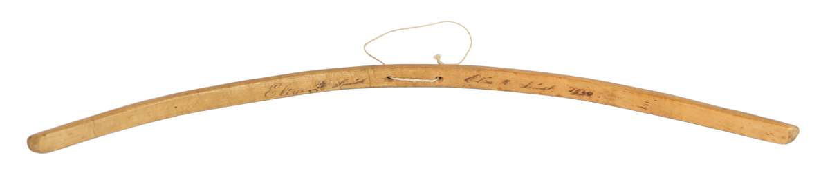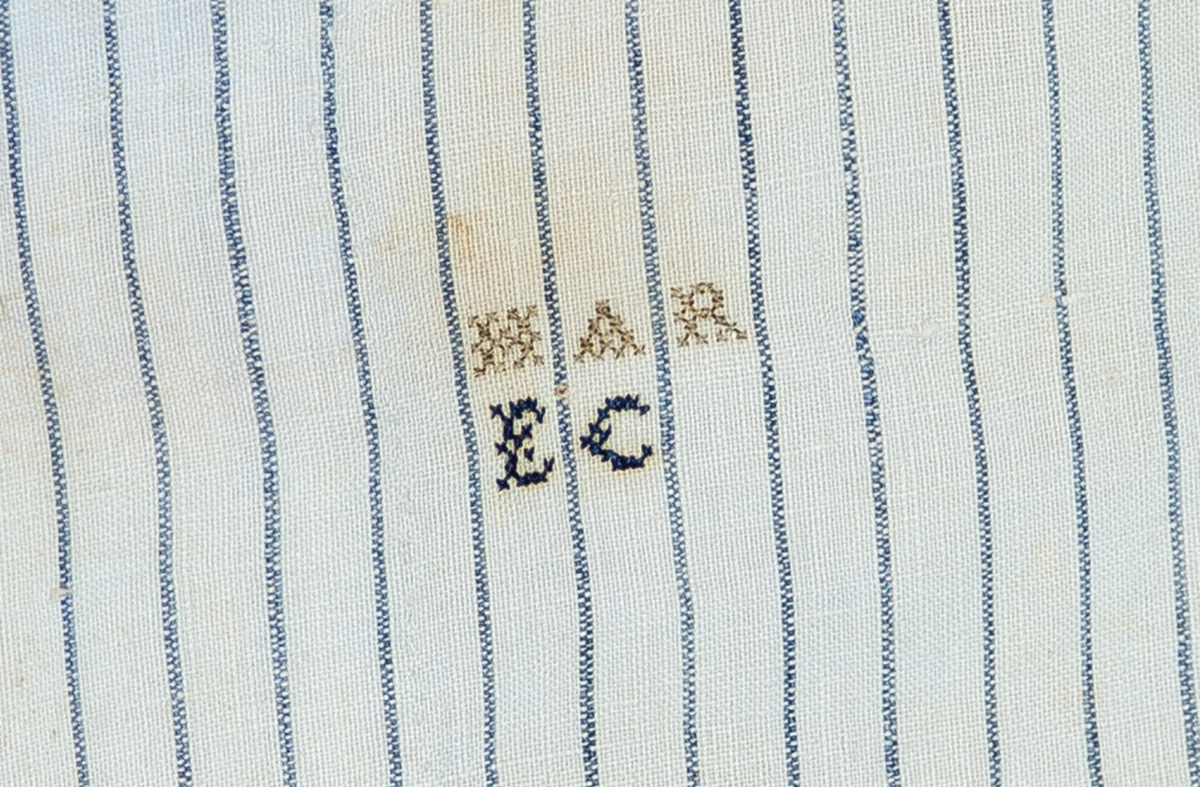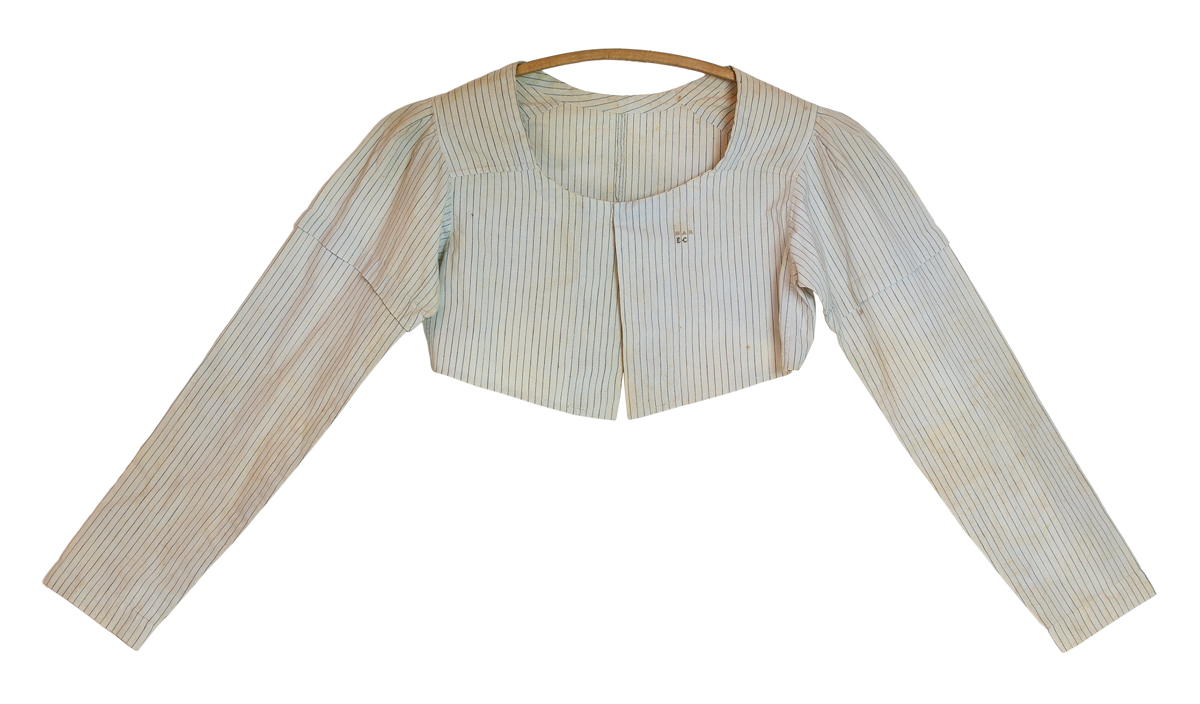 Blue striped cotton, pieced sleeves that extend below the elbow, fastened in front with a pin, two sets of initials are embroidered on the front left “HAR” and “EC”, (note: given from one Shaker Sister to another); and a carved wood Shaker hanger with string, signed twice “Eliza A. Smith, 1830.”, see p. 163, Figure 91, Shaker Textile Arts, Beverly Gordon, 1980.