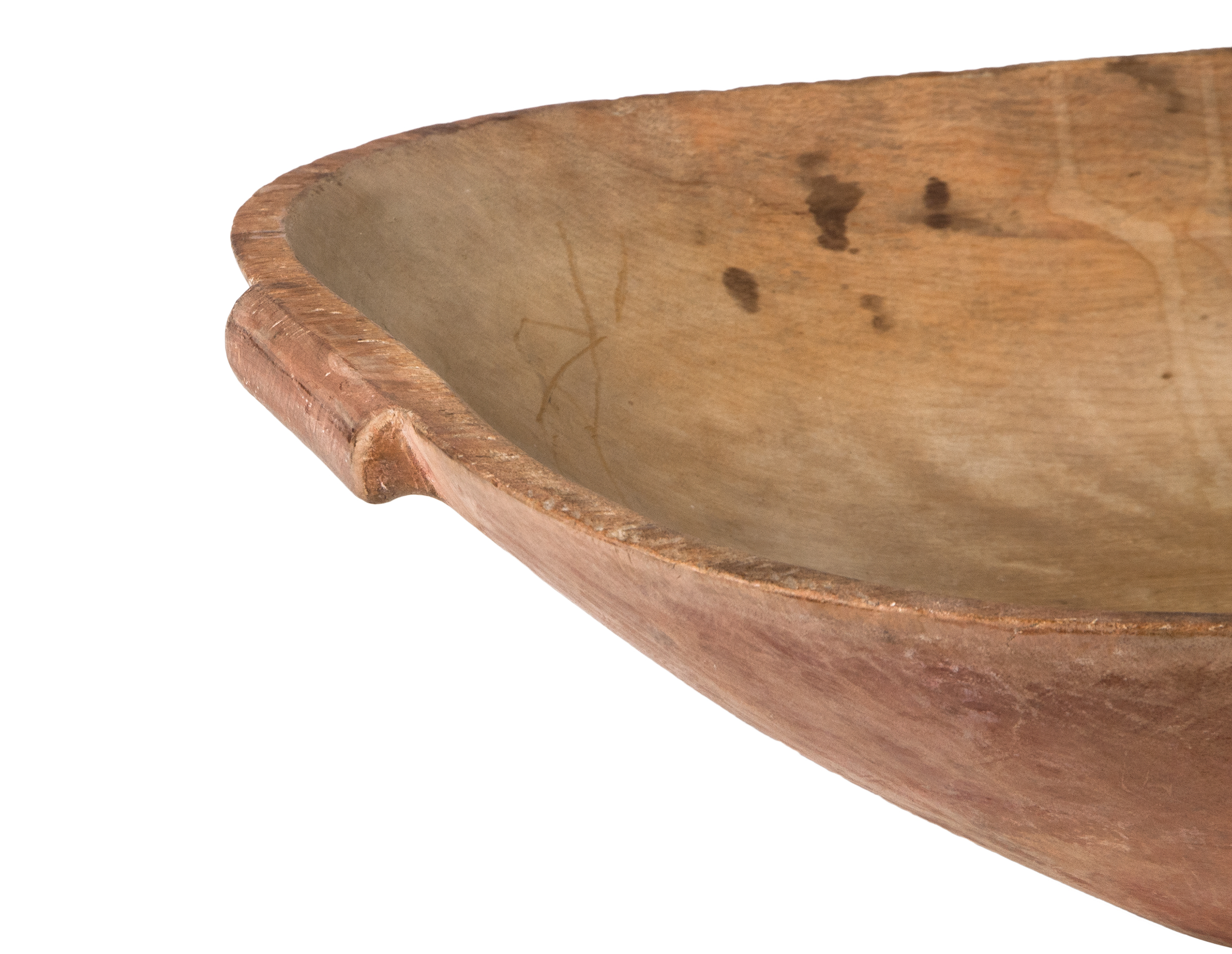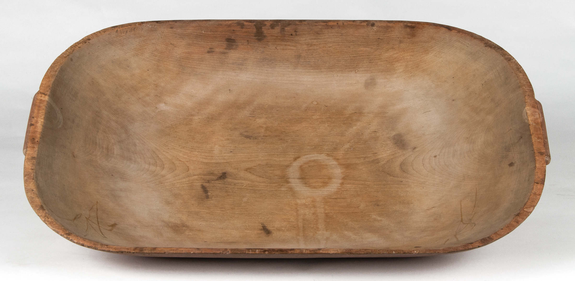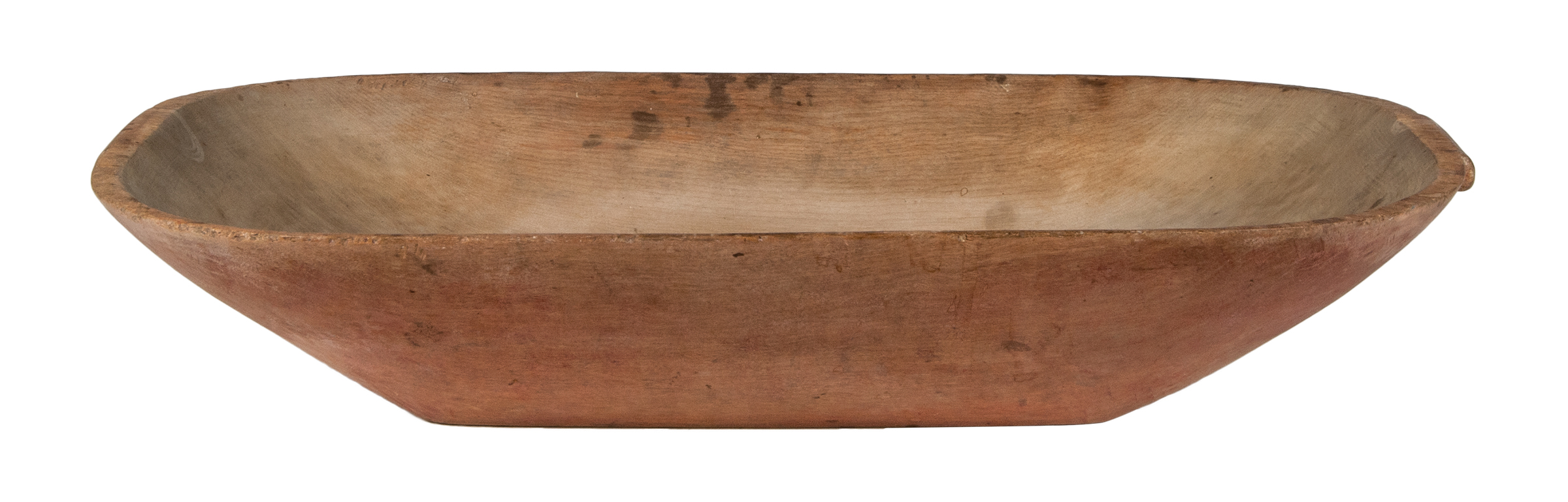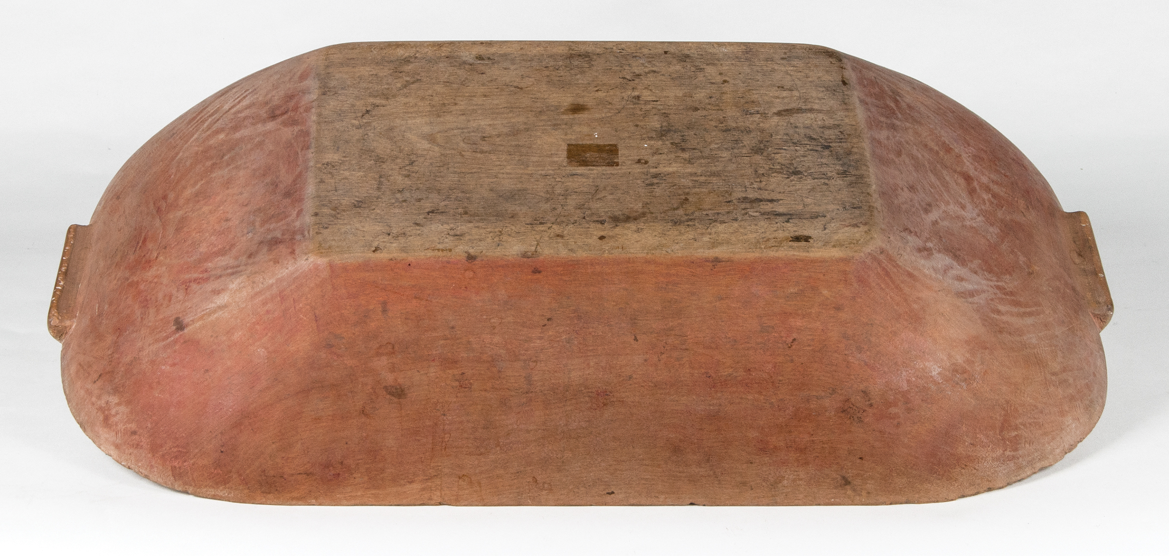 Maple, red stained finish, carved from one piece of wood, rectangular base with flared sides, carved handles on ends, good overall condition, c. 1850, 26 1/2″ l, 15 1/2″ w.