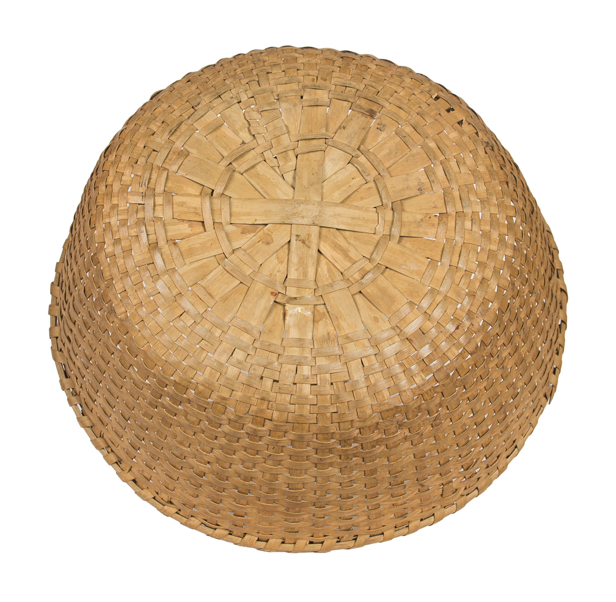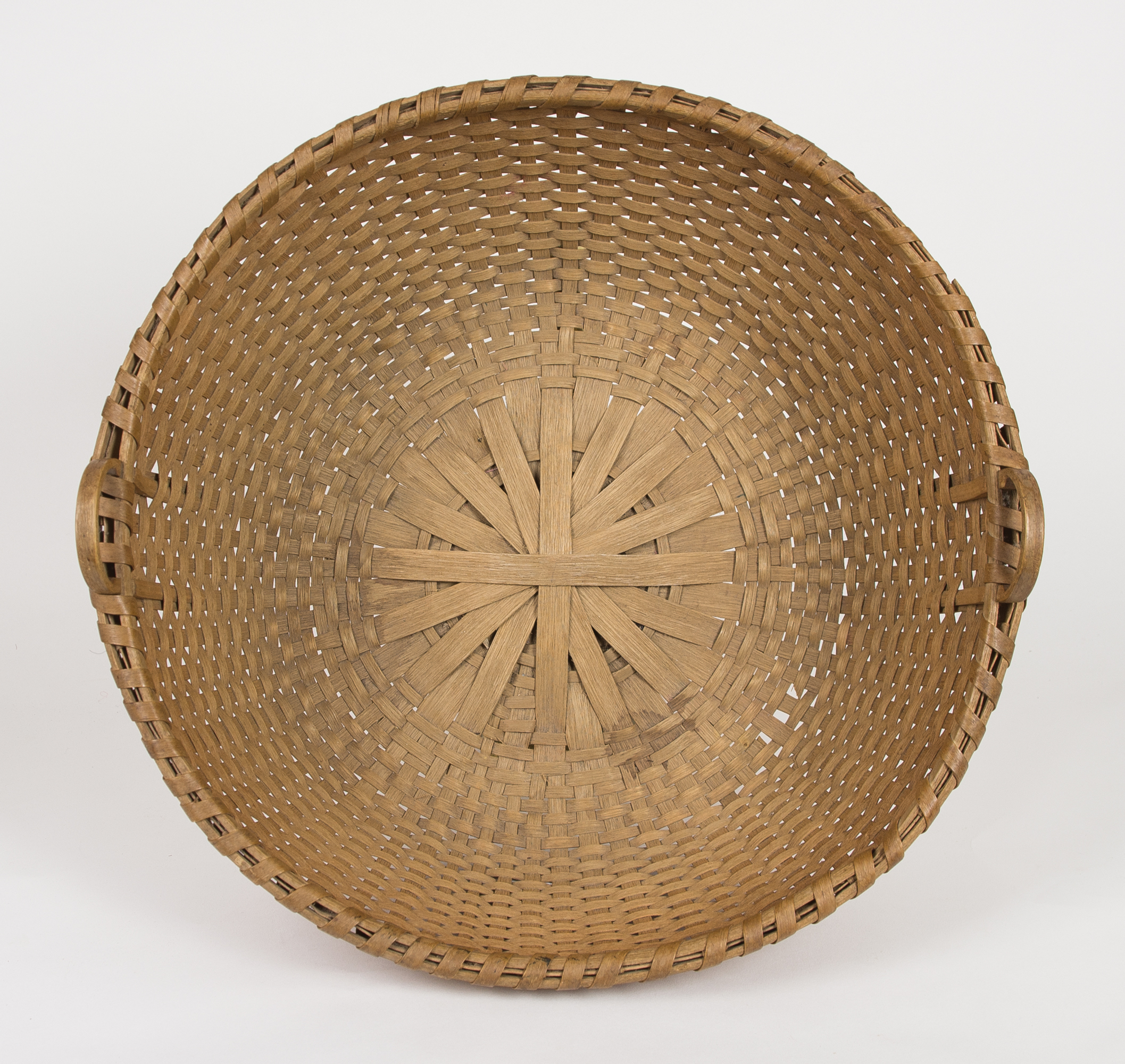 Black ash splint, carved inset side handles (1 1/4″ h), single wrapped rim, light patina, one small splint break in bottom, c. 1870, 6 1/4″ h (to rim), 16 1/2″ dia.