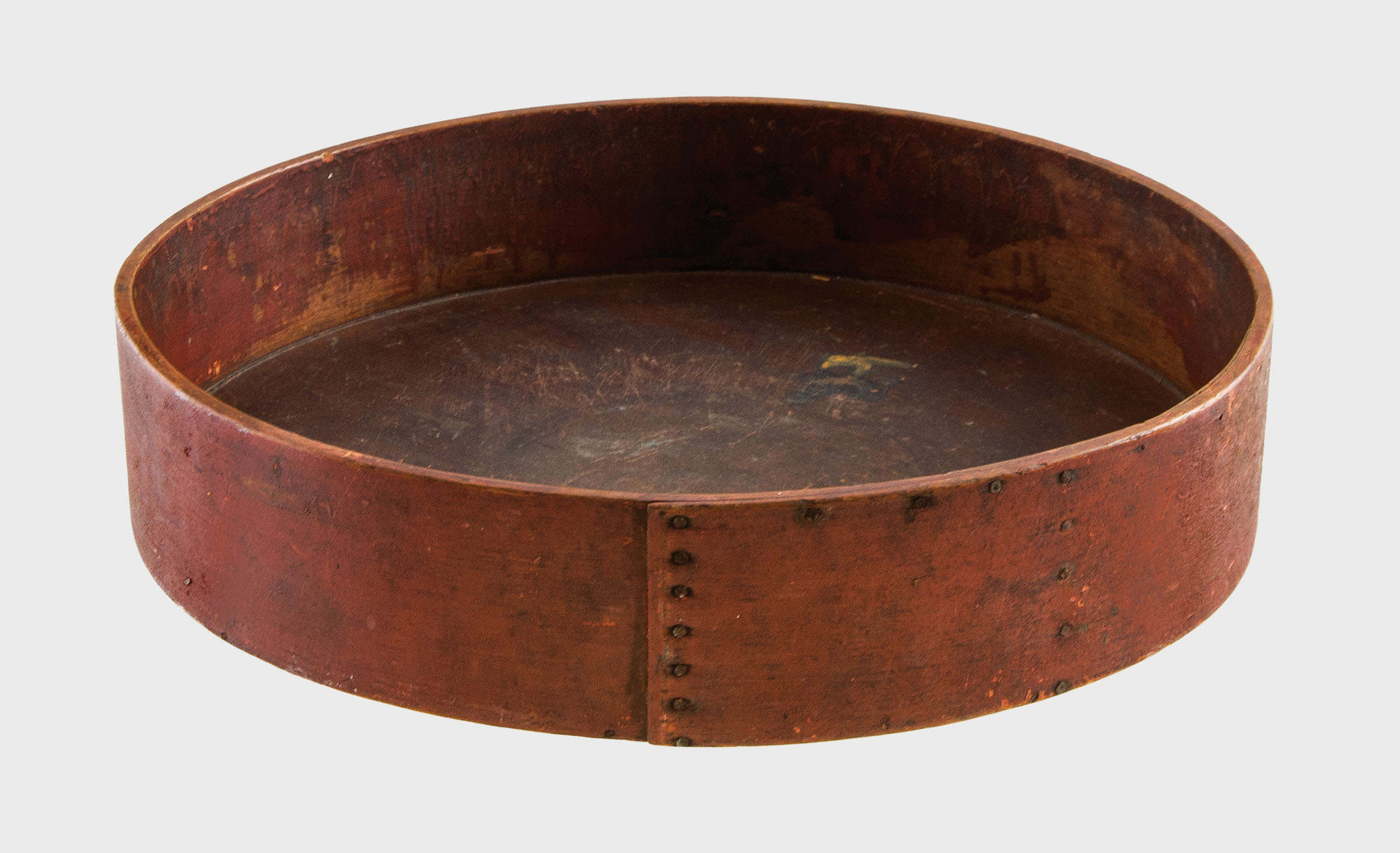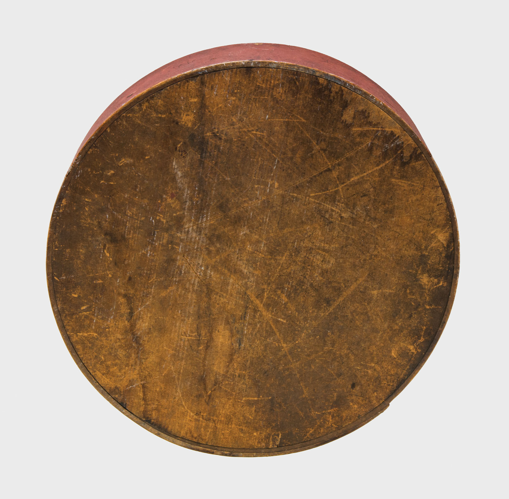 Pine and birch, original red painted finish, nailed joinery with seven evenly measured hand-forged tacks, along a beveled edge, Enfield, NH, c. 1830, (note: purchased by the consignor at a Maine auction with history of it coming from Enfield, NH), 3″ h, 14 1/2″ dia.