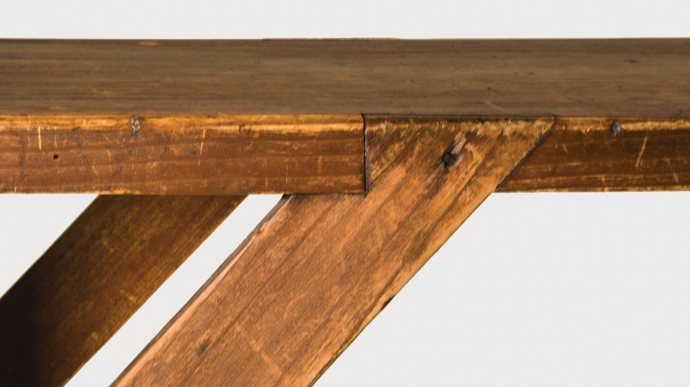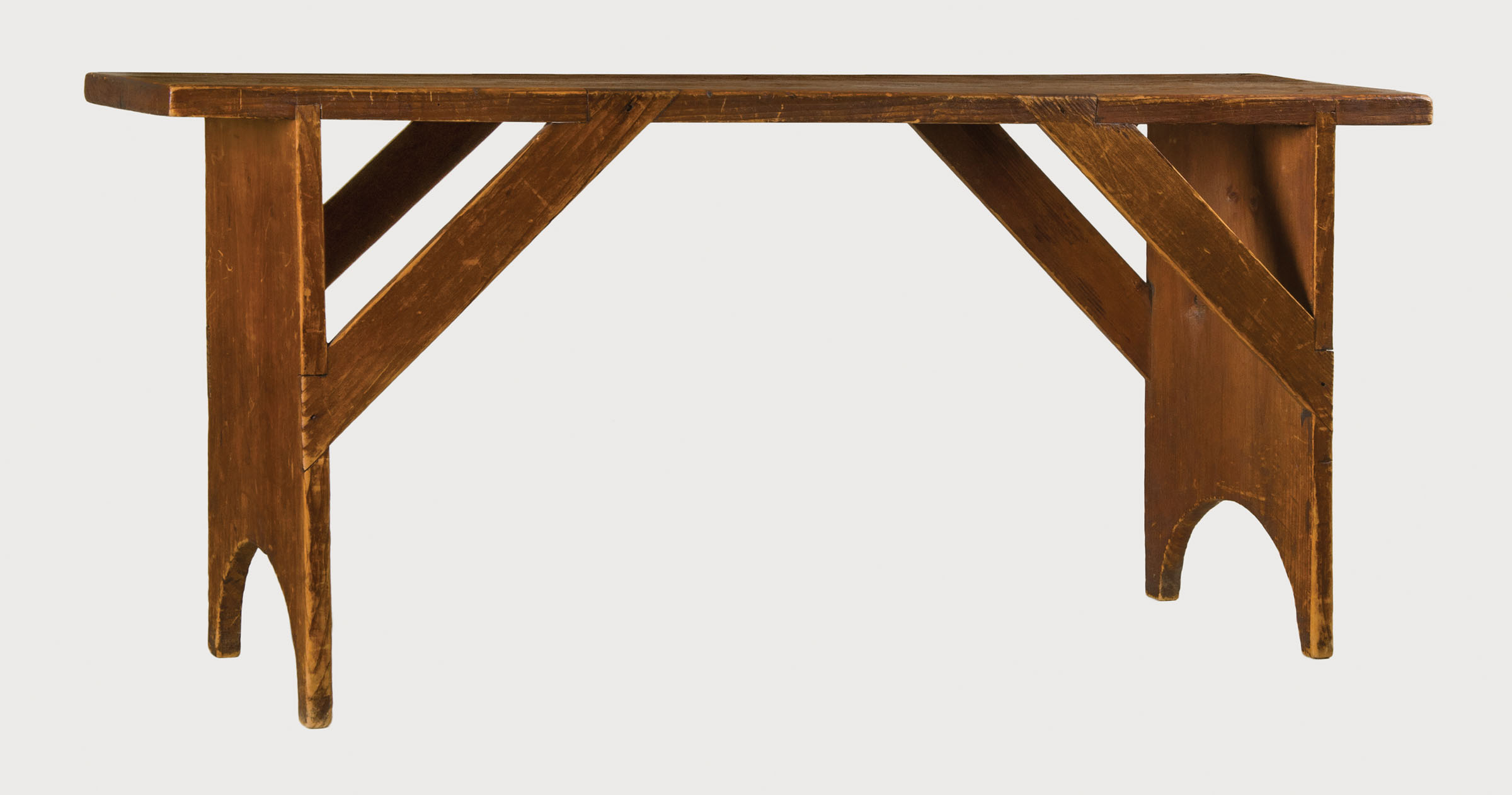 Pine, plank top, original brown stained finish, 39″ l, 10″ w, on two pine plank ends dovetailed into top with bootjack carved feet, four braces dovetailed into top and sides, 19″ h, Hancock, MA, c. 1830-1840, (note: a classic Shaker bench in original color).