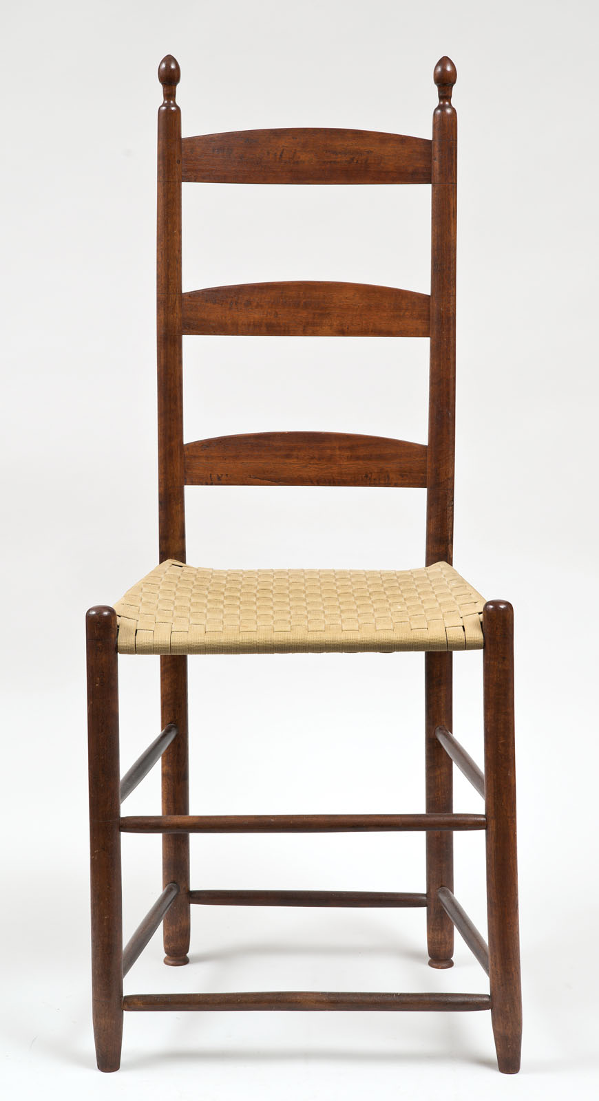 Walnut and figured walnut, three-slat back, taped seat, tilters on back posts, unusually tall 19” seat height to be used for a special occupation, or possibly for a tall Shaker Brother such as Elder Frederick Evans, New Lebanon, NY, c. 1840, 44 1/2” overall h, (Flo and Howard Fertig collection).