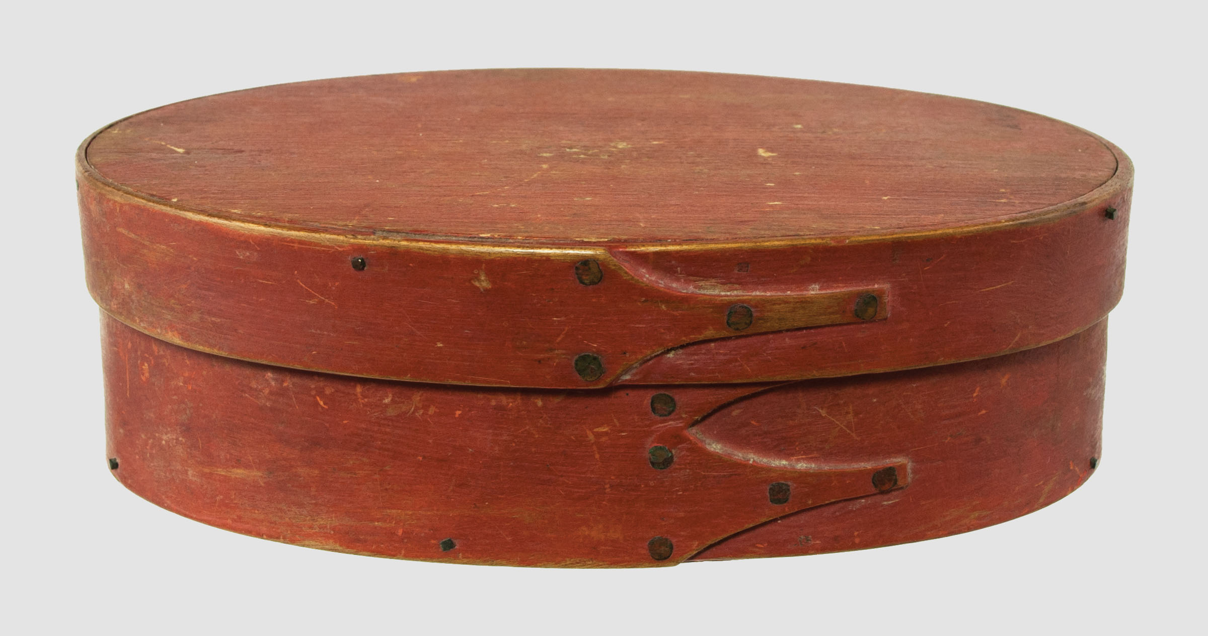 Maple and pine, original bittersweet dry red painted finish, three fingers, copper tacks, possibly Canterbury, NH, c. 1830-1840, 2” h, 6 3/8” l.