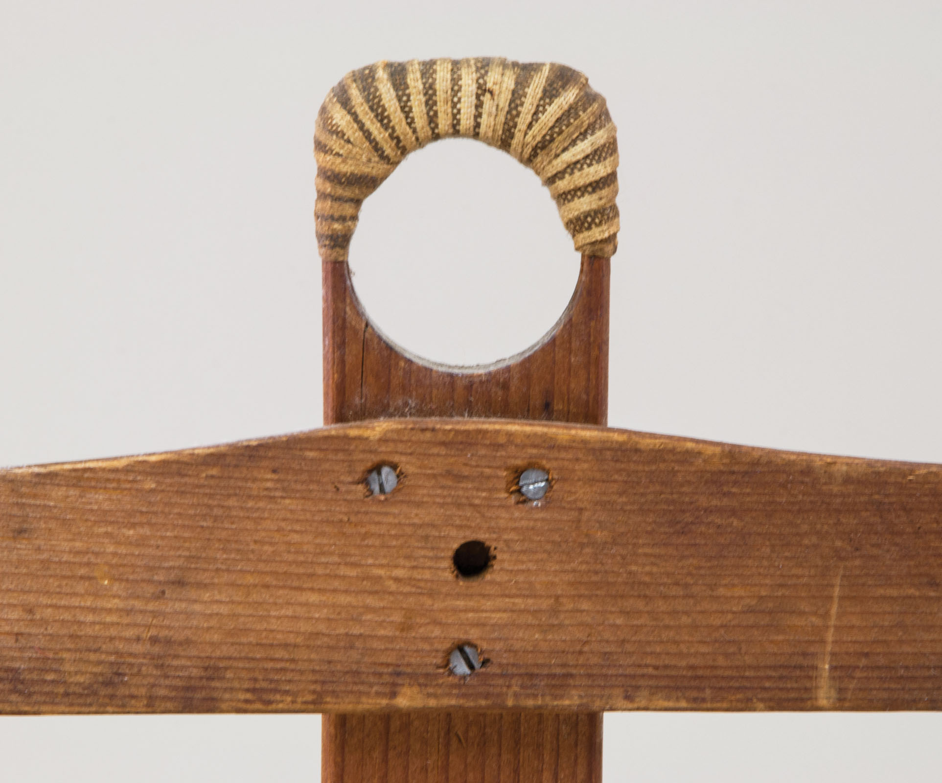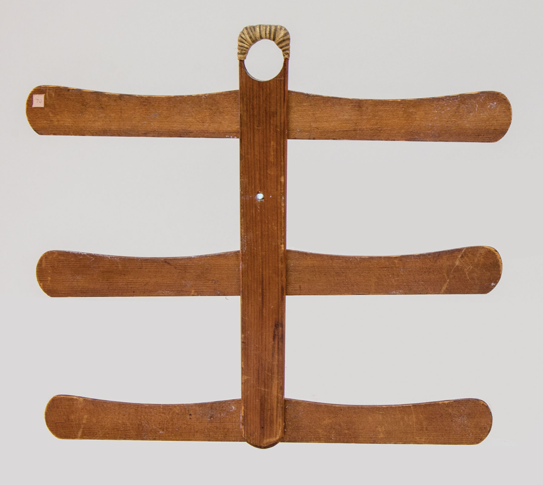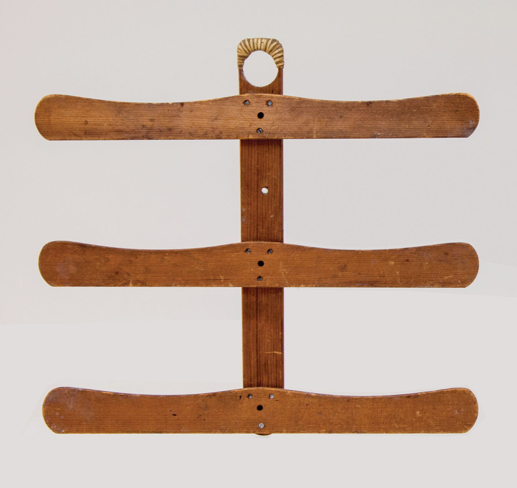 Pine, original natural finish, shaped bars, each attached to a vertical pine slat with three symmetrically aligned screws in a triangular pattern, top is carved into a 1″ circle in order to hang on a peg board, and also wrapped with Shaker woven tape, North Family, New Lebanon, NY, c. 1840-1850, 13″ h, 14 1/2″ w (bars), (James Bissland collection).