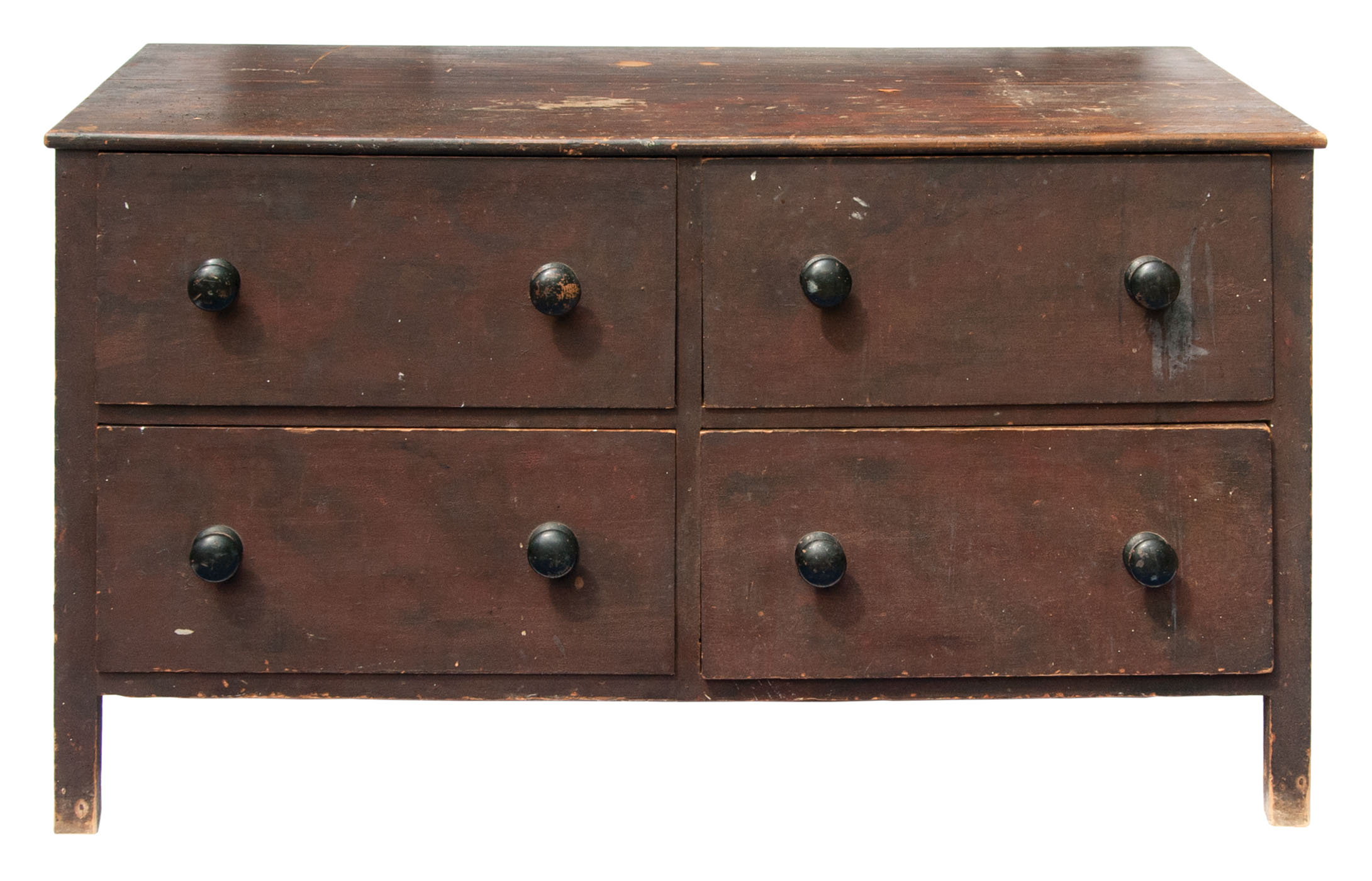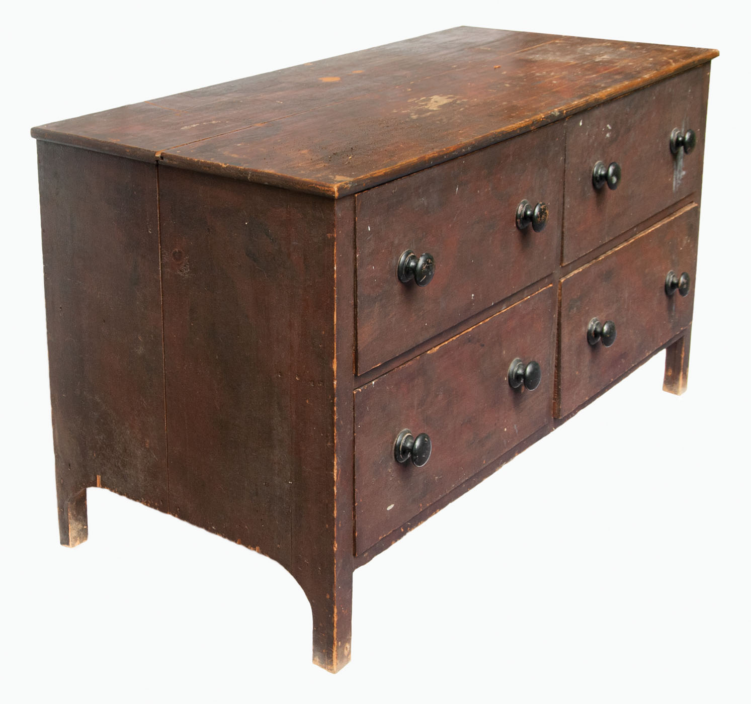 Pine, original red/brown painted finish, tongue and groove two-board top, nailed drawers, two black painted pulls per drawer, square legs, slightly arched side on left, found in Harvard, MA, c. 1850, 31″ h, 53″ w, 24 1/4″ d.