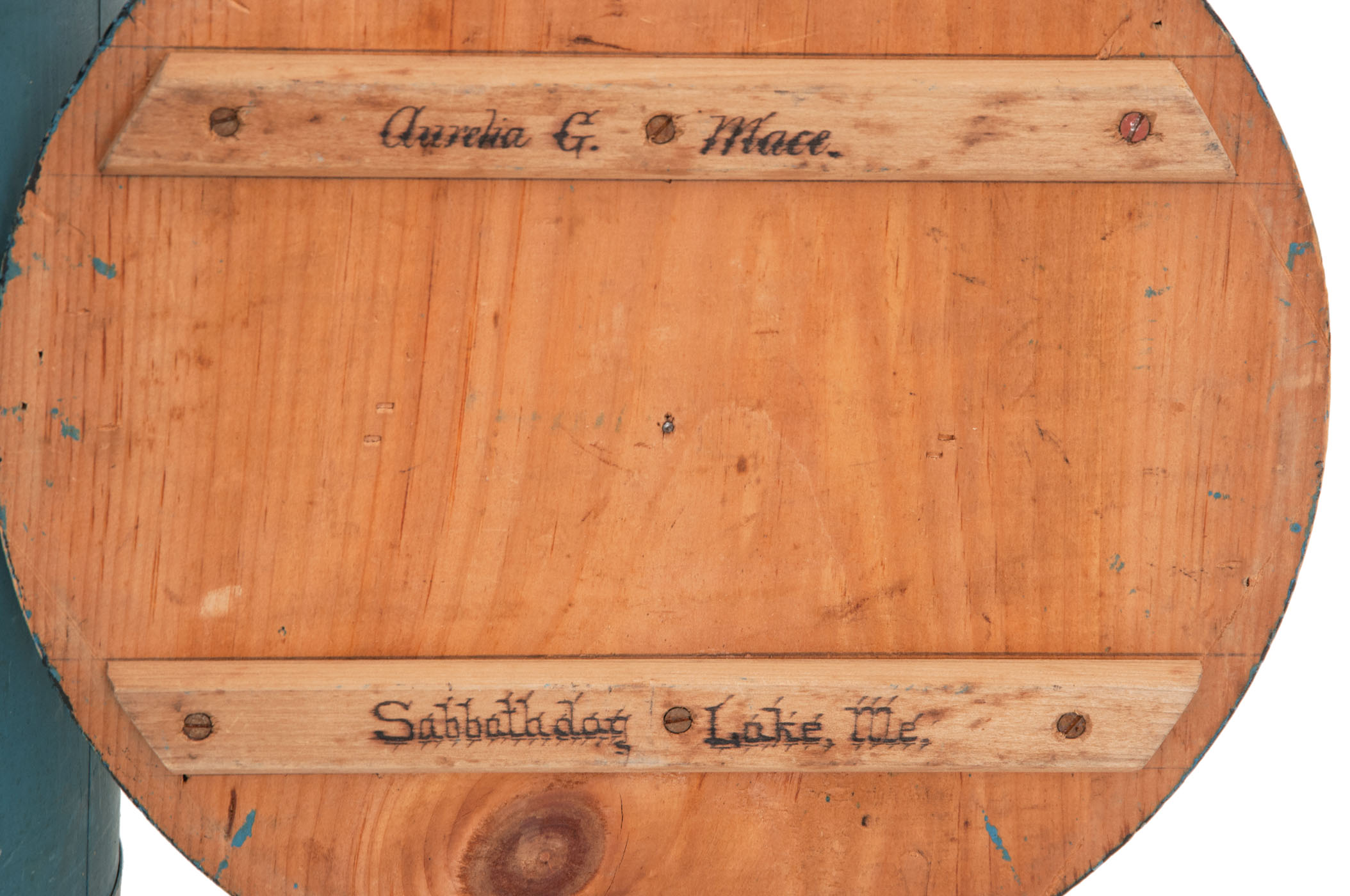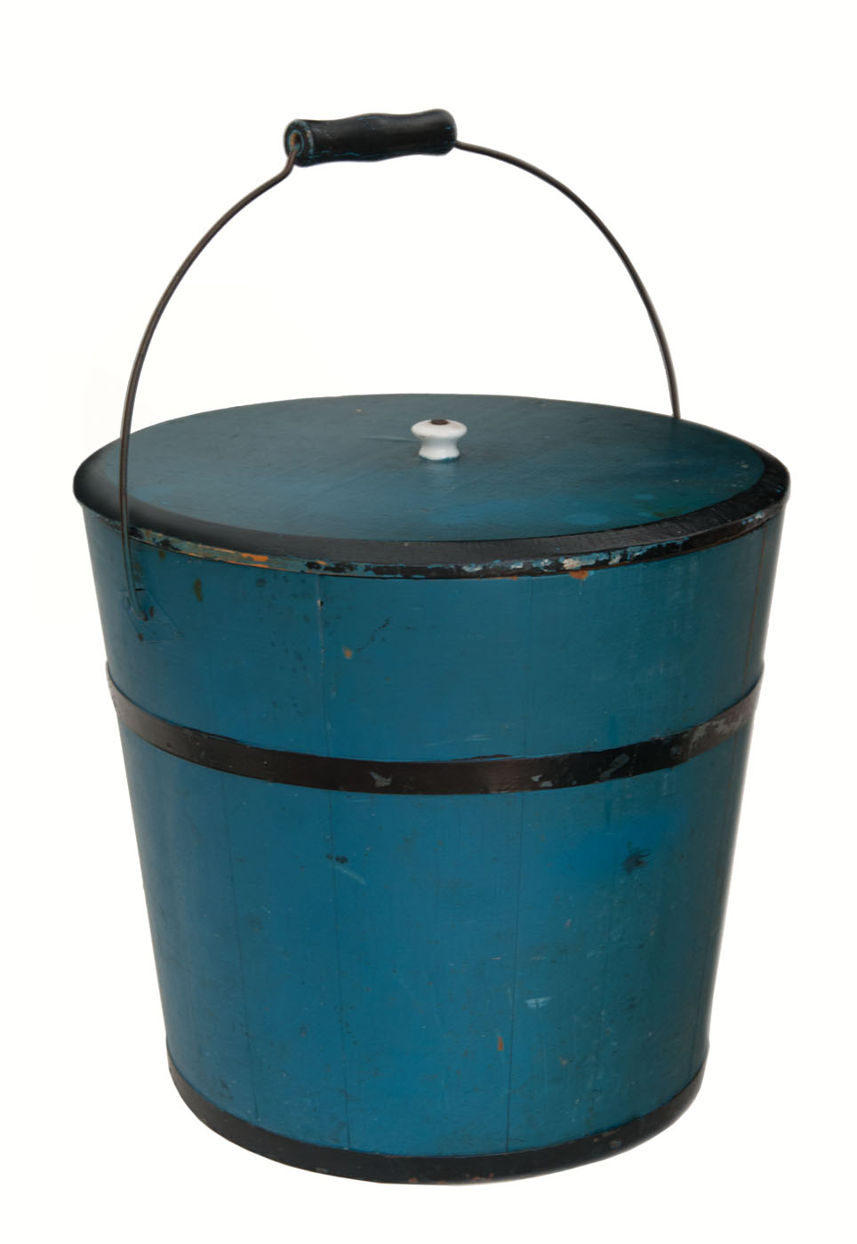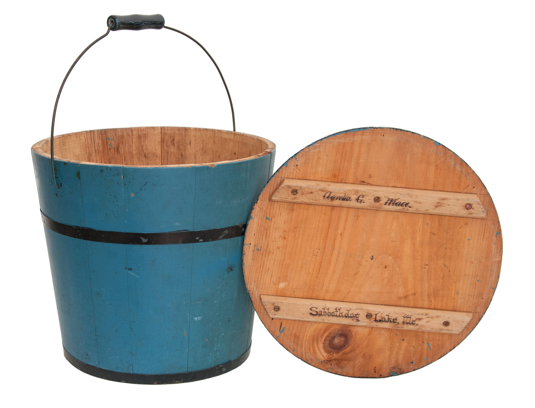 Pine, original blue painted finish, beveled lid rim, turned handle and steel straps are painted black, white porcelain pull, signed on splines under lid “Aurelia G. Mace.” and “Sabbathday Lake, Me.”, 12 1/2″ h (to rim), 18″ h (to top of handle), 13″ dia.