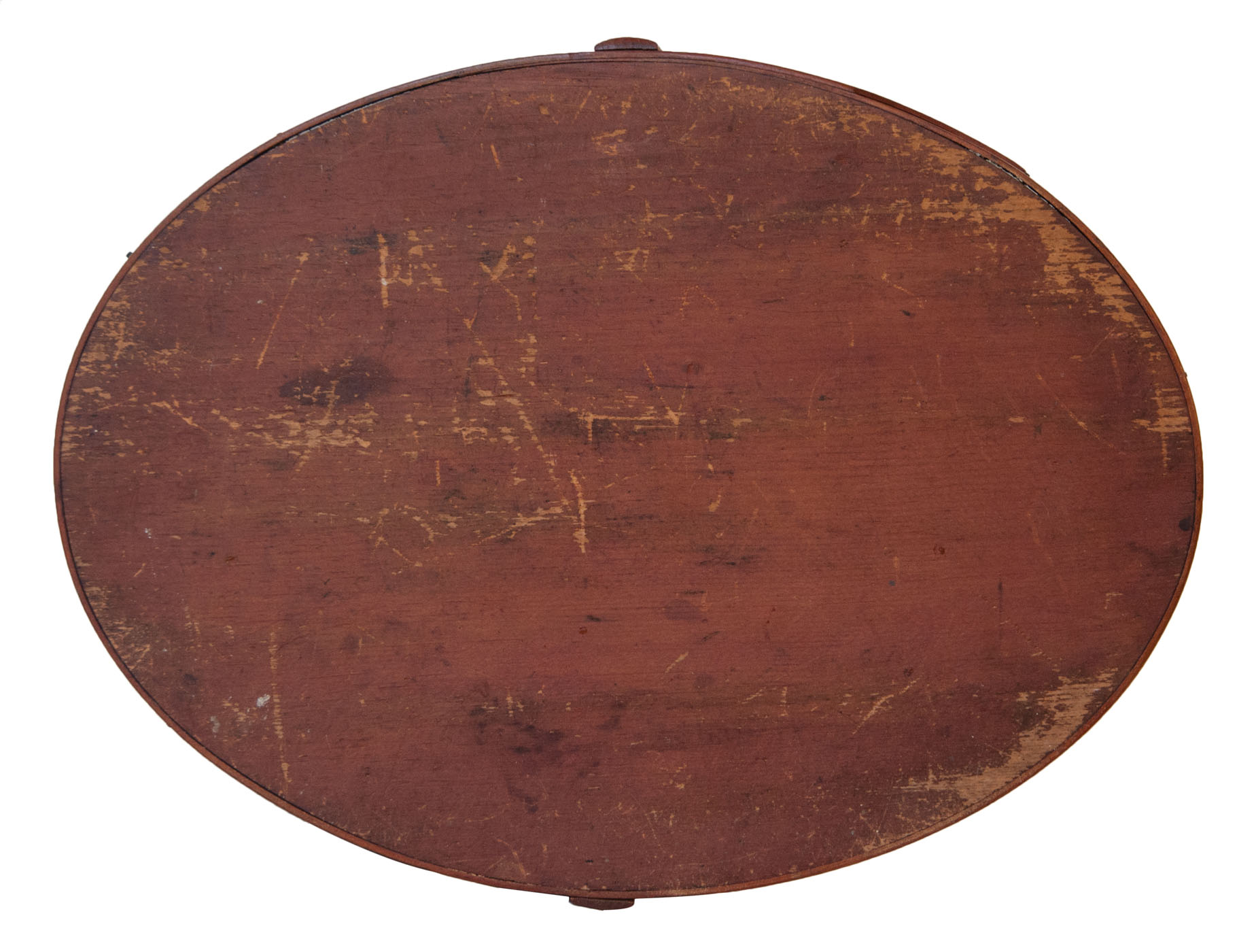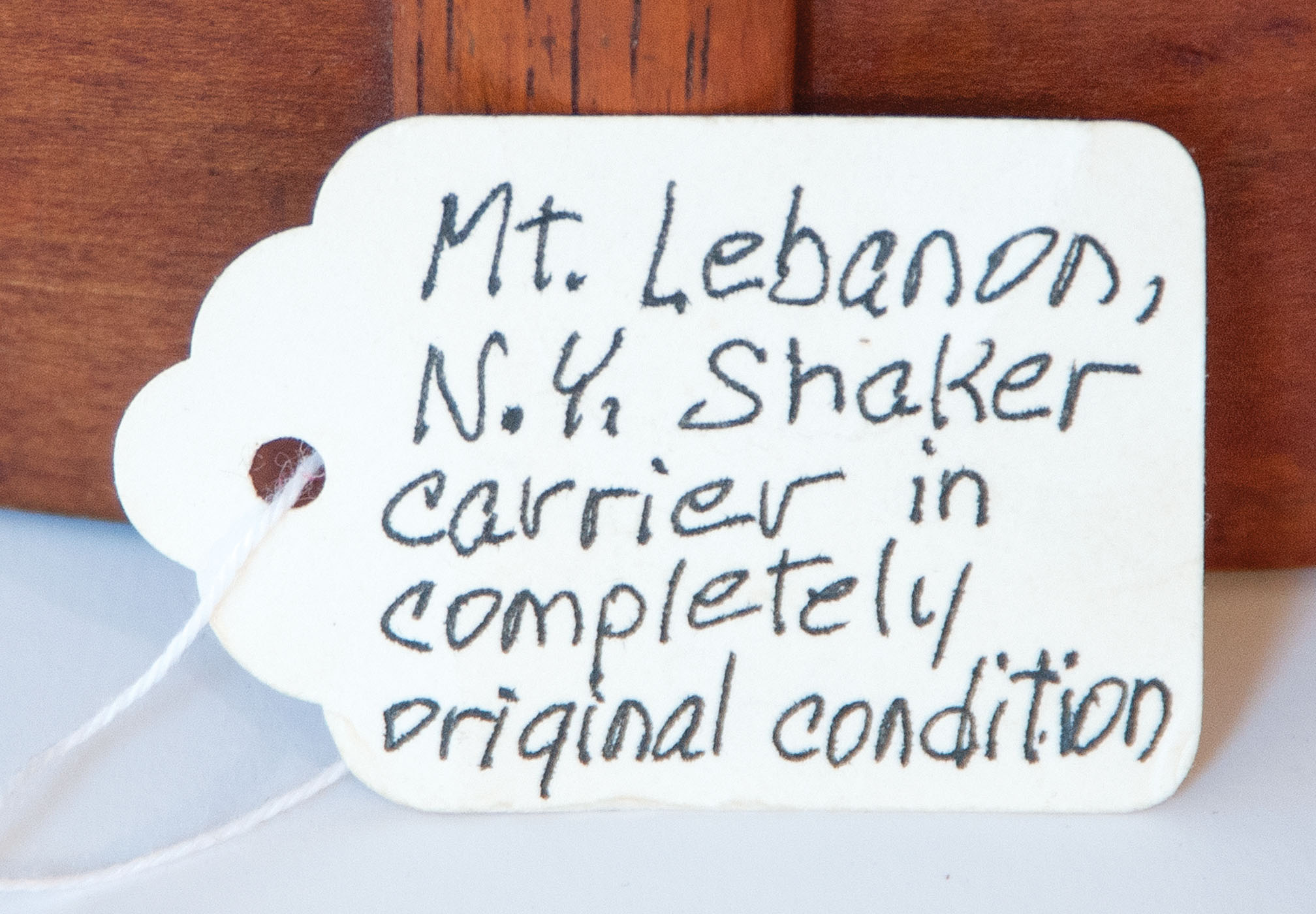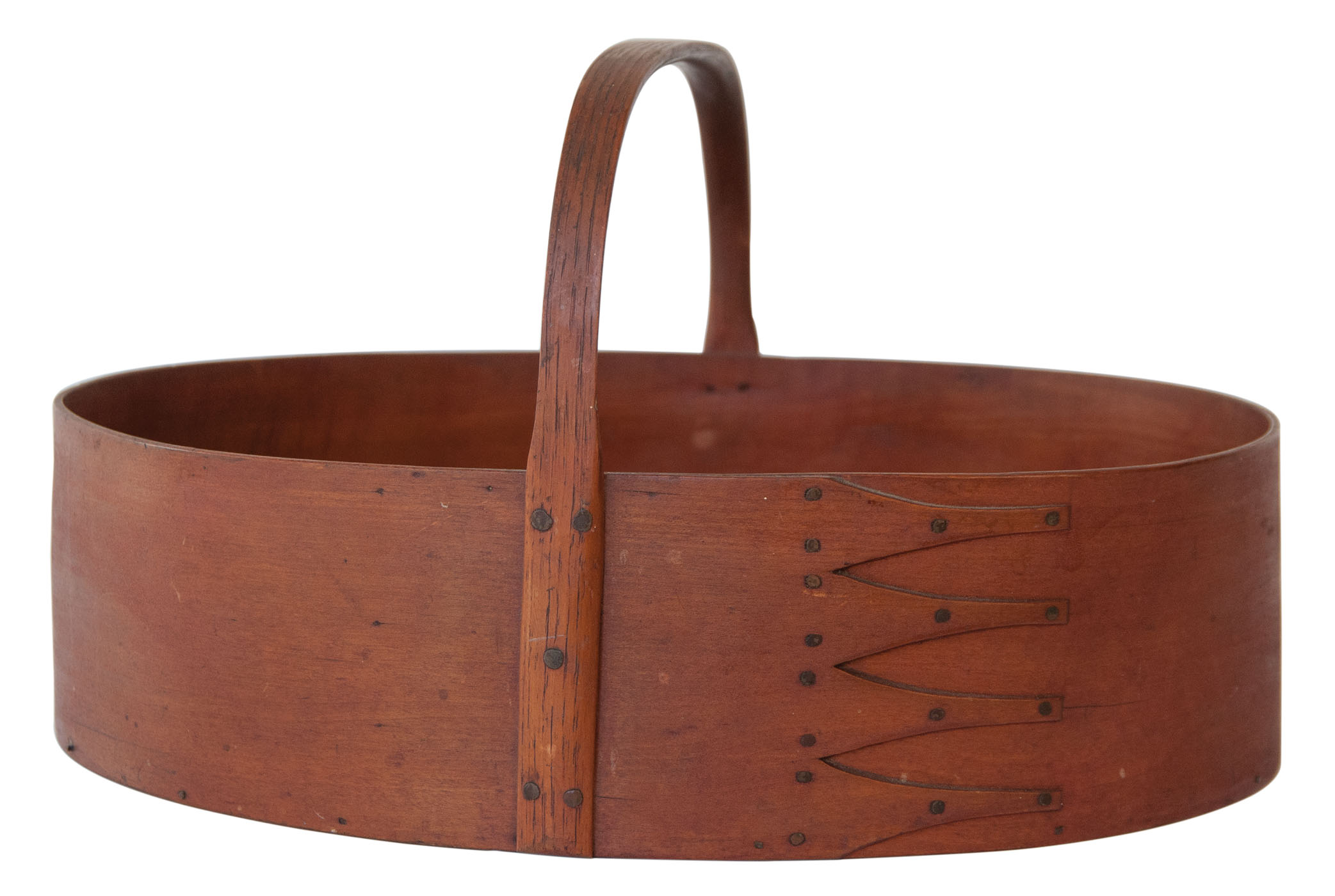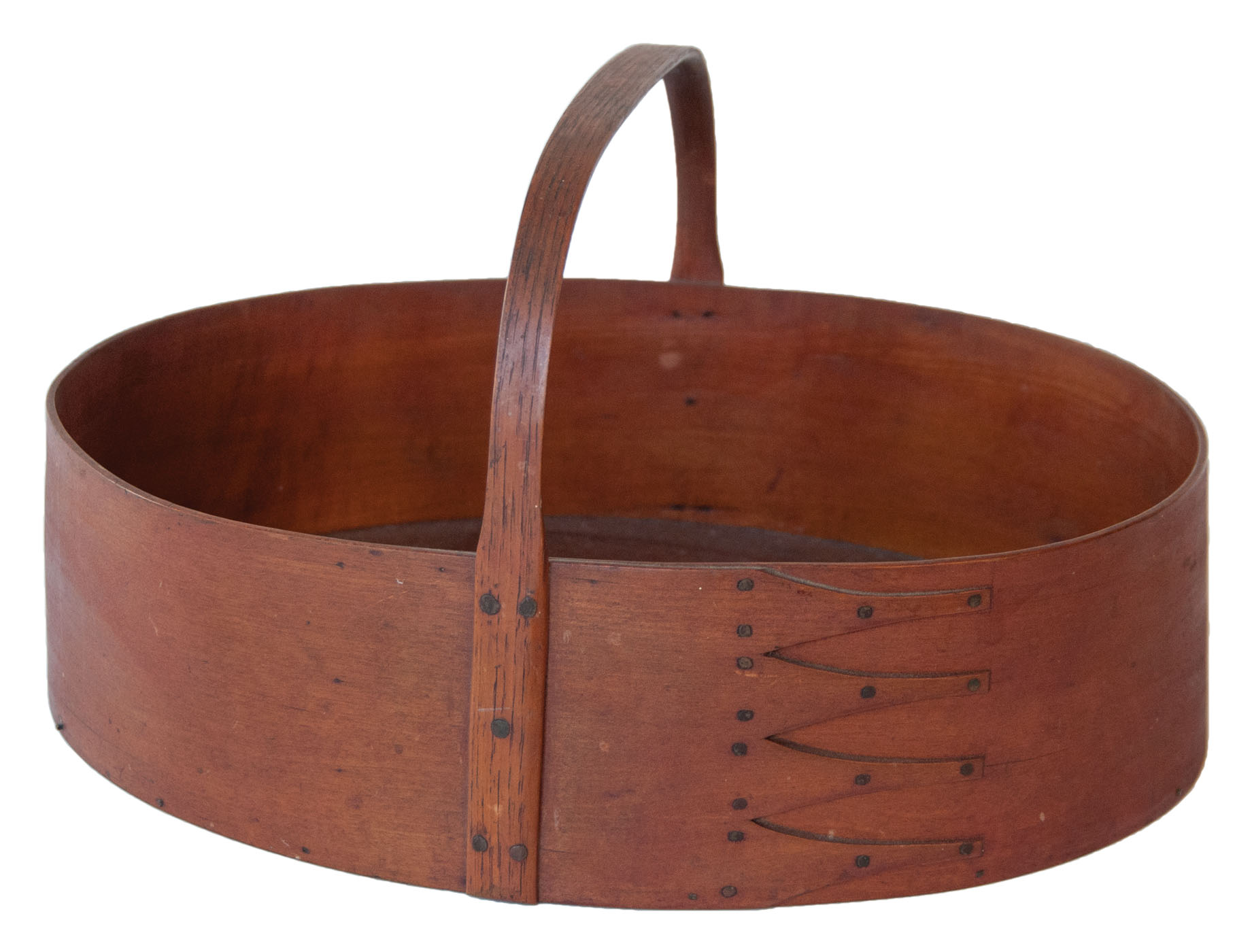 Maple, pine, bent hickory handle, original deep red stained finish on all surfaces, exceptional patina, four finely shaped fingers with symmetrically placed copper tacks, tagged in Ed Clerk's handwriting “Mt. Lebanon, NY Shaker carrier in completely original condition, c. 1840.”, (note: a classic Shaker oval carrier and one of the best), 8 1/2″ h (to top of handle), 14″ l, 10 1/2″ w, (ex. Ed Clerk).