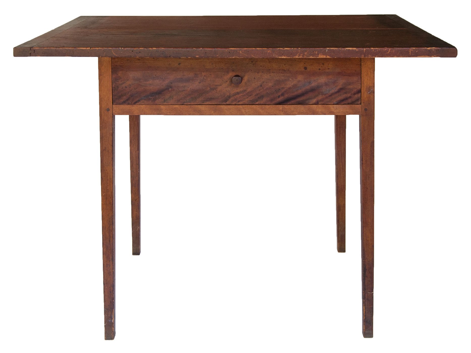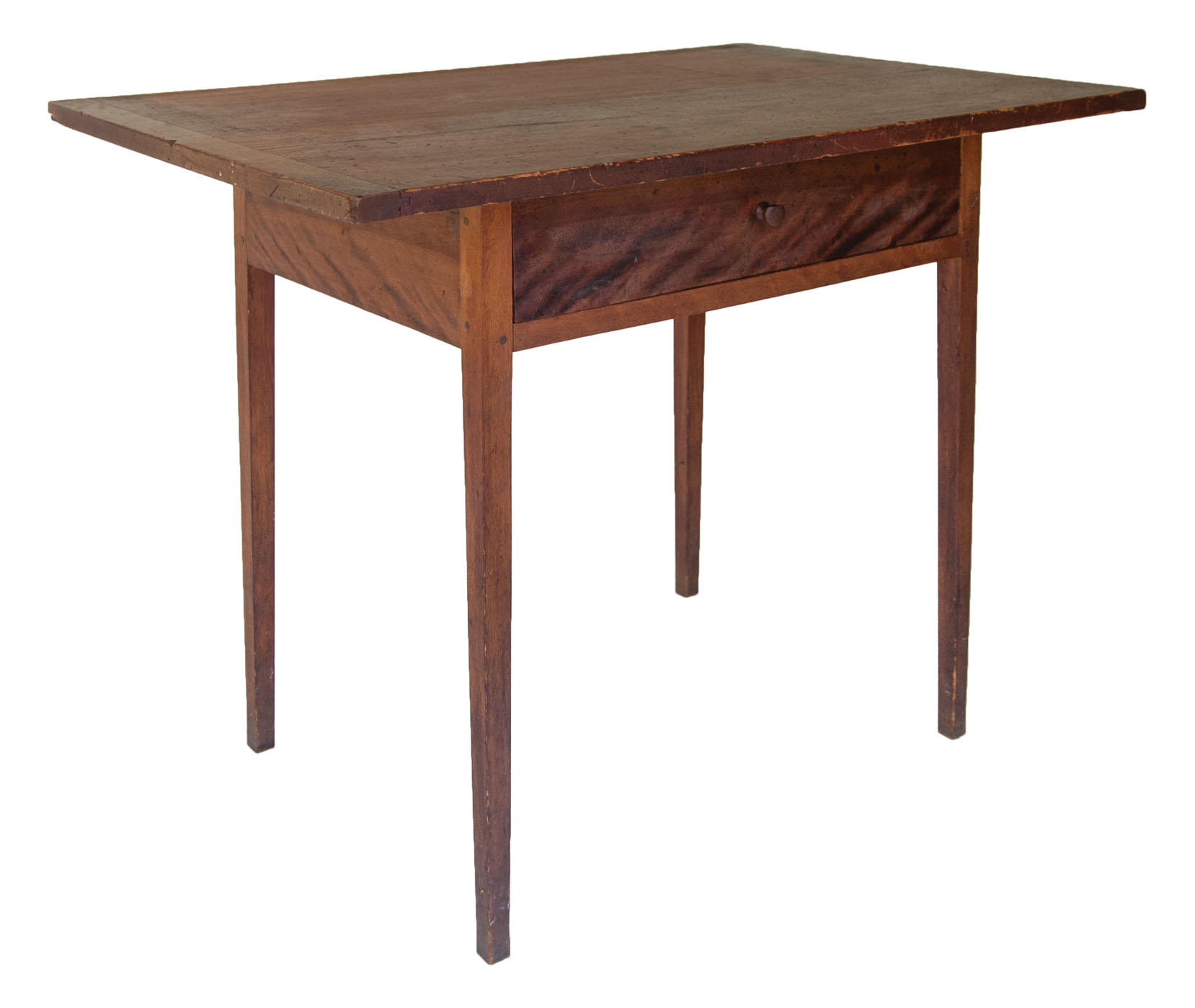Pine, birch and tiger birch, original red stained varnish finish, breadboard pine top, single drawer with tiger birch front, double partition interior, finely dovetailed, original hardwood pull (small piece missing), delicate square tapered leg, sold by Willis Henry Auctions, 1990, Robert's Collection, Shaker Farm, Canaan, NY, New Lebanon, NY, c. 1820-1830, 27 1/4″ h, 36 1/2″ w, 23 1/2″ d.