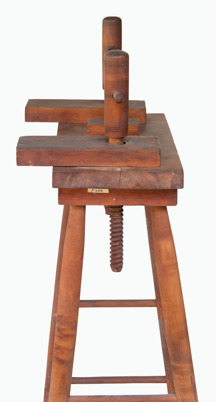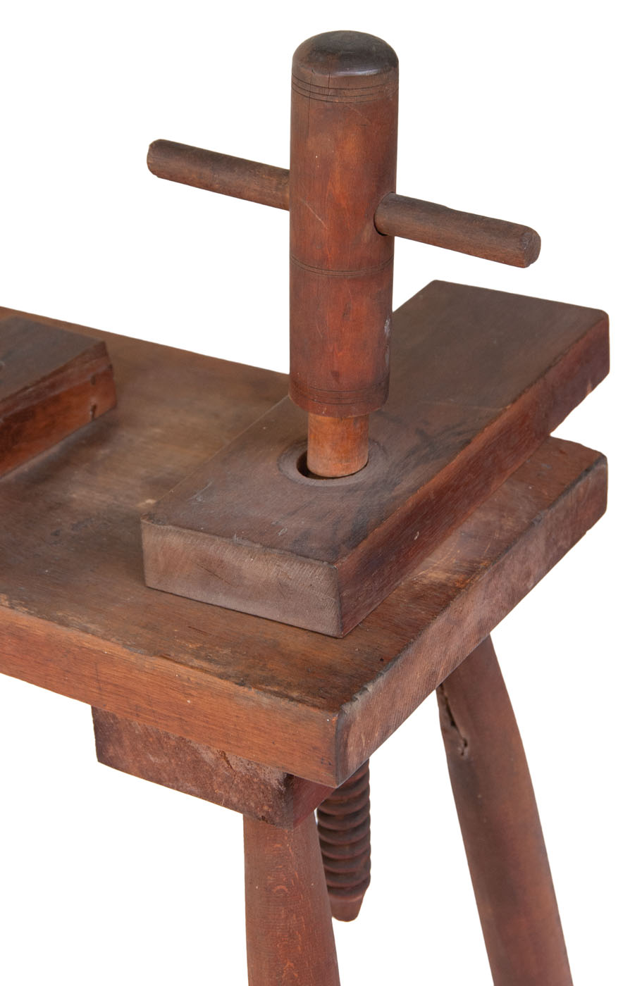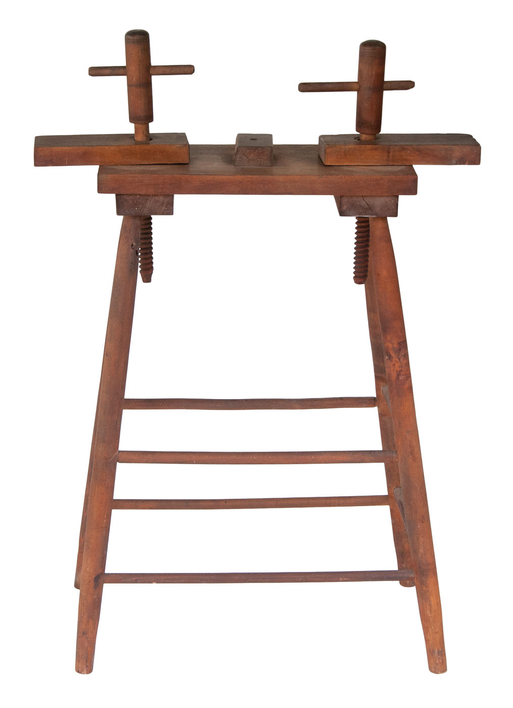 Maple and birch, original natural finish, two turned and threaded screw clamps through a rectangular platform, splayed and turned legs, eight turned stretchers, deaccessioned from a Massachusetts Historical House/Museum, Canterbury, NH, c. 1830-1840, 28 1/2″ h (to platform), 36″ h (to top of screw clamp), 17″ w (platform), 7 3/4″ d.
