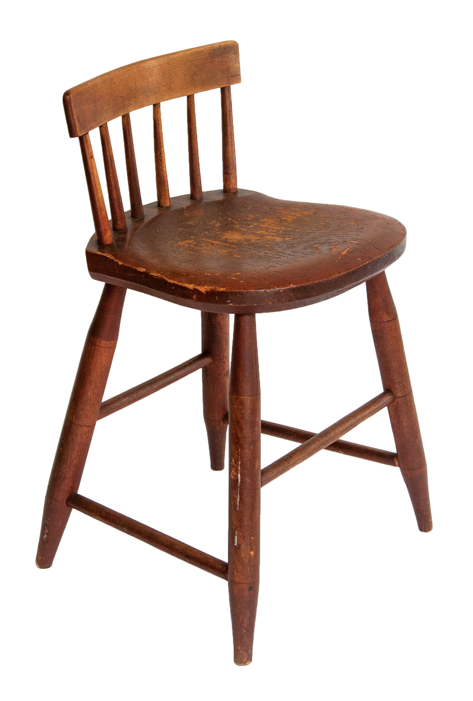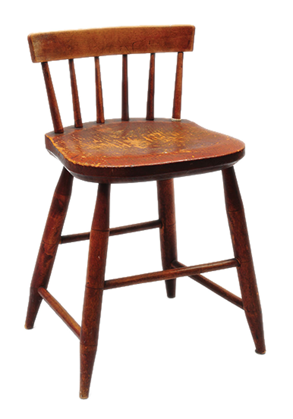 Pine, maple and birch, original red painted finish, low carved slat with six turned spindles, carved pine seat, turned and splayed legs with four stretchers, very fine condition, (sold at Willis Henry Shaker Auction, 1990, Lot 365), Canterbury, NH, c. 1840-1850, 17 1/2″ seat h, 24 1/2″ overall h.