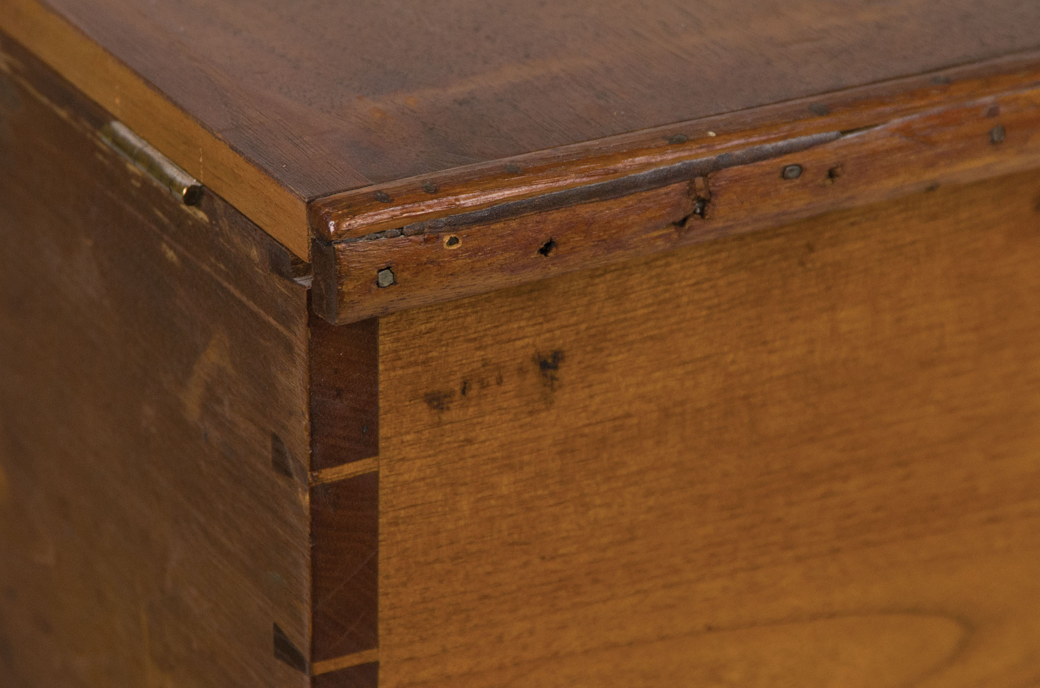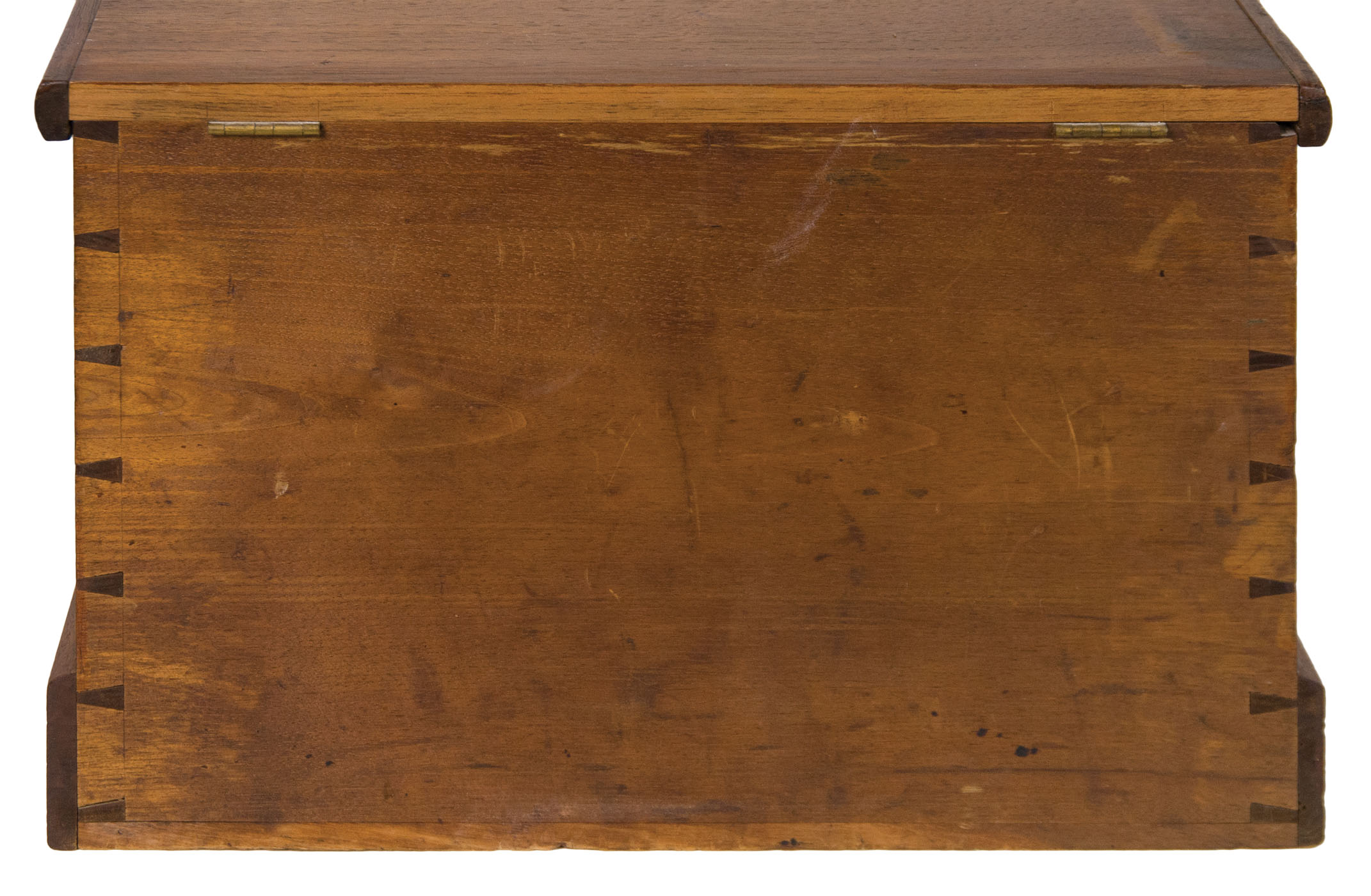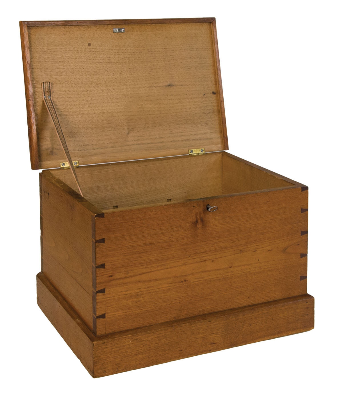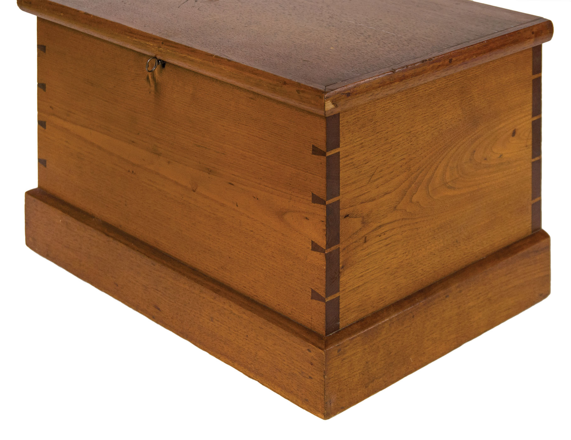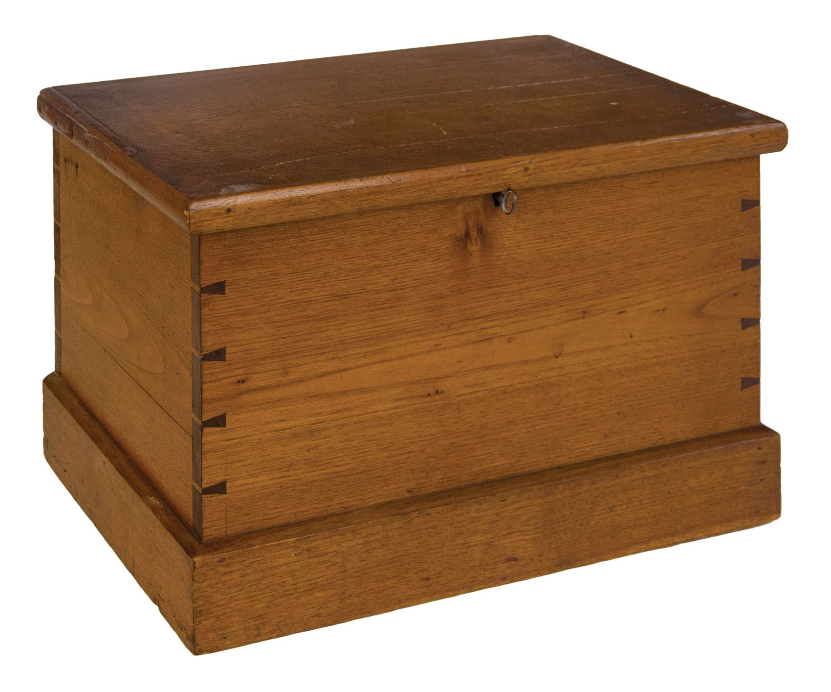 Butternut, original varnish finish, brass hinged lift lid with molded edge, held in a vertical position with Shaker tape on left side interior, very finely dovetailed case, original lock and key, applied molded base, 2 3/8″ h, 9 1/2″ overall h, 13 3/4″ w, 9 1/2″ d, (ex. Don Emerich collection).