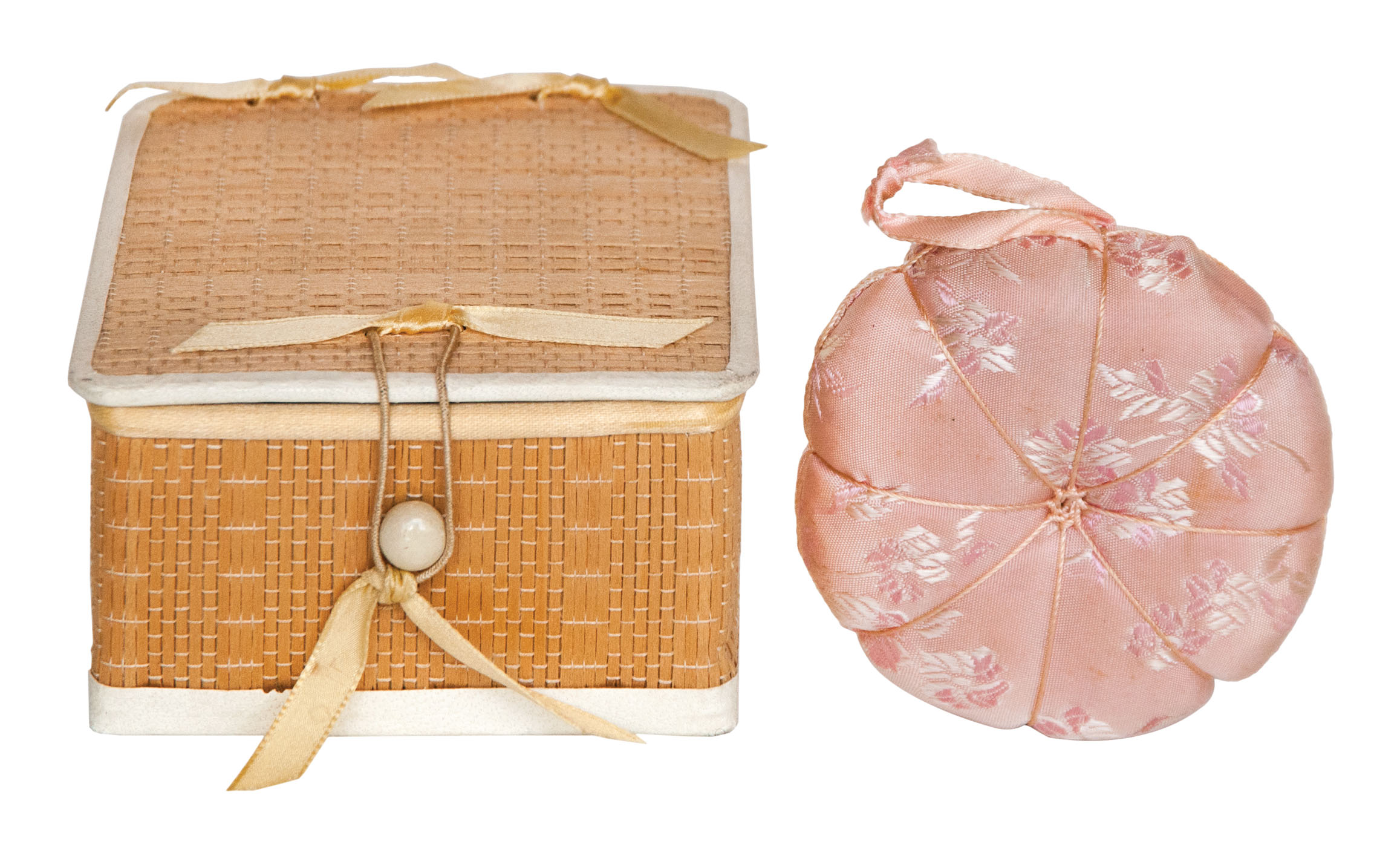 Trimmed in kid leather, tied with yellow silk ribbons, yellow silk lined interior with a separate pink silk tomato pincushion, stamped on bottom “Sabbathday Lake Shakers, Maine trademark”, 2″ h, 3 5/8″ sq.