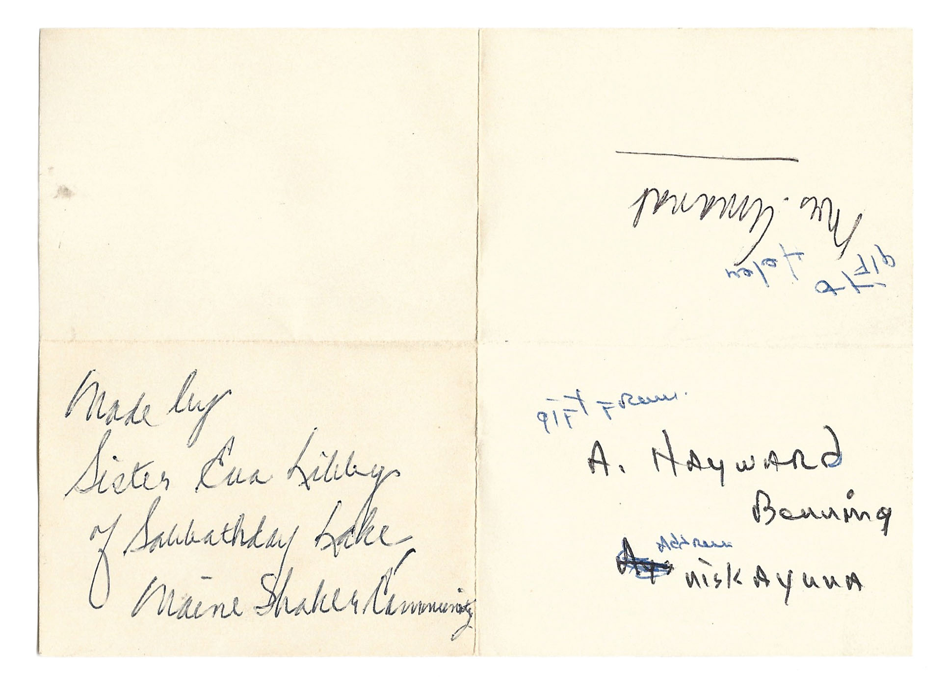 With gift card “Made by Sister Eva Libby of Sabbath Day Lake Shaker Community”, “Gift to Mrs. Helen Amanat, Gift from A. Hayward Benning, Niskayuna”.