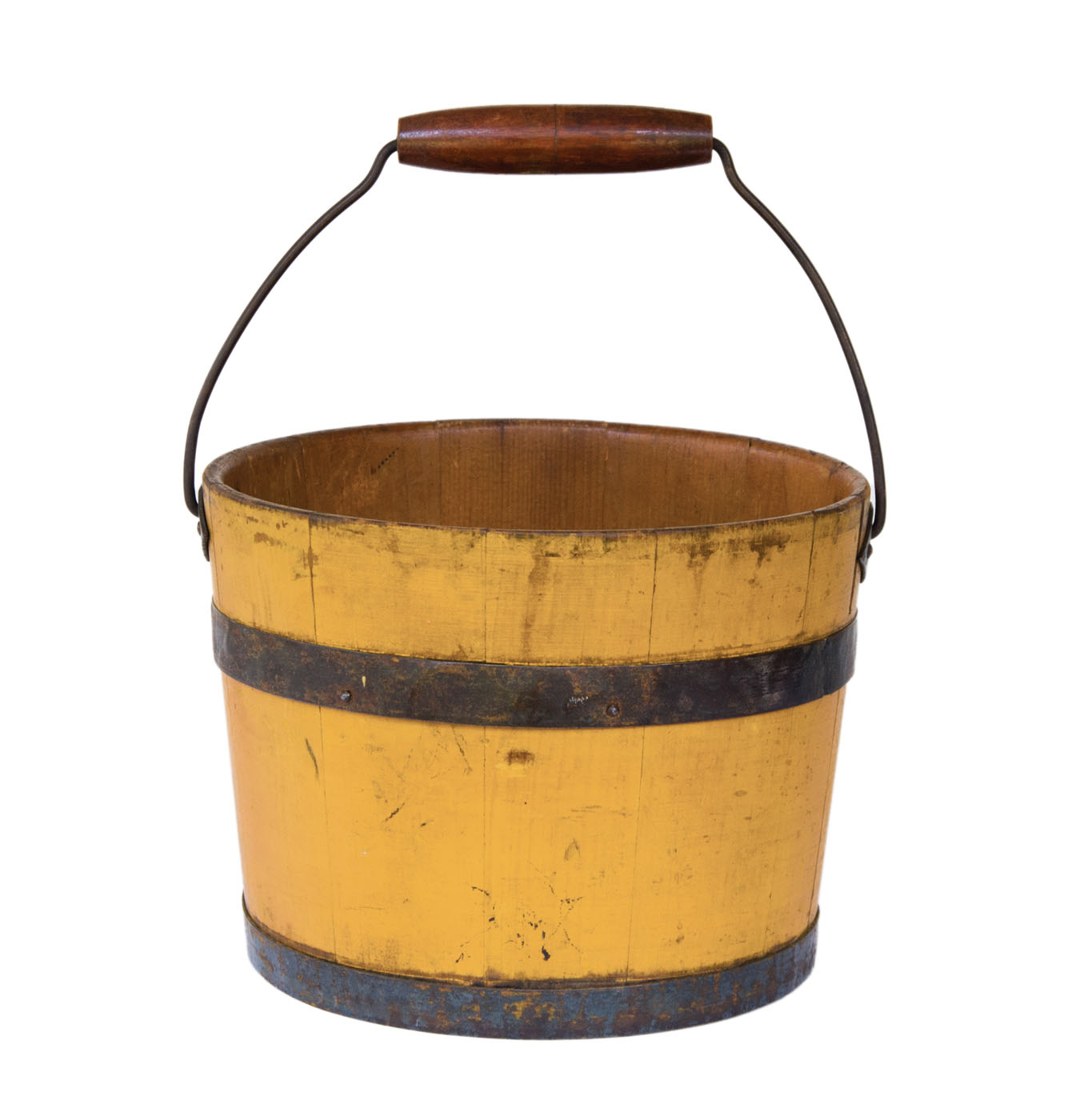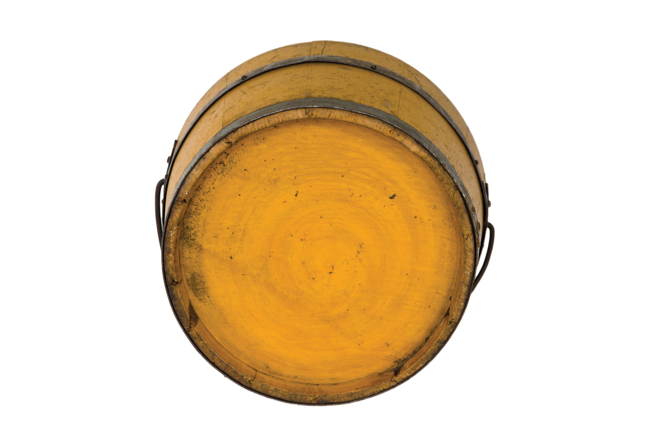 Pine, original chrome yellow painted finish, two wrapped iron bands with triangular shaped ends, steel bail with red stained turned birch handle, black diamond shaped bail plates, c. 1830-1850, 6 1/2″ h, 11″ h (to top of handle), 8″ dia.