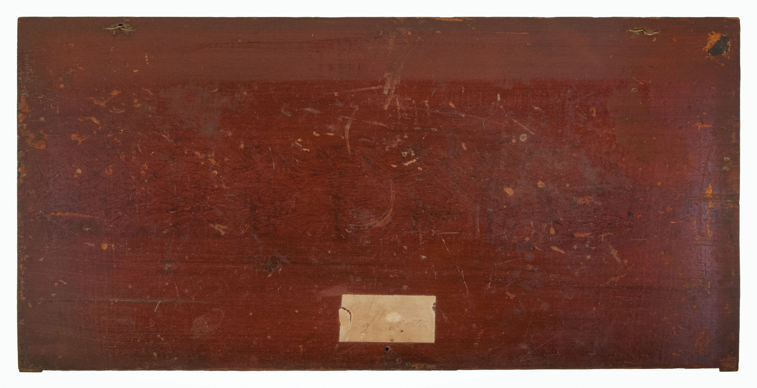 Pine, original red painted finish, Shaker paper label on front “Shakers Genuine Garden Seeds, Mount Lebanon, N.Y.”, small handwritten label on top in pencil “J Hay, Easton”, (probably the merchant who sold the seeds), interior label under lid is missing, sectioned interior with labels for seed packets “Beets, Carrots, Sage and Pepper, Tomato Flowers, Corn” are intact, wire hinged lid, overall good condition, 3 1/2″ h, 23 3/8″ w, 11 1/2″ d, (ex. Fertig collection).
