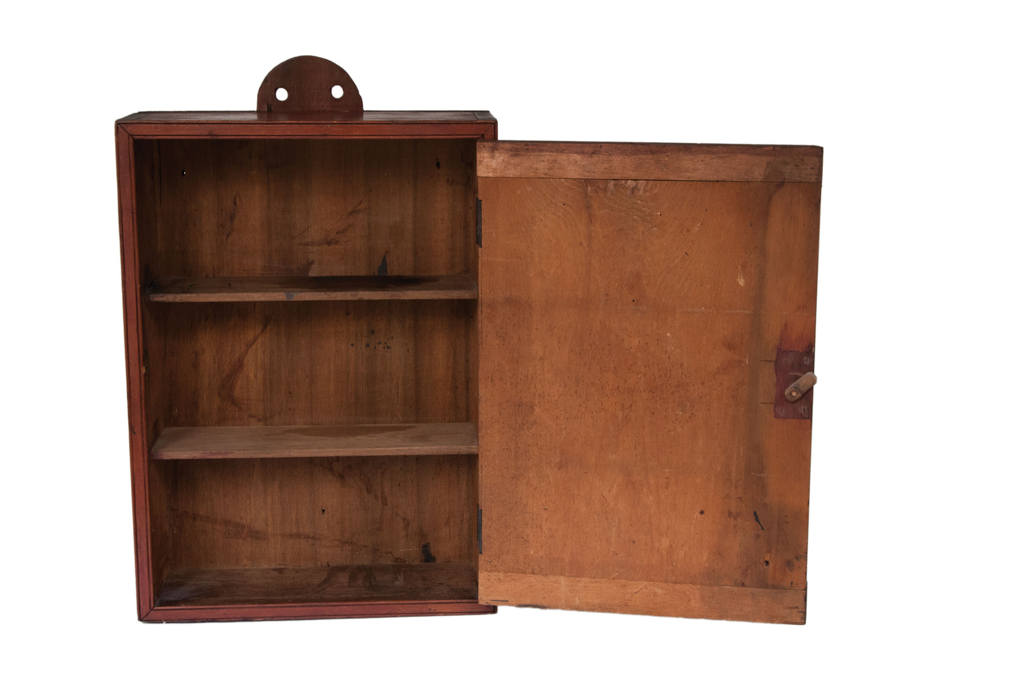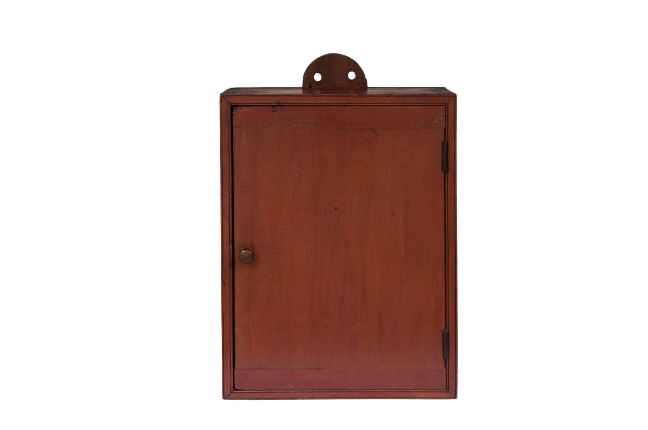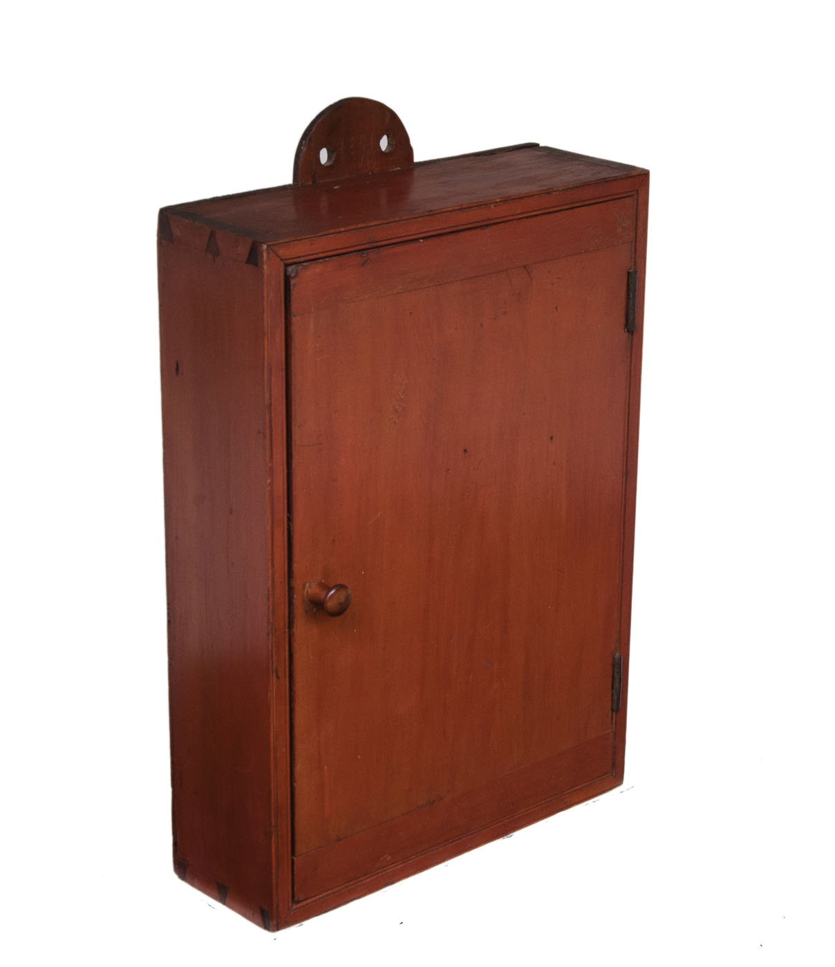 Pine, original red painted finish, backboard extends beyond the top in a half-round shape with two holes for hanging, dovetailed case, single breadboarded drawer with turned cherry wood pull, with carved twist for door catch (replaced the original lock), double thumbnail molding around the door frame, three-shelf interior, 24 3/4″ h, 16″ w, 5 1/2″ d.
