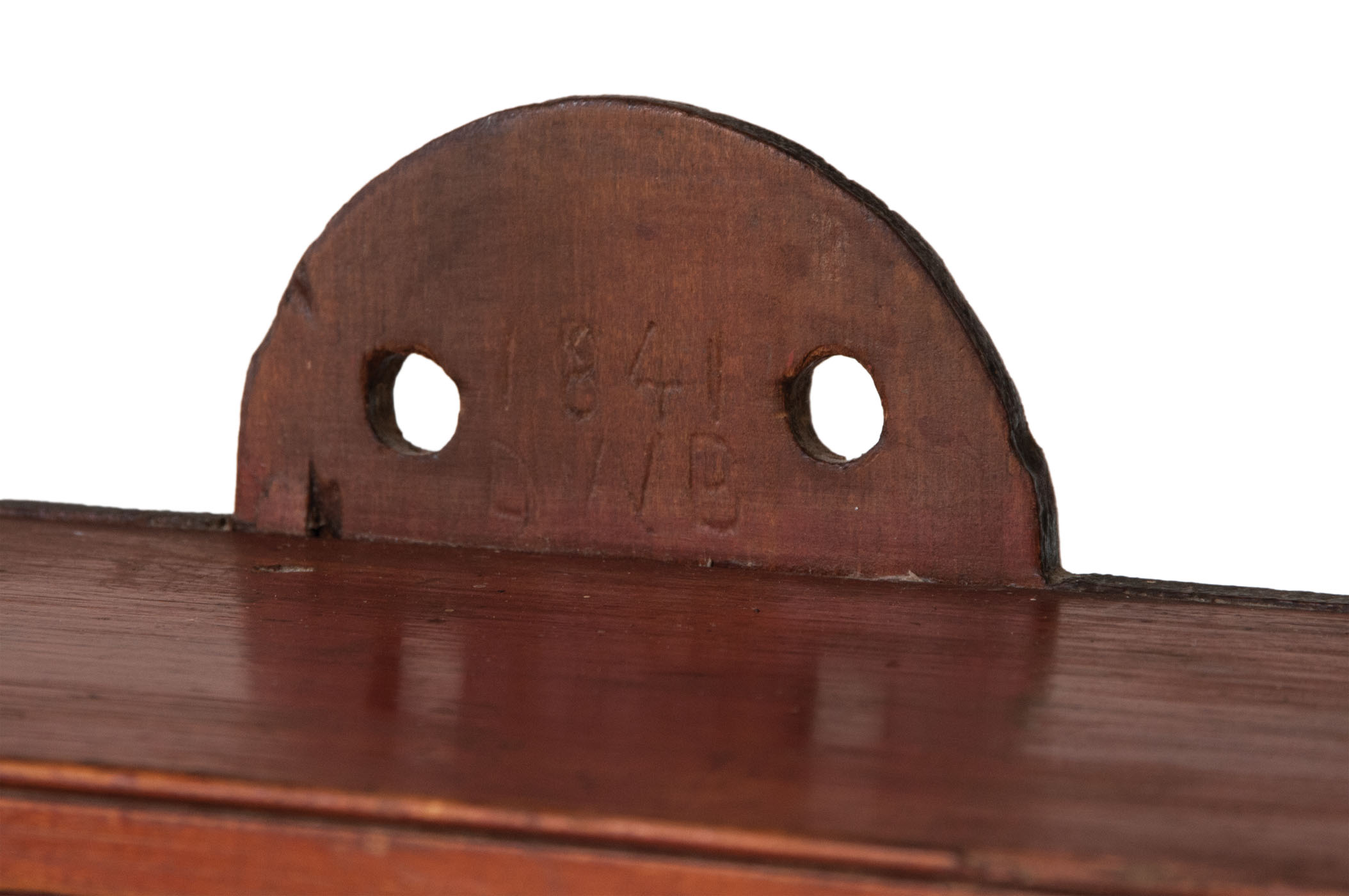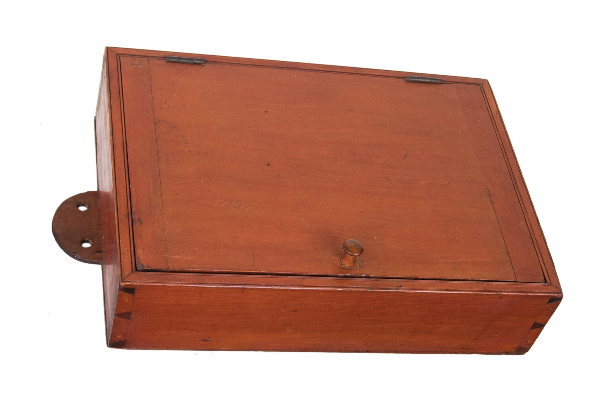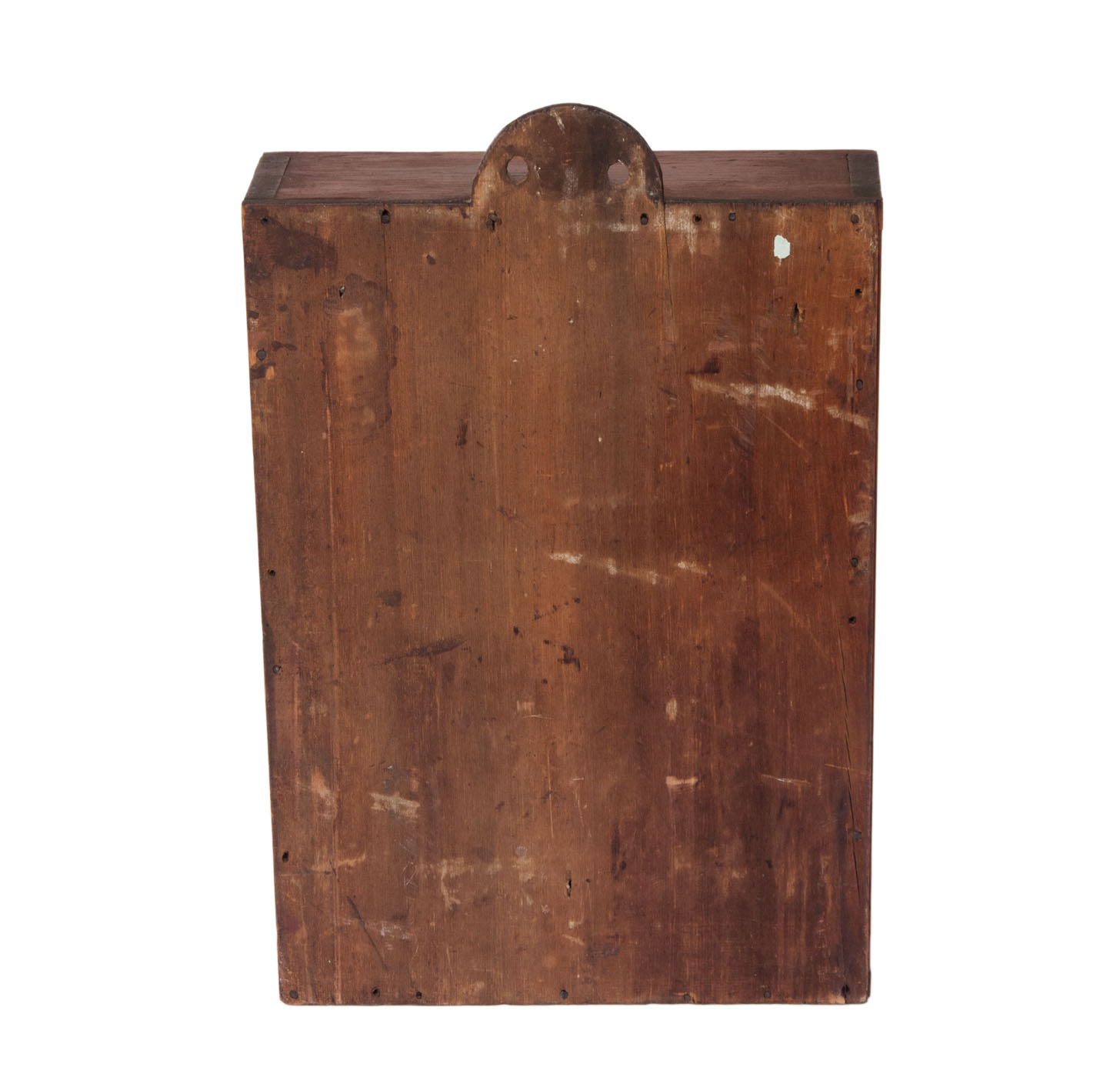 Pine, original red painted finish, backboard extends beyond the top in a half-round shape with two holes for hanging, dovetailed case, single breadboarded drawer with turned cherry wood pull, with carved twist for door catch (replaced the original lock), double thumbnail molding around the door frame, three-shelf interior, 24 3/4″ h, 16″ w, 5 1/2″ d.