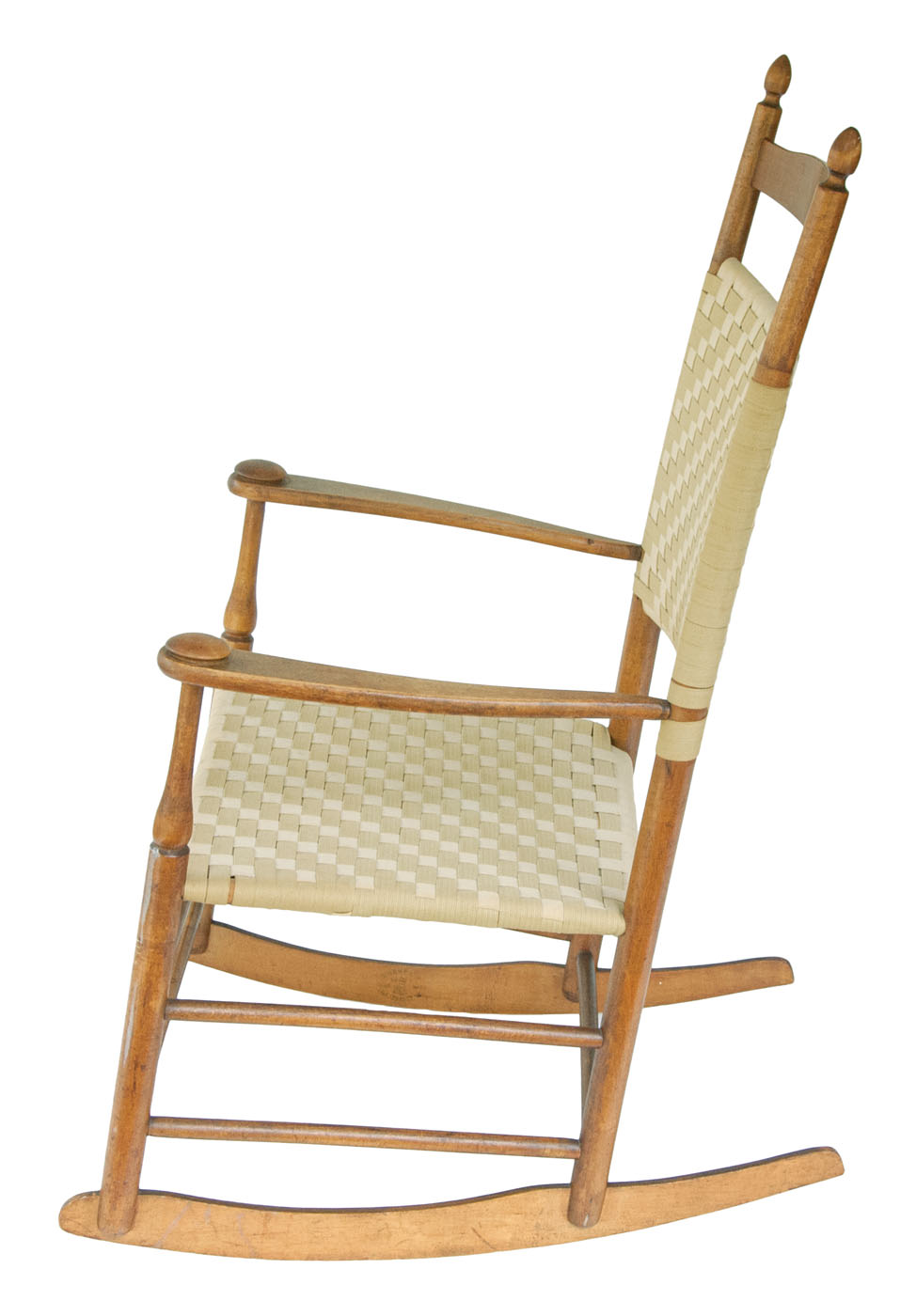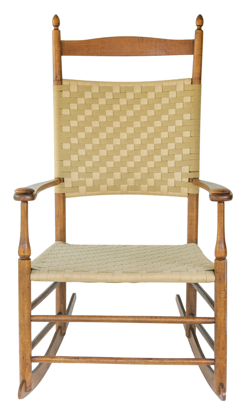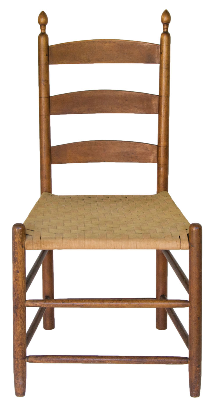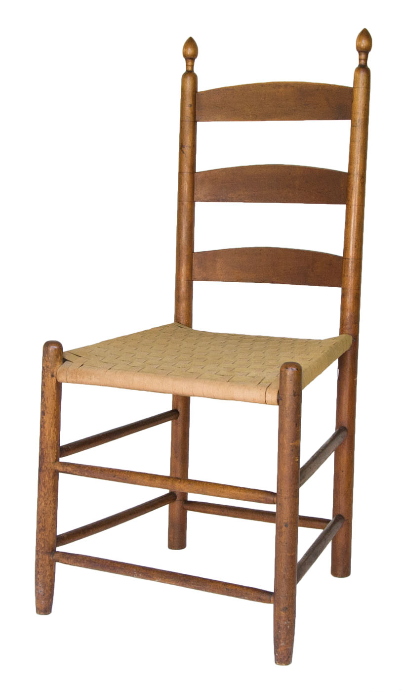 Maple, old natural finish, acorn finials, tiger maple slat over beige and green taped back and seat, birch curvilinear arms with flattened mushroom caps, Shaker oval Trademark inside left rocker “7”, “Mt. Lebanon, N.Y.”, 15″ seat h, 40″ overall h; New Lebanon community side chair, maple, original rust brown stained finish, three shaped slats, tilters on back stiles, beige and green taped seat, New Lebanon, NY, c. 1840-1850, 16 1/2″ seat h, 36″ overall h.