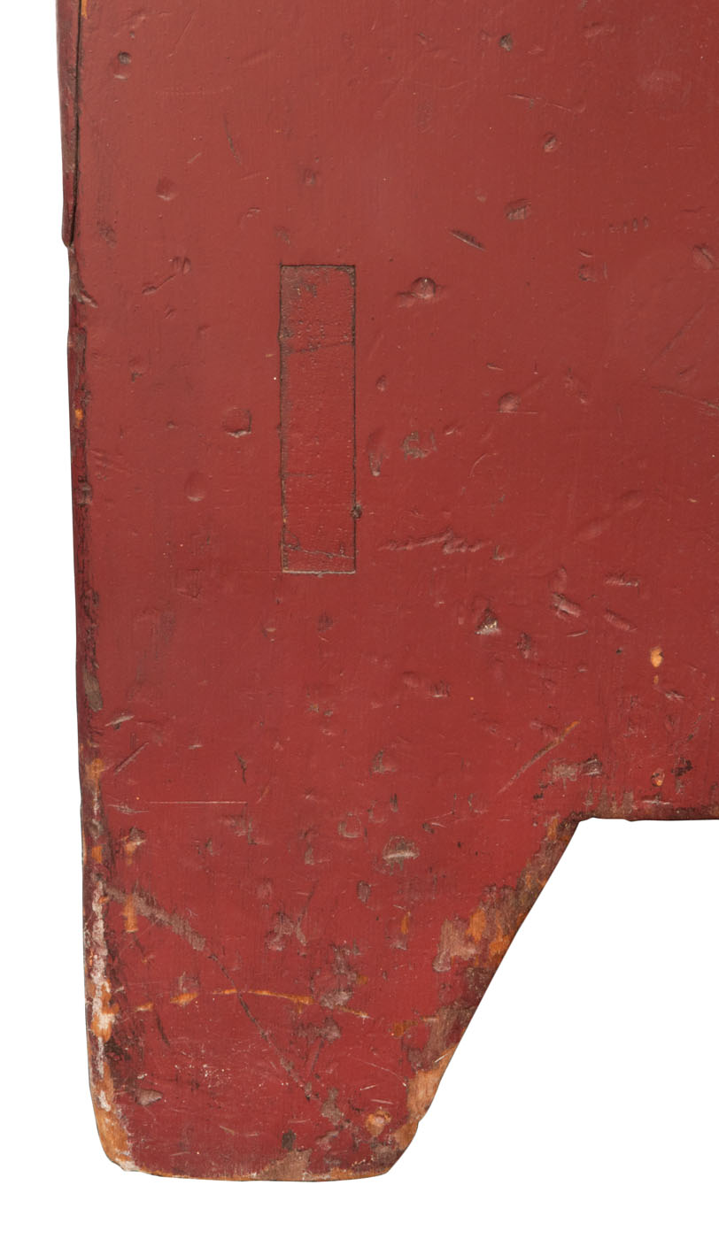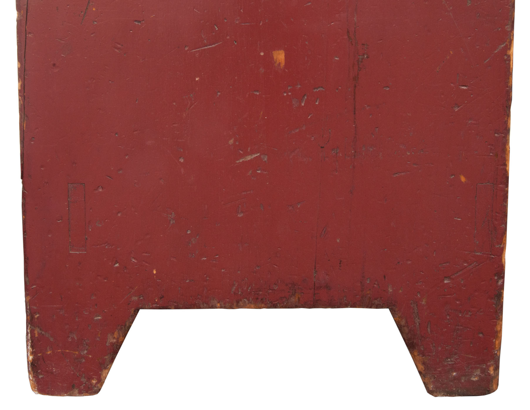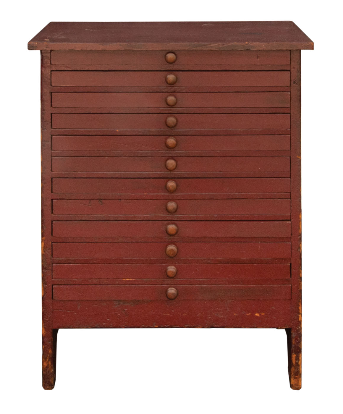 Pine case in original burgundy red painted finish, twelve cherry wood drawers, pine drawer bottoms symmetrically nailed, single cherry wood pulls, single board sides terminating in a canted foot, lower facing and rear boards through mortised into each side, c. 1840-1850, 36″ h, 26″ w, 19″ d.