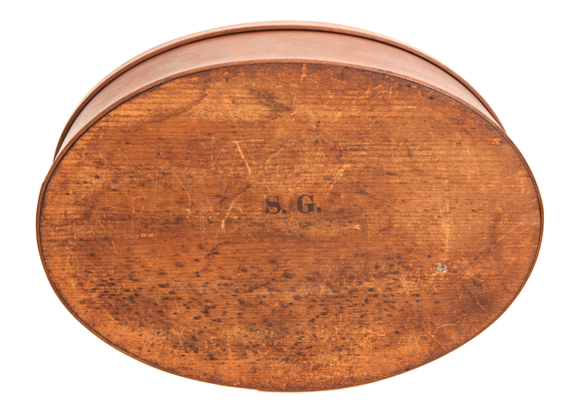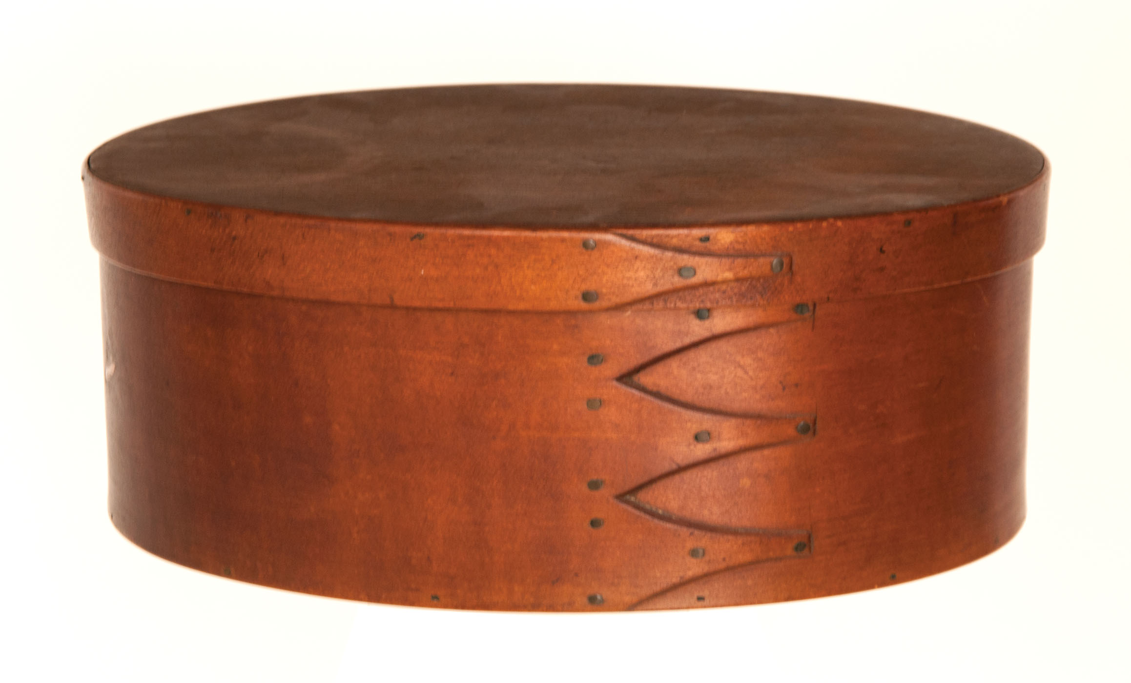 Pine and maple, original brown stained finish, four fingers, small symmetrically placed copper tacks, stamped on bottom “S.G.”, excellent condition, Enfield or Canterbury, NH, c. 1820-1830, 4 3/4″ h, 11 3/4″ l, (ex. William Moore collection).