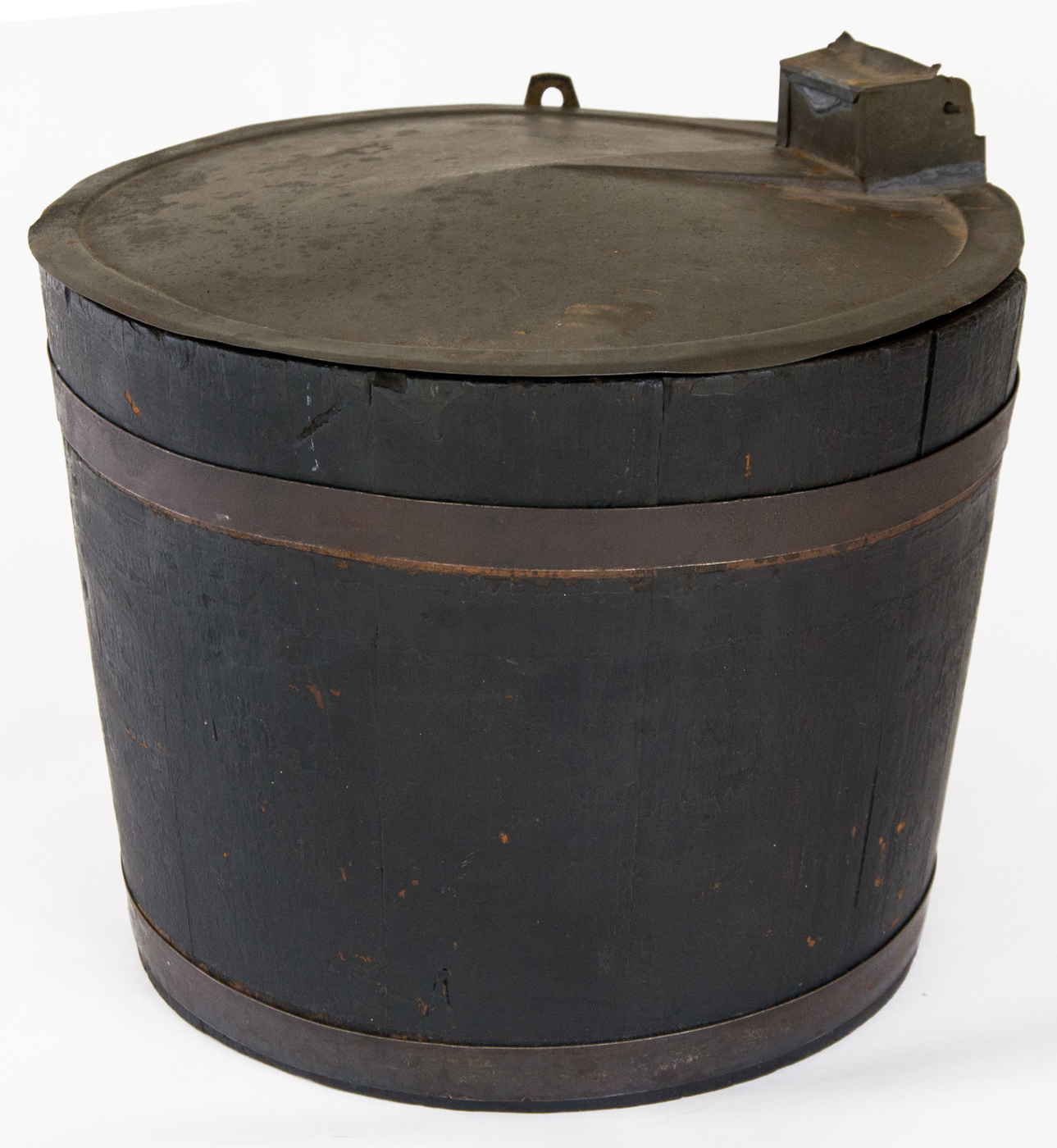 This rare 19th c. pail has the original conical shaped tin lid, patent dated “Aug 17, '99”, and a “Certificate of Authenticity from the Society of Shakers, New Gloucester, Maine”.