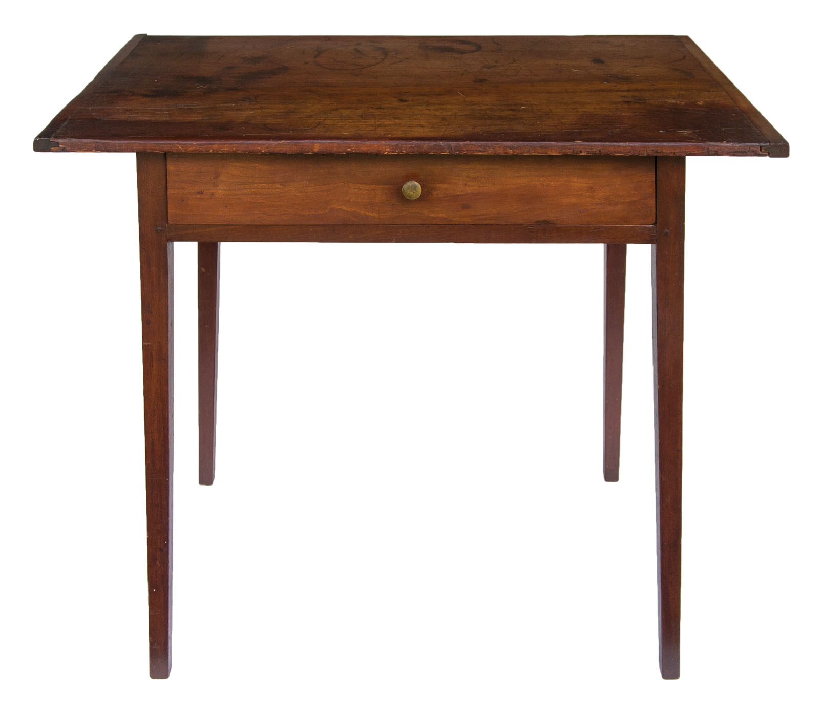 Cherry and pine, traces of original red stained finish, breadboard top, single dovetailed drawer with original brass pull, two small brass knobs, one on each side, probably to hold scissors or other sewing utensils, top shows a repaired line in front, Hancock, MA, c. 1830-1840, 25 1/2″ h, 30 1/4″ w, 18 1/2″ d, (ex. Don Emerich collection).