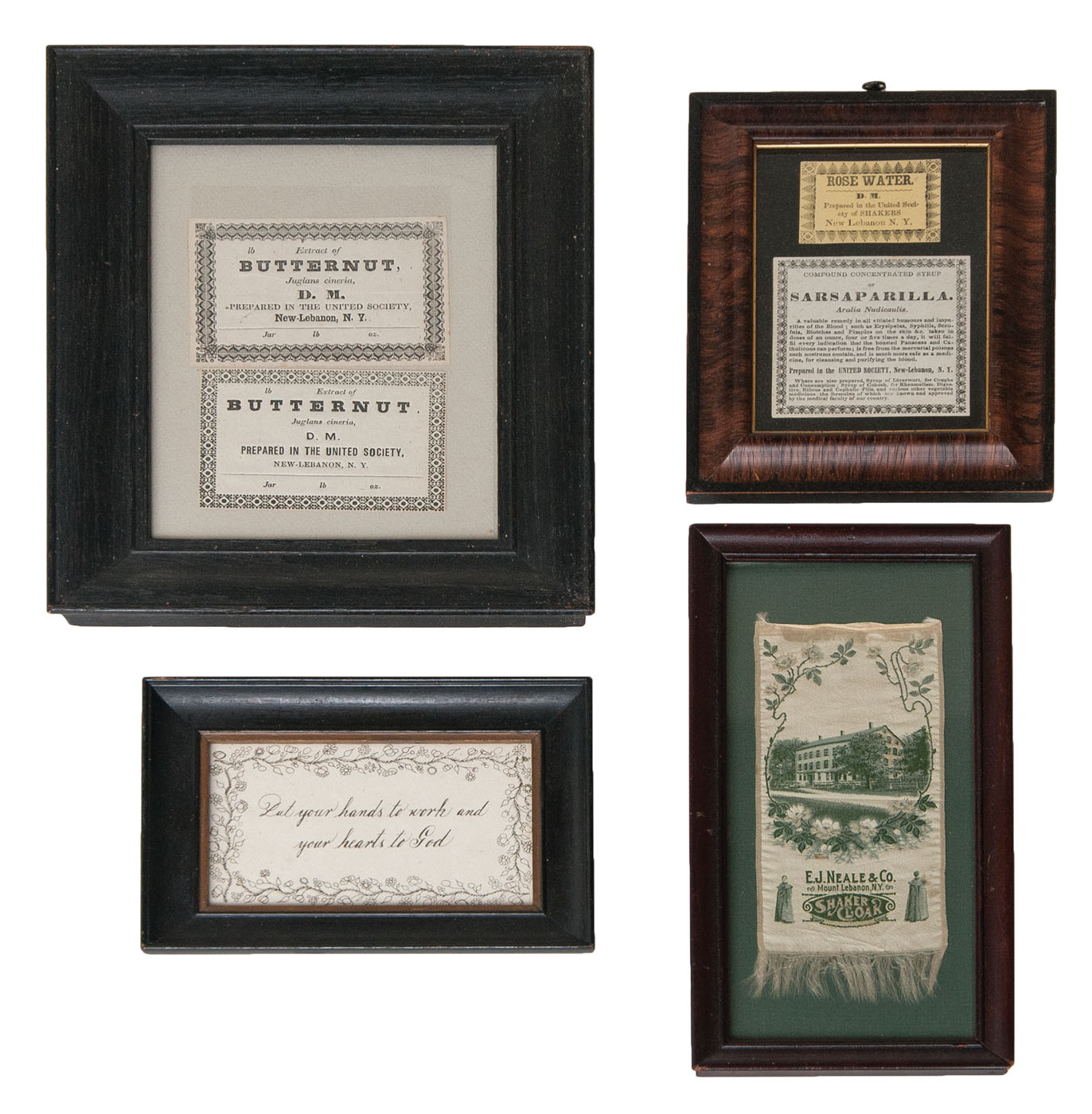 “Extract of Butternut, D.M., Prepared in the United Society, New-Lebanon, N.Y.” (2); “Rosewater, D.M.,…New Lebanon, N.Y.” on yellow paper, and “Sarsaparilla…Prepared in the United Society, New Lebanon, N.Y.” on white paper; Green on silk advertising bookmark, “E.J. Neale & Co of Mount Lebanon, N.Y., Shaker Cloak”; 20th c. printed saying: “Put your hands to work and your hearts to God.”
