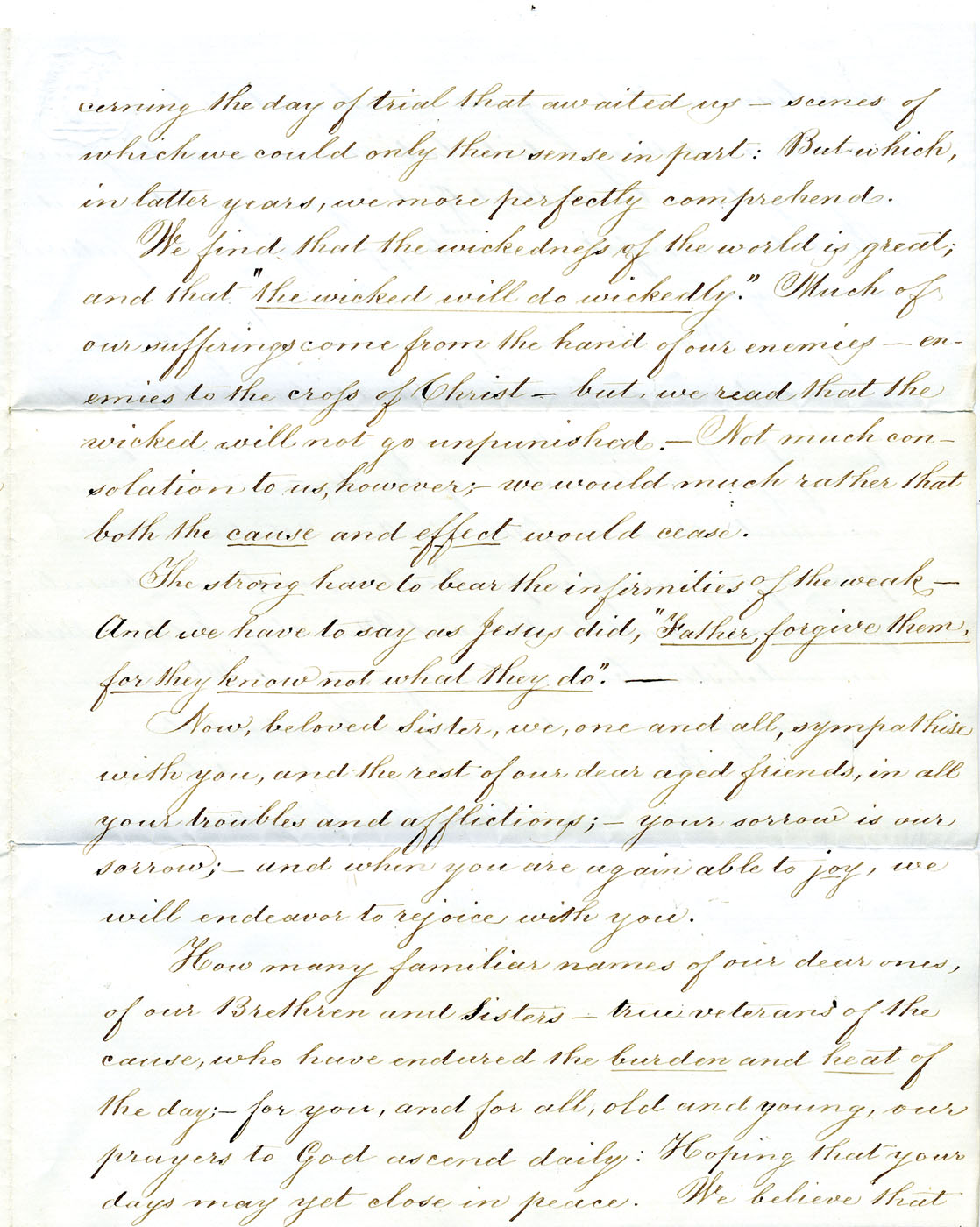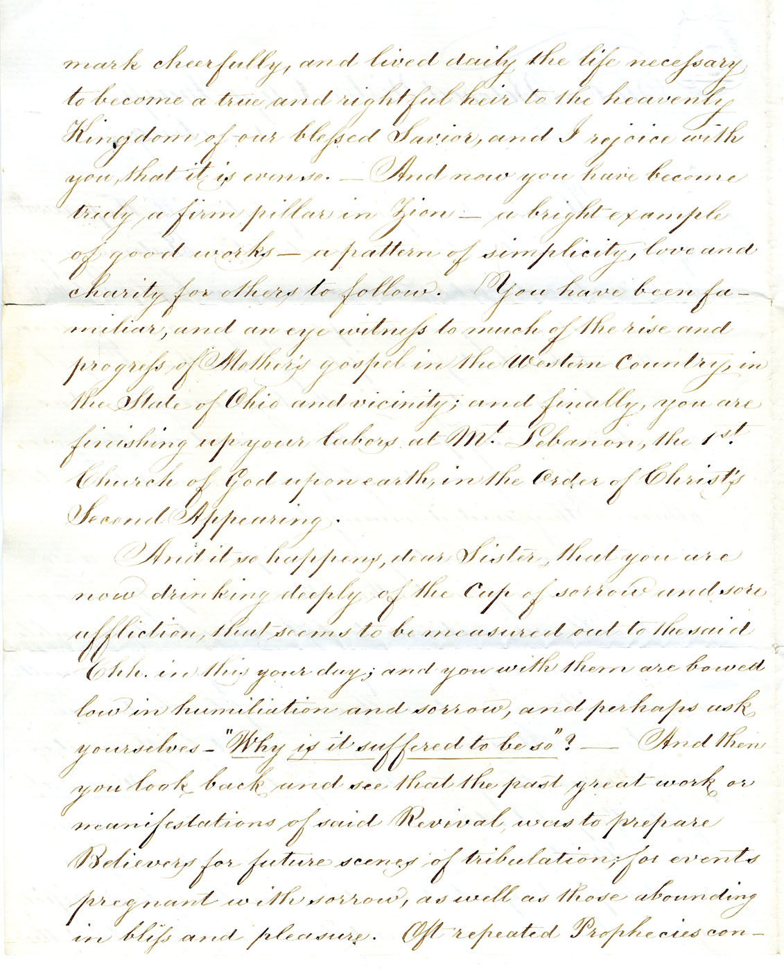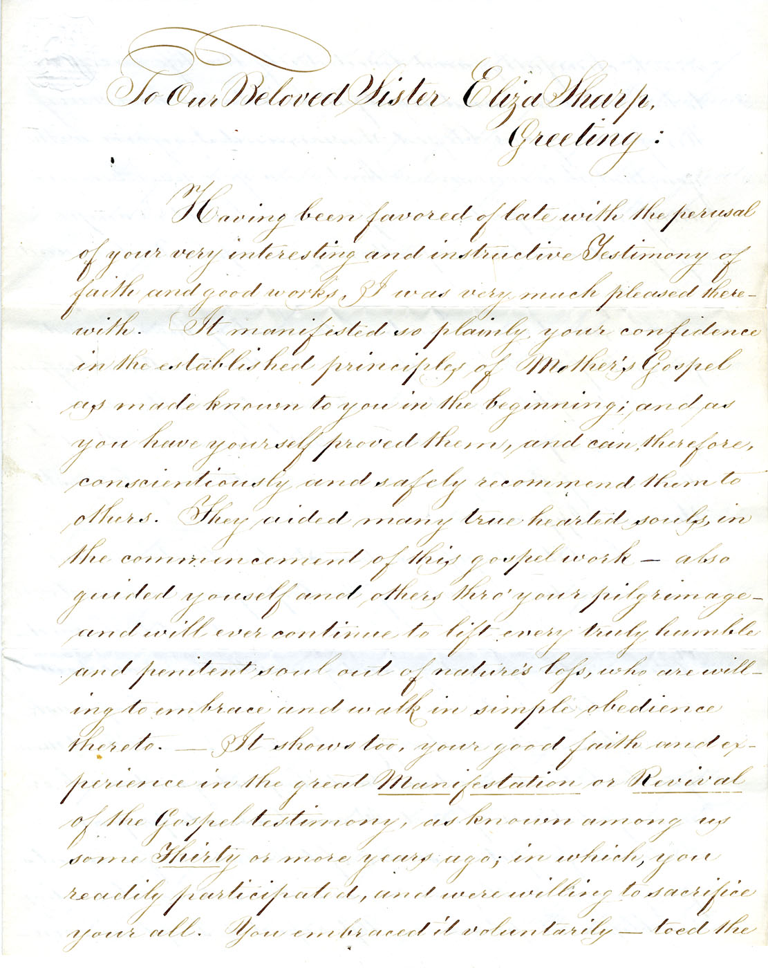 Dated March 17th 1875, and written on Carson's Congress stamped paper, between Sister Eliza Sharp of Mt. Lebanon and Brother D.A. Buckingham of Watervliet, NY, folded in half and with further tri-fold, minor toning along edges, some small fold separations along outer and inside edges, Brother Buckingham is commenting on Sister Sharp's “instructive Testimony of faith and good works”, and mentions that they “…will ever continue to lift every truly humble and penitent soul out of nature's loss, who are willing to embrace and walk in simple obedience thereto.”, very good condition, 9 3/4″ x 7 3/4″ (folded).