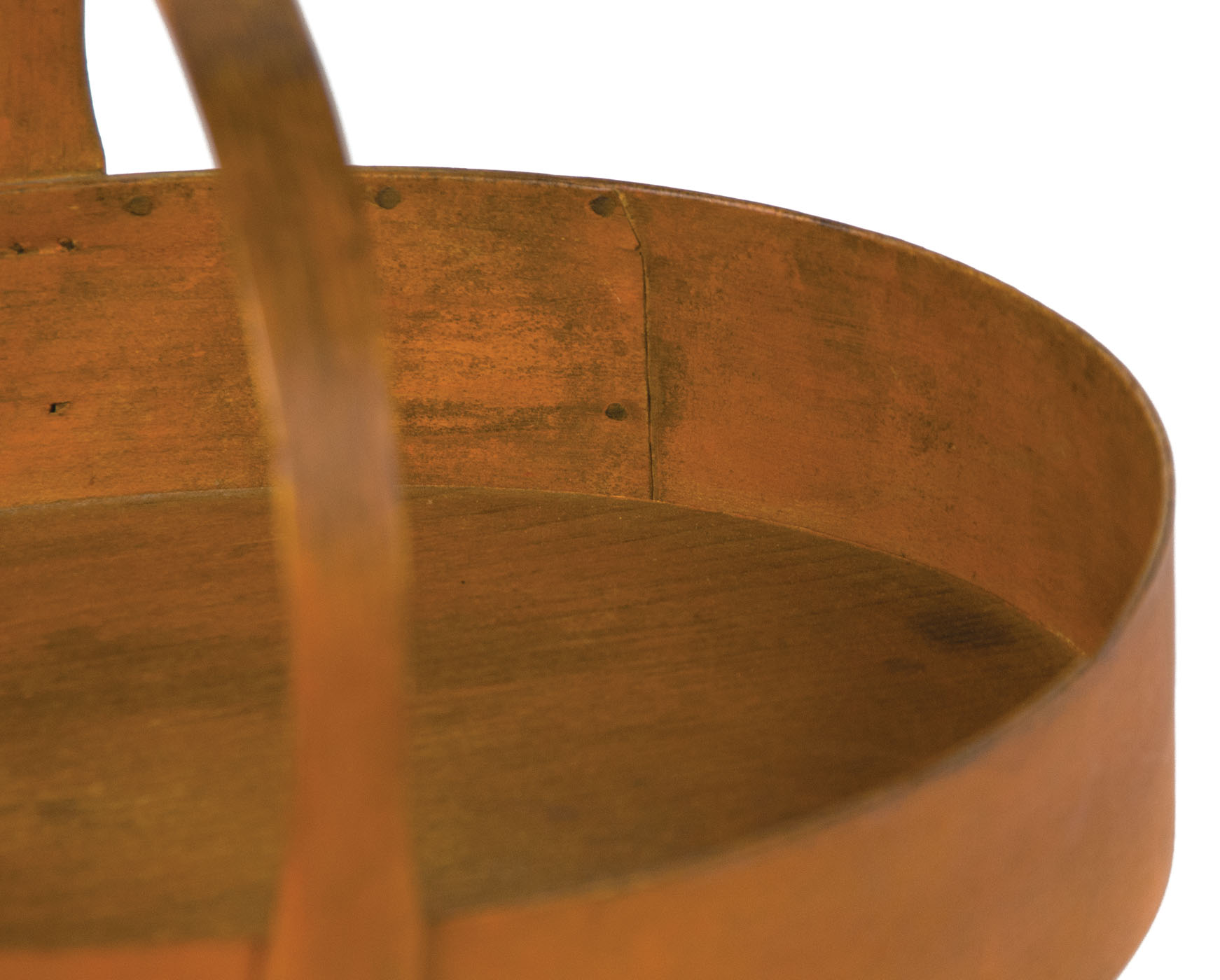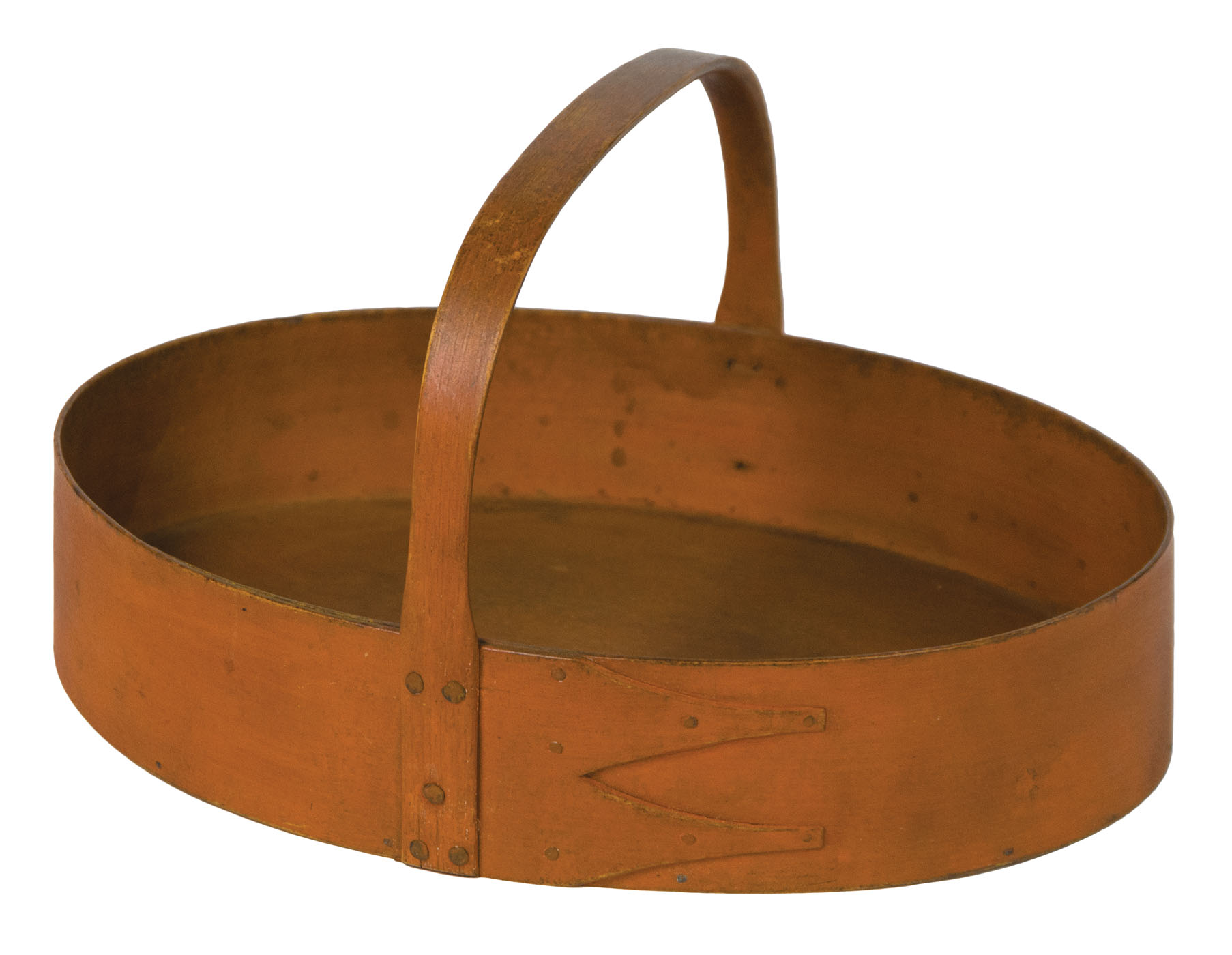 Pine and maple, original orange painted finish, very finely shaped fixed hoop handle attached with five copper head tacks on both sides, two fingers, c. 1830-1840, found near Enfield, NH, 2 1/4″ h (to rim), 6″ h (to top of handle), 10 3/4″ l, 8″ d, (ex. Ed Clerk collection).