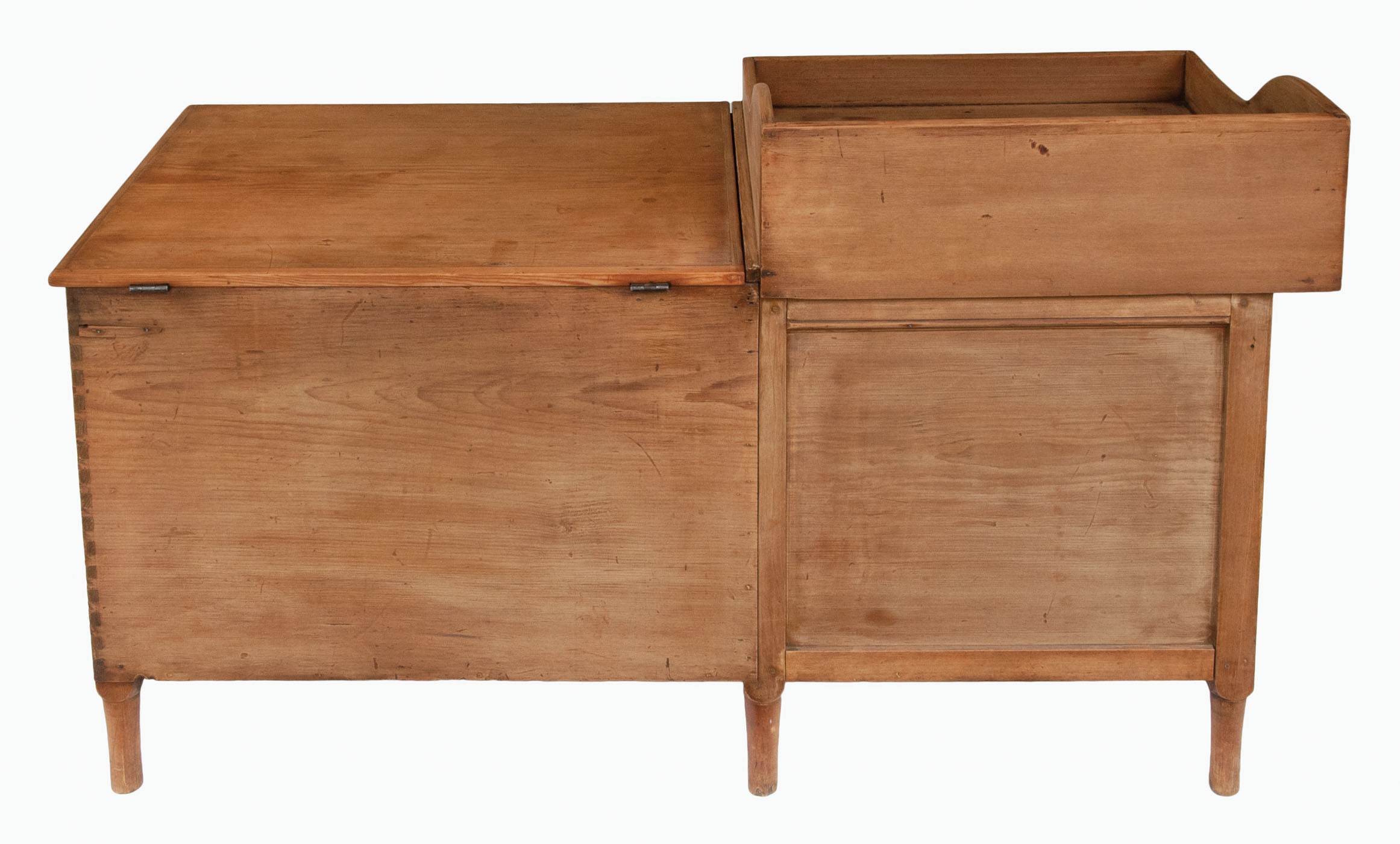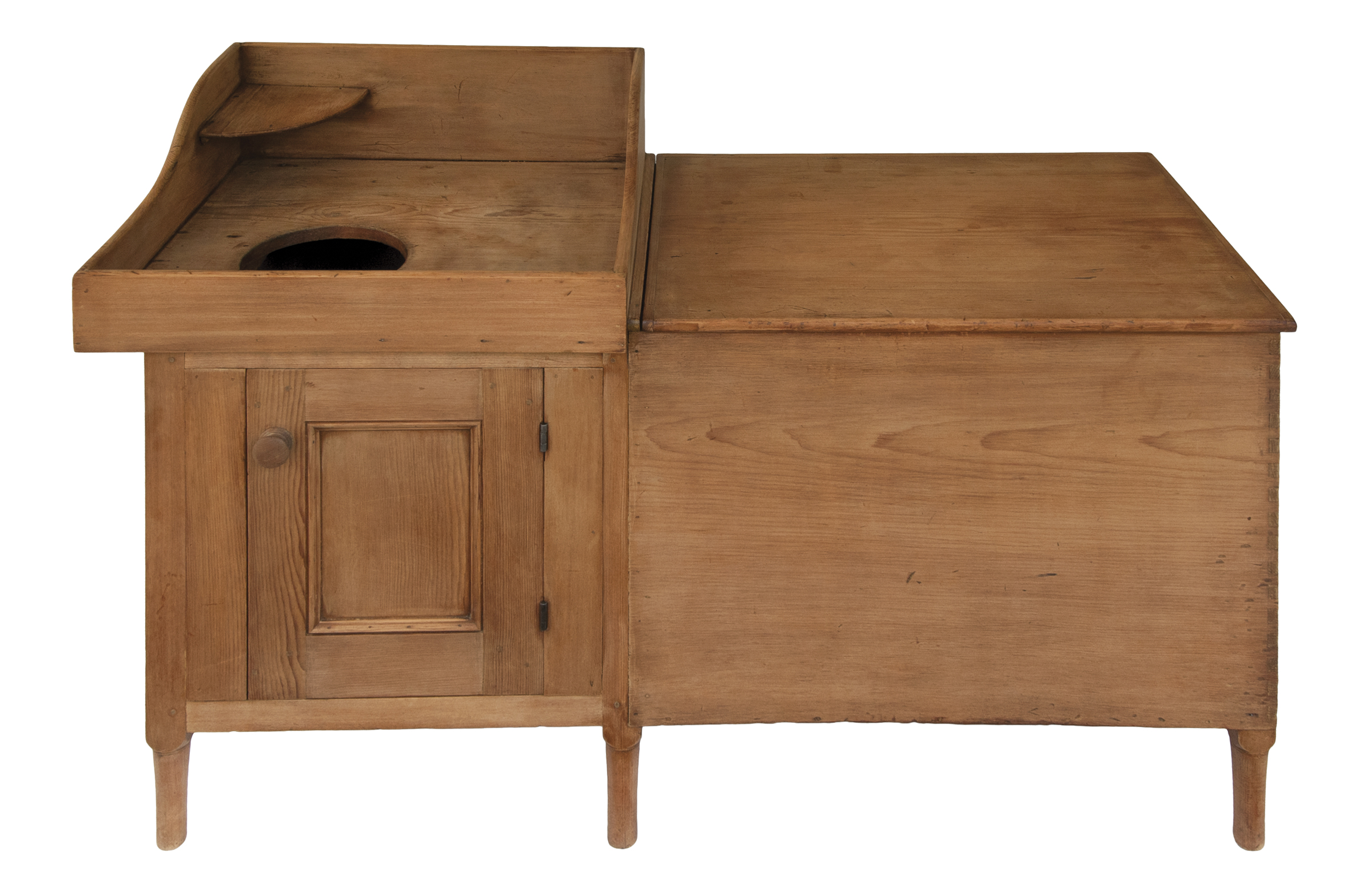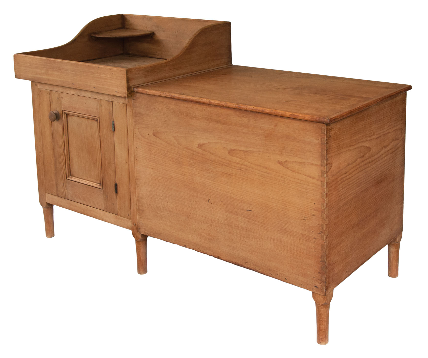 Pine, refinished (this was originally painted chrome yellow), top with shaped sides, raised front and backsplash, circular cutout for wash bowl, and a corner shelf on left side, above an inset panel door with applied molding, through mortise and double diagonal pegged, paneled ends with applied molding, all on a turned leg, with unique pine attached blanket box with single breadboard lid (25 1/2″ h, 27 3/4″ l, 20 1/2″ d), supported on turned legs, (original painted red on interior), chamfered interior corner extensions develop into the turned feet, finely dovetailed construction on right side, c. 1840-1850, 32″ h (wash stand), 51 1/2″ l (overall), 21″ d.