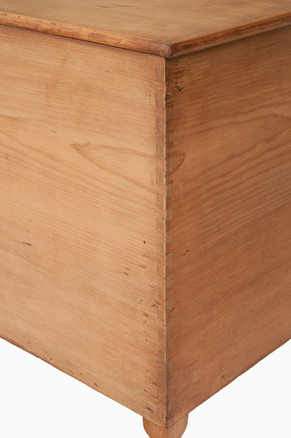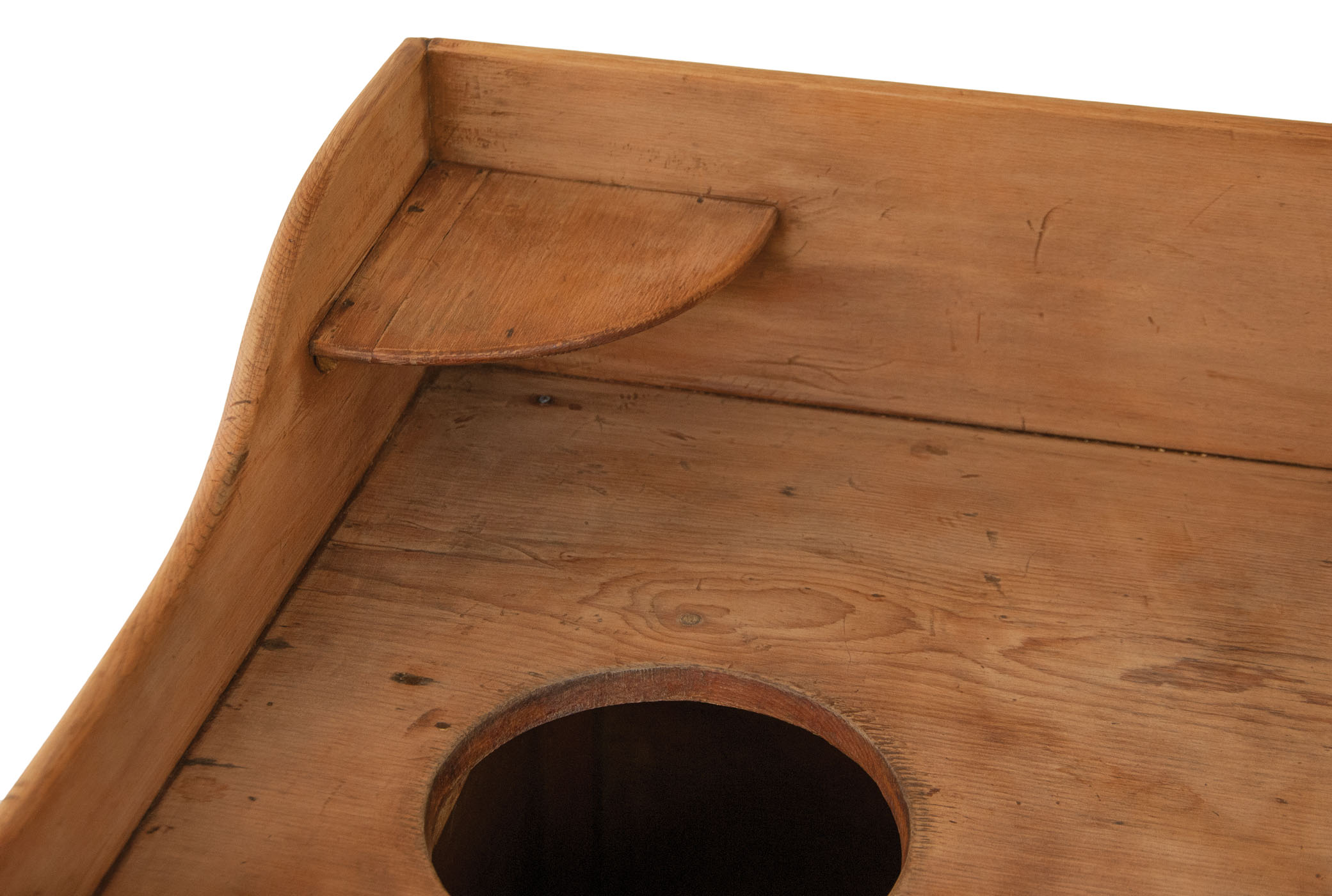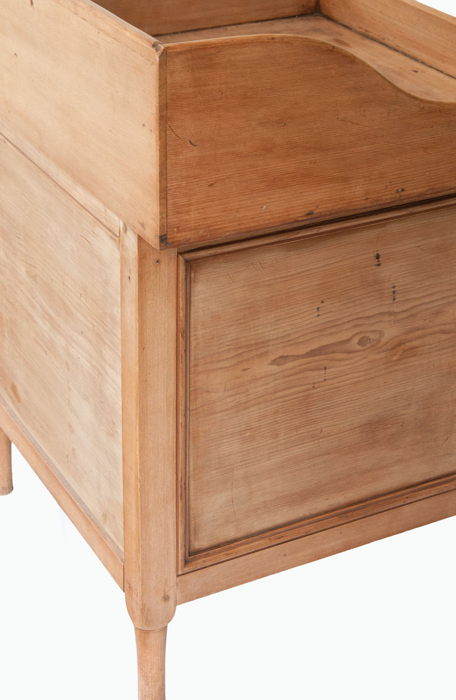 Pine, refinished (this was originally painted chrome yellow), top with shaped sides, raised front and backsplash, circular cutout for wash bowl, and a corner shelf on left side, above an inset panel door with applied molding, through mortise and double diagonal pegged, paneled ends with applied molding, all on a turned leg, with unique pine attached blanket box with single breadboard lid (25 1/2″ h, 27 3/4″ l, 20 1/2″ d), supported on turned legs, (original painted red on interior), chamfered interior corner extensions develop into the turned feet, finely dovetailed construction on right side, c. 1840-1850, 32″ h (wash stand), 51 1/2″ l (overall), 21″ d.