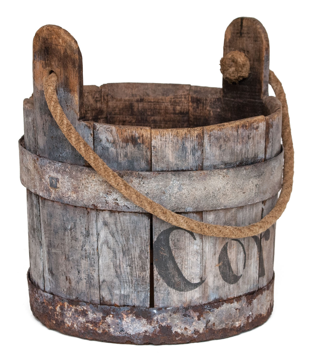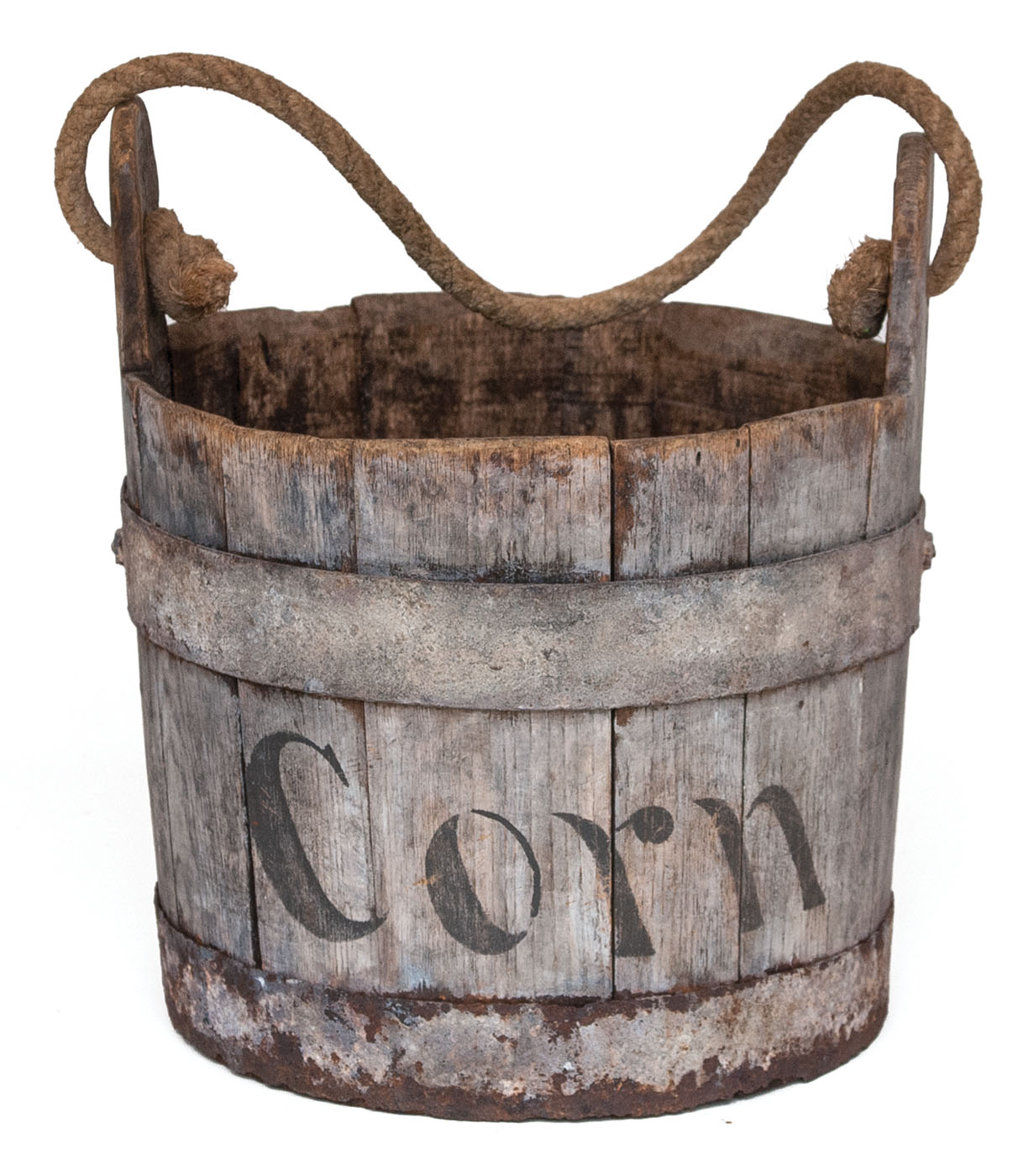 Oak, old gray wash finish, two heavy iron bands riveted, tall extended ears with early handmade rope handle, originally a water pail, and reused as a corn carrier, marked “CORN” on side, c. 1820-40, 11″ h (to top of ear), 10″ dia.